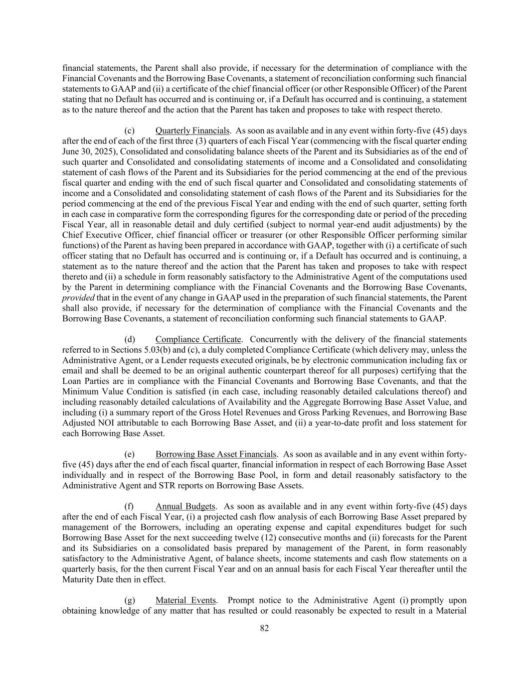 82 financial statements, the Parent shall also provide, if necessary for the determination of compliance with the Financial Covenants and the Borrowing Base Covenants, a statement of reconciliation conforming such financial statements to GAAP and (ii) a certificate of the chief financial officer (or other Responsible Officer) of the Parent stating that no Default has occurred and is continuing or, if a Default has occurred and is continuing, a statement as to the nature thereof and the action that the Parent has taken and proposes to take with respect thereto. (c) Quarterly Financials. As soon as available and in any event within forty-five (45) days after the end of each of the first three (3) quarters of each Fiscal Year (commencing with the fiscal quarter ending June 30, 2025), Consolidated and consolidating balance sheets of the Parent and its Subsidiaries as of the end of such quarter and Consolidated and consolidating statements of income and a Consolidated and consolidating statement of cash flows of the Parent and its Subsidiaries for the period commencing at the end of the previous fiscal quarter and ending with the end of such fiscal quarter and Consolidated and consolidating statements of income and a Consolidated and consolidating statement of cash flows of the Parent and its Subsidiaries for the period commencing at the end of the previous Fiscal Year and ending with the end of such quarter, setting forth in each case in comparative form the corresponding figures for the corresponding date or period of the preceding Fiscal Year, all in reasonable detail and duly certified (subject to normal year-end audit adjustments) by the Chief Executive Officer, chief financial officer or treasurer (or other Responsible Officer performing similar functions) of the Parent as having been prepared in accordance with GAAP, together with (i) a certificate of such officer stating that no Default has occurred and is continuing or, if a Default has occurred and is continuing, a statement as to the nature thereof and the action that the Parent has taken and proposes to take with respect thereto and (ii) a schedule in form reasonably satisfactory to the Administrative Agent of the computations used by the Parent in determining compliance with the Financial Covenants and the Borrowing Base Covenants, provided that in the event of any change in GAAP used in the preparation of such financial statements, the Parent shall also provide, if necessary for the determination of compliance with the Financial Covenants and the Borrowing Base Covenants, a statement of reconciliation conforming such financial statements to GAAP. (d) Compliance Certificate. Concurrently with the delivery of the financial statements referred to in Sections 5.03(b) and (c), a duly completed Compliance Certificate (which delivery may, unless the Administrative Agent, or a Lender requests executed originals, be by electronic communication including fax or email and shall be deemed to be an original authentic counterpart thereof for all purposes) certifying that the Loan Parties are in compliance with the Financial Covenants and Borrowing Base Covenants, and that the Minimum Value Condition is satisfied (in each case, including reasonably detailed calculations thereof) and including reasonably detailed calculations of Availability and the Aggregate Borrowing Base Asset Value, and including (i) a summary report of the Gross Hotel Revenues and Gross Parking Revenues, and Borrowing Base Adjusted NOI attributable to each Borrowing Base Asset, and (ii) a year-to-date profit and loss statement for each Borrowing Base Asset. (e) Borrowing Base Asset Financials. As soon as available and in any event within forty- five (45) days after the end of each fiscal quarter, financial information in respect of each Borrowing Base Asset individually and in respect of the Borrowing Base Pool, in form and detail reasonably satisfactory to the Administrative Agent and STR reports on Borrowing Base Assets. (f) Annual Budgets. As soon as available and in any event within forty-five (45) days after the end of each Fiscal Year, (i) a projected cash flow analysis of each Borrowing Base Asset prepared by management of the Borrowers, including an operating expense and capital expenditures budget for such Borrowing Base Asset for the next succeeding twelve (12) consecutive months and (ii) forecasts for the Parent and its Subsidiaries on a consolidated basis prepared by management of the Parent, in form reasonably satisfactory to the Administrative Agent, of balance sheets, income statements and cash flow statements on a quarterly basis, for the then current Fiscal Year and on an annual basis for each Fiscal Year thereafter until the Maturity Date then in effect. (g) Material Events. Prompt notice to the Administrative Agent (i) promptly upon obtaining knowledge of any matter that has resulted or could reasonably be expected to result in a Material
