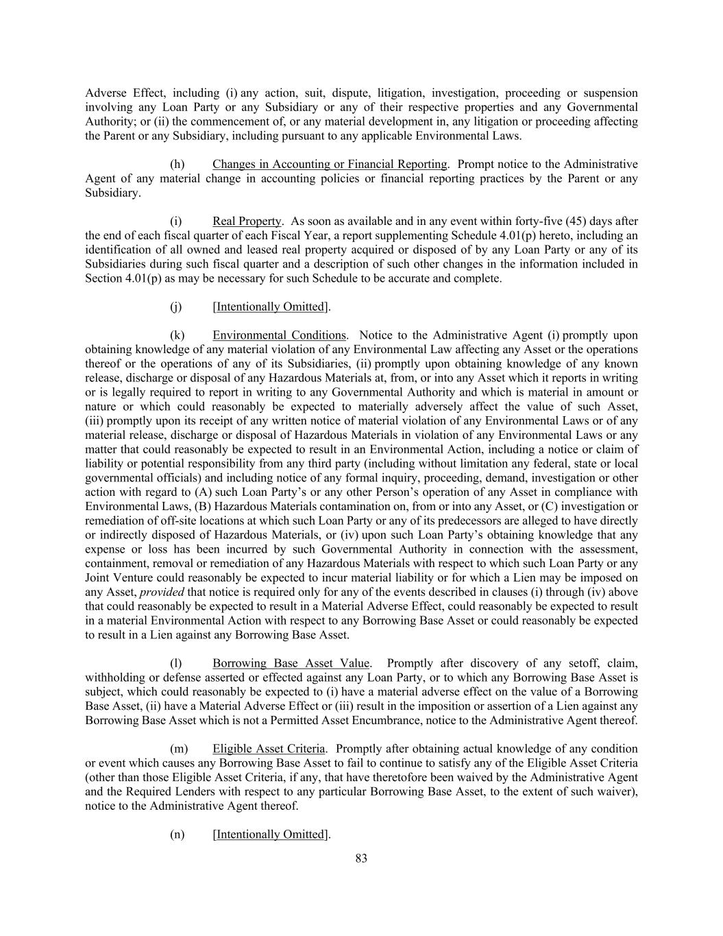 83 Adverse Effect, including (i) any action, suit, dispute, litigation, investigation, proceeding or suspension involving any Loan Party or any Subsidiary or any of their respective properties and any Governmental Authority; or (ii) the commencement of, or any material development in, any litigation or proceeding affecting the Parent or any Subsidiary, including pursuant to any applicable Environmental Laws. (h) Changes in Accounting or Financial Reporting. Prompt notice to the Administrative Agent of any material change in accounting policies or financial reporting practices by the Parent or any Subsidiary. (i) Real Property. As soon as available and in any event within forty-five (45) days after the end of each fiscal quarter of each Fiscal Year, a report supplementing Schedule 4.01(p) hereto, including an identification of all owned and leased real property acquired or disposed of by any Loan Party or any of its Subsidiaries during such fiscal quarter and a description of such other changes in the information included in Section 4.01(p) as may be necessary for such Schedule to be accurate and complete. (j) [Intentionally Omitted]. (k) Environmental Conditions. Notice to the Administrative Agent (i) promptly upon obtaining knowledge of any material violation of any Environmental Law affecting any Asset or the operations thereof or the operations of any of its Subsidiaries, (ii) promptly upon obtaining knowledge of any known release, discharge or disposal of any Hazardous Materials at, from, or into any Asset which it reports in writing or is legally required to report in writing to any Governmental Authority and which is material in amount or nature or which could reasonably be expected to materially adversely affect the value of such Asset, (iii) promptly upon its receipt of any written notice of material violation of any Environmental Laws or of any material release, discharge or disposal of Hazardous Materials in violation of any Environmental Laws or any matter that could reasonably be expected to result in an Environmental Action, including a notice or claim of liability or potential responsibility from any third party (including without limitation any federal, state or local governmental officials) and including notice of any formal inquiry, proceeding, demand, investigation or other action with regard to (A) such Loan Party’s or any other Person’s operation of any Asset in compliance with Environmental Laws, (B) Hazardous Materials contamination on, from or into any Asset, or (C) investigation or remediation of off-site locations at which such Loan Party or any of its predecessors are alleged to have directly or indirectly disposed of Hazardous Materials, or (iv) upon such Loan Party’s obtaining knowledge that any expense or loss has been incurred by such Governmental Authority in connection with the assessment, containment, removal or remediation of any Hazardous Materials with respect to which such Loan Party or any Joint Venture could reasonably be expected to incur material liability or for which a Lien may be imposed on any Asset, provided that notice is required only for any of the events described in clauses (i) through (iv) above that could reasonably be expected to result in a Material Adverse Effect, could reasonably be expected to result in a material Environmental Action with respect to any Borrowing Base Asset or could reasonably be expected to result in a Lien against any Borrowing Base Asset. (l) Borrowing Base Asset Value. Promptly after discovery of any setoff, claim, withholding or defense asserted or effected against any Loan Party, or to which any Borrowing Base Asset is subject, which could reasonably be expected to (i) have a material adverse effect on the value of a Borrowing Base Asset, (ii) have a Material Adverse Effect or (iii) result in the imposition or assertion of a Lien against any Borrowing Base Asset which is not a Permitted Asset Encumbrance, notice to the Administrative Agent thereof. (m) Eligible Asset Criteria. Promptly after obtaining actual knowledge of any condition or event which causes any Borrowing Base Asset to fail to continue to satisfy any of the Eligible Asset Criteria (other than those Eligible Asset Criteria, if any, that have theretofore been waived by the Administrative Agent and the Required Lenders with respect to any particular Borrowing Base Asset, to the extent of such waiver), notice to the Administrative Agent thereof. (n) [Intentionally Omitted].
