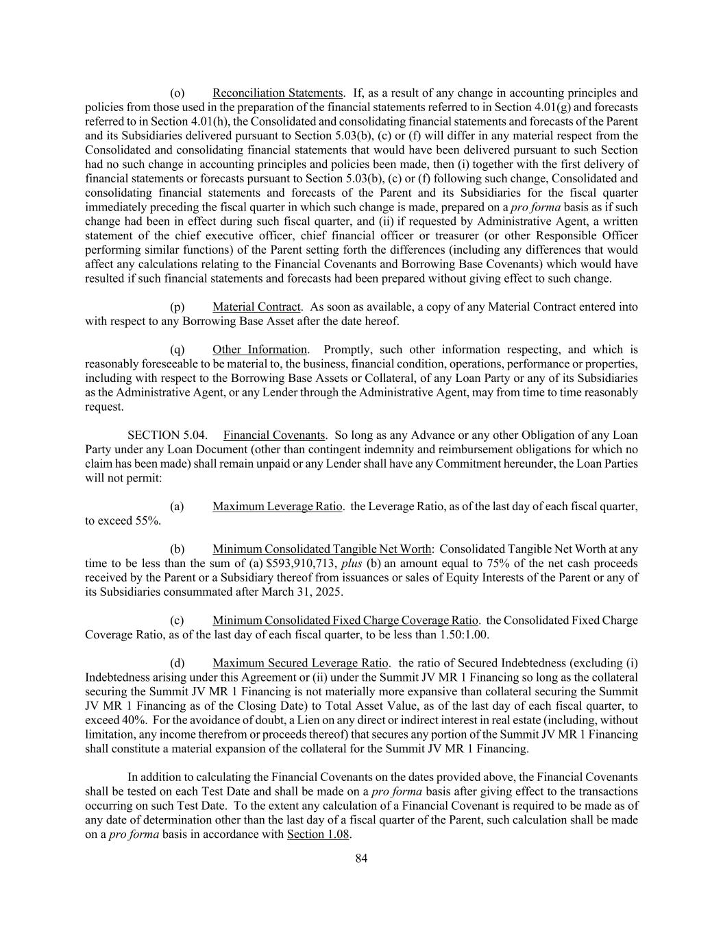 84 (o) Reconciliation Statements. If, as a result of any change in accounting principles and policies from those used in the preparation of the financial statements referred to in Section 4.01(g) and forecasts referred to in Section 4.01(h), the Consolidated and consolidating financial statements and forecasts of the Parent and its Subsidiaries delivered pursuant to Section 5.03(b), (c) or (f) will differ in any material respect from the Consolidated and consolidating financial statements that would have been delivered pursuant to such Section had no such change in accounting principles and policies been made, then (i) together with the first delivery of financial statements or forecasts pursuant to Section 5.03(b), (c) or (f) following such change, Consolidated and consolidating financial statements and forecasts of the Parent and its Subsidiaries for the fiscal quarter immediately preceding the fiscal quarter in which such change is made, prepared on a pro forma basis as if such change had been in effect during such fiscal quarter, and (ii) if requested by Administrative Agent, a written statement of the chief executive officer, chief financial officer or treasurer (or other Responsible Officer performing similar functions) of the Parent setting forth the differences (including any differences that would affect any calculations relating to the Financial Covenants and Borrowing Base Covenants) which would have resulted if such financial statements and forecasts had been prepared without giving effect to such change. (p) Material Contract. As soon as available, a copy of any Material Contract entered into with respect to any Borrowing Base Asset after the date hereof. (q) Other Information. Promptly, such other information respecting, and which is reasonably foreseeable to be material to, the business, financial condition, operations, performance or properties, including with respect to the Borrowing Base Assets or Collateral, of any Loan Party or any of its Subsidiaries as the Administrative Agent, or any Lender through the Administrative Agent, may from time to time reasonably request. SECTION 5.04. Financial Covenants. So long as any Advance or any other Obligation of any Loan Party under any Loan Document (other than contingent indemnity and reimbursement obligations for which no claim has been made) shall remain unpaid or any Lender shall have any Commitment hereunder, the Loan Parties will not permit: (a) Maximum Leverage Ratio. the Leverage Ratio, as of the last day of each fiscal quarter, to exceed 55%. (b) Minimum Consolidated Tangible Net Worth: Consolidated Tangible Net Worth at any time to be less than the sum of (a) $593,910,713, plus (b) an amount equal to 75% of the net cash proceeds received by the Parent or a Subsidiary thereof from issuances or sales of Equity Interests of the Parent or any of its Subsidiaries consummated after March 31, 2025. (c) Minimum Consolidated Fixed Charge Coverage Ratio. the Consolidated Fixed Charge Coverage Ratio, as of the last day of each fiscal quarter, to be less than 1.50:1.00. (d) Maximum Secured Leverage Ratio. the ratio of Secured Indebtedness (excluding (i) Indebtedness arising under this Agreement or (ii) under the Summit JV MR 1 Financing so long as the collateral securing the Summit JV MR 1 Financing is not materially more expansive than collateral securing the Summit JV MR 1 Financing as of the Closing Date) to Total Asset Value, as of the last day of each fiscal quarter, to exceed 40%. For the avoidance of doubt, a Lien on any direct or indirect interest in real estate (including, without limitation, any income therefrom or proceeds thereof) that secures any portion of the Summit JV MR 1 Financing shall constitute a material expansion of the collateral for the Summit JV MR 1 Financing. In addition to calculating the Financial Covenants on the dates provided above, the Financial Covenants shall be tested on each Test Date and shall be made on a pro forma basis after giving effect to the transactions occurring on such Test Date. To the extent any calculation of a Financial Covenant is required to be made as of any date of determination other than the last day of a fiscal quarter of the Parent, such calculation shall be made on a pro forma basis in accordance with Section 1.08.
