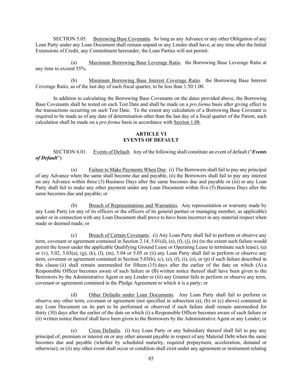 85 SECTION 5.05. Borrowing Base Covenants. So long as any Advance or any other Obligation of any Loan Party under any Loan Document shall remain unpaid or any Lender shall have, at any time after the Initial Extensions of Credit, any Commitment hereunder, the Loan Parties will not permit: (a) Maximum Borrowing Base Leverage Ratio. the Borrowing Base Leverage Ratio at any time to exceed 55%. (b) Minimum Borrowing Base Interest Coverage Ratio. the Borrowing Base Interest Coverage Ratio, as of the last day of each fiscal quarter, to be less than 1.50:1.00. In addition to calculating the Borrowing Base Covenants on the dates provided above, the Borrowing Base Covenants shall be tested on each Test Date and shall be made on a pro forma basis after giving effect to the transactions occurring on such Test Date. To the extent any calculation of a Borrowing Base Covenant is required to be made as of any date of determination other than the last day of a fiscal quarter of the Parent, such calculation shall be made on a pro forma basis in accordance with Section 1.08. ARTICLE VI EVENTS OF DEFAULT SECTION 6.01. Events of Default. Any of the following shall constitute an event of default (“Events of Default”): (a) Failure to Make Payments When Due. (i) The Borrowers shall fail to pay any principal of any Advance when the same shall become due and payable, (ii) the Borrowers shall fail to pay any interest on any Advance within three (3) Business Days after the same becomes due and payable or (iii) or any Loan Party shall fail to make any other payment under any Loan Document within five (5) Business Days after the same becomes due and payable; or (b) Breach of Representations and Warranties. Any representation or warranty made by any Loan Party (or any of its officers or the officers of its general partner or managing member, as applicable) under or in connection with any Loan Document shall prove to have been incorrect in any material respect when made or deemed made; or (c) Breach of Certain Covenants. (i) Any Loan Party shall fail to perform or observe any term, covenant or agreement contained in Section 2.14, 5.01(d), (e), (f), (j), (n) (to the extent such failure would permit the lessor under the applicable Qualifying Ground Lease or Operating Lease to terminate such lease), (u) or (v), 5.02, 5.03(a), (g), (k), (l), (m), 5.04 or 5.05 or (ii) any Loan Party shall fail to perform or observe any term, covenant or agreement contained in Section 5.03(b), (c), (e), (f), (i), (o), or (p) if such failure described in this clause (ii) shall remain unremedied for fifteen (15) days after the earlier of the date on which (A) a Responsible Officer becomes aware of such failure or (B) written notice thereof shall have been given to the Borrowers by the Administrative Agent or any Lender or (iii) any Grantor fails to perform or observe any term, covenant or agreement contained in the Pledge Agreement to which it is a party; or (d) Other Defaults under Loan Documents. Any Loan Party shall fail to perform or observe any other term, covenant or agreement (not specified in subsection (a), (b) or (c) above) contained in any Loan Document on its part to be performed or observed if such failure shall remain unremedied for thirty (30) days after the earlier of the date on which (i) a Responsible Officer becomes aware of such failure or (ii) written notice thereof shall have been given to the Borrowers by the Administrative Agent or any Lender; or (e) Cross Defaults. (i) Any Loan Party or any Subsidiary thereof shall fail to pay any principal of, premium or interest on or any other amount payable in respect of any Material Debt when the same becomes due and payable (whether by scheduled maturity, required prepayment, acceleration, demand or otherwise); or (ii) any other event shall occur or condition shall exist under any agreement or instrument relating