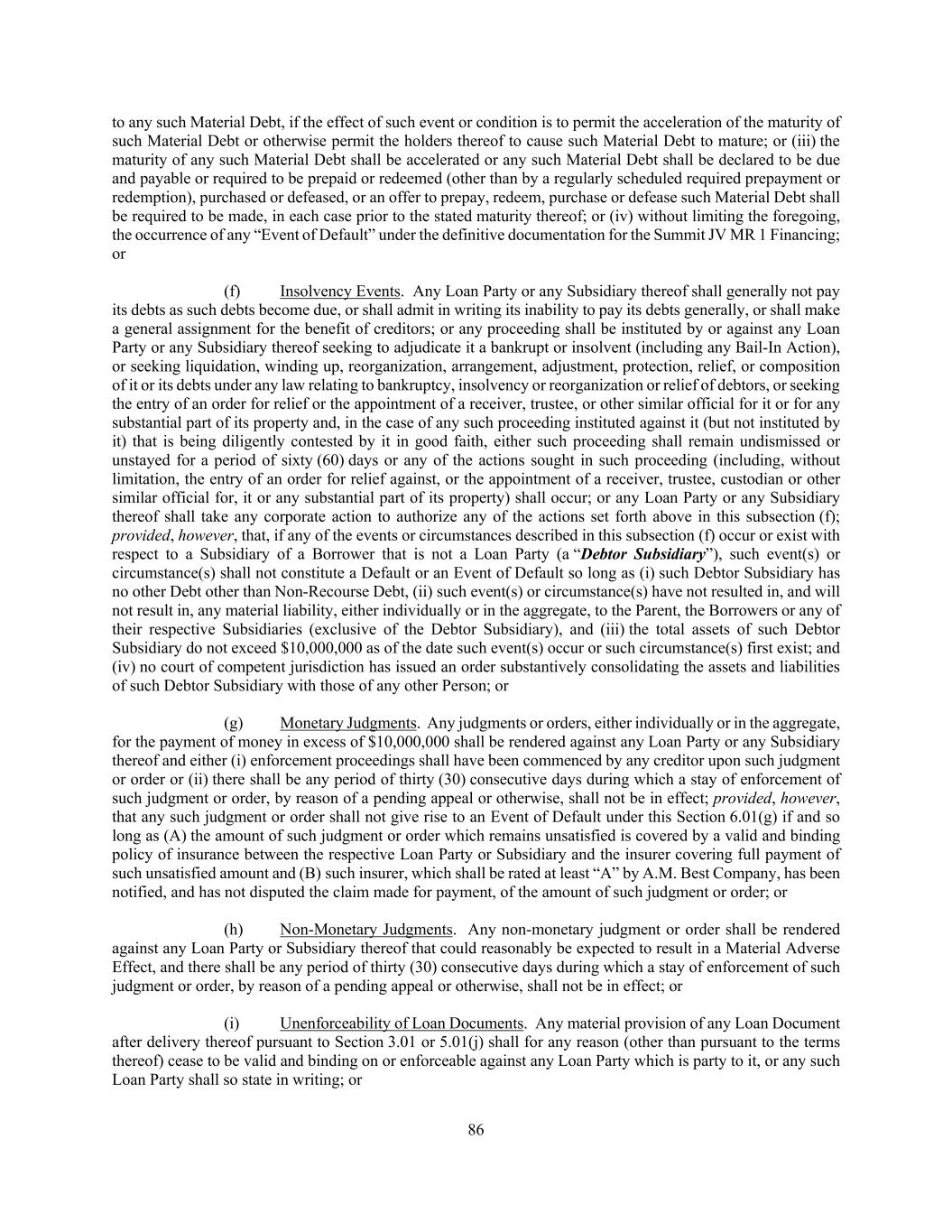 86 to any such Material Debt, if the effect of such event or condition is to permit the acceleration of the maturity of such Material Debt or otherwise permit the holders thereof to cause such Material Debt to mature; or (iii) the maturity of any such Material Debt shall be accelerated or any such Material Debt shall be declared to be due and payable or required to be prepaid or redeemed (other than by a regularly scheduled required prepayment or redemption), purchased or defeased, or an offer to prepay, redeem, purchase or defease such Material Debt shall be required to be made, in each case prior to the stated maturity thereof; or (iv) without limiting the foregoing, the occurrence of any “Event of Default” under the definitive documentation for the Summit JV MR 1 Financing; or (f) Insolvency Events. Any Loan Party or any Subsidiary thereof shall generally not pay its debts as such debts become due, or shall admit in writing its inability to pay its debts generally, or shall make a general assignment for the benefit of creditors; or any proceeding shall be instituted by or against any Loan Party or any Subsidiary thereof seeking to adjudicate it a bankrupt or insolvent (including any Bail-In Action), or seeking liquidation, winding up, reorganization, arrangement, adjustment, protection, relief, or composition of it or its debts under any law relating to bankruptcy, insolvency or reorganization or relief of debtors, or seeking the entry of an order for relief or the appointment of a receiver, trustee, or other similar official for it or for any substantial part of its property and, in the case of any such proceeding instituted against it (but not instituted by it) that is being diligently contested by it in good faith, either such proceeding shall remain undismissed or unstayed for a period of sixty (60) days or any of the actions sought in such proceeding (including, without limitation, the entry of an order for relief against, or the appointment of a receiver, trustee, custodian or other similar official for, it or any substantial part of its property) shall occur; or any Loan Party or any Subsidiary thereof shall take any corporate action to authorize any of the actions set forth above in this subsection (f); provided, however, that, if any of the events or circumstances described in this subsection (f) occur or exist with respect to a Subsidiary of a Borrower that is not a Loan Party (a “Debtor Subsidiary”), such event(s) or circumstance(s) shall not constitute a Default or an Event of Default so long as (i) such Debtor Subsidiary has no other Debt other than Non-Recourse Debt, (ii) such event(s) or circumstance(s) have not resulted in, and will not result in, any material liability, either individually or in the aggregate, to the Parent, the Borrowers or any of their respective Subsidiaries (exclusive of the Debtor Subsidiary), and (iii) the total assets of such Debtor Subsidiary do not exceed $10,000,000 as of the date such event(s) occur or such circumstance(s) first exist; and (iv) no court of competent jurisdiction has issued an order substantively consolidating the assets and liabilities of such Debtor Subsidiary with those of any other Person; or (g) Monetary Judgments. Any judgments or orders, either individually or in the aggregate, for the payment of money in excess of $10,000,000 shall be rendered against any Loan Party or any Subsidiary thereof and either (i) enforcement proceedings shall have been commenced by any creditor upon such judgment or order or (ii) there shall be any period of thirty (30) consecutive days during which a stay of enforcement of such judgment or order, by reason of a pending appeal or otherwise, shall not be in effect; provided, however, that any such judgment or order shall not give rise to an Event of Default under this Section 6.01(g) if and so long as (A) the amount of such judgment or order which remains unsatisfied is covered by a valid and binding policy of insurance between the respective Loan Party or Subsidiary and the insurer covering full payment of such unsatisfied amount and (B) such insurer, which shall be rated at least “A” by A.M. Best Company, has been notified, and has not disputed the claim made for payment, of the amount of such judgment or order; or (h) Non-Monetary Judgments. Any non-monetary judgment or order shall be rendered against any Loan Party or Subsidiary thereof that could reasonably be expected to result in a Material Adverse Effect, and there shall be any period of thirty (30) consecutive days during which a stay of enforcement of such judgment or order, by reason of a pending appeal or otherwise, shall not be in effect; or (i) Unenforceability of Loan Documents. Any material provision of any Loan Document after delivery thereof pursuant to Section 3.01 or 5.01(j) shall for any reason (other than pursuant to the terms thereof) cease to be valid and binding on or enforceable against any Loan Party which is party to it, or any such Loan Party shall so state in writing; or