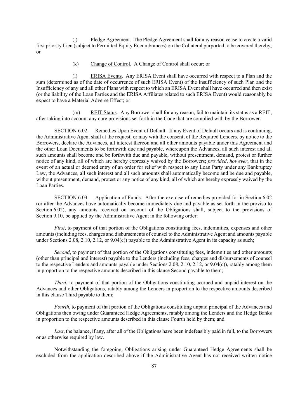 87 (j) Pledge Agreement. The Pledge Agreement shall for any reason cease to create a valid first priority Lien (subject to Permitted Equity Encumbrances) on the Collateral purported to be covered thereby; or (k) Change of Control. A Change of Control shall occur; or (l) ERISA Events. Any ERISA Event shall have occurred with respect to a Plan and the sum (determined as of the date of occurrence of such ERISA Event) of the Insufficiency of such Plan and the Insufficiency of any and all other Plans with respect to which an ERISA Event shall have occurred and then exist (or the liability of the Loan Parties and the ERISA Affiliates related to such ERISA Event) would reasonably be expect to have a Material Adverse Effect; or (m) REIT Status. Any Borrower shall for any reason, fail to maintain its status as a REIT, after taking into account any cure provisions set forth in the Code that are complied with by the Borrower. SECTION 6.02. Remedies Upon Event of Default. If any Event of Default occurs and is continuing, the Administrative Agent shall at the request, or may with the consent, of the Required Lenders, by notice to the Borrowers, declare the Advances, all interest thereon and all other amounts payable under this Agreement and the other Loan Documents to be forthwith due and payable, whereupon the Advances, all such interest and all such amounts shall become and be forthwith due and payable, without presentment, demand, protest or further notice of any kind, all of which are hereby expressly waived by the Borrowers; provided, however, that in the event of an actual or deemed entry of an order for relief with respect to any Loan Party under any Bankruptcy Law, the Advances, all such interest and all such amounts shall automatically become and be due and payable, without presentment, demand, protest or any notice of any kind, all of which are hereby expressly waived by the Loan Parties. SECTION 6.03. Application of Funds. After the exercise of remedies provided for in Section 6.02 (or after the Advances have automatically become immediately due and payable as set forth in the proviso to Section 6.02), any amounts received on account of the Obligations shall, subject to the provisions of Section 9.10, be applied by the Administrative Agent in the following order: First, to payment of that portion of the Obligations constituting fees, indemnities, expenses and other amounts (including fees, charges and disbursements of counsel to the Administrative Agent and amounts payable under Sections 2.08, 2.10, 2.12, or 9.04(c)) payable to the Administrative Agent in its capacity as such; Second, to payment of that portion of the Obligations constituting fees, indemnities and other amounts (other than principal and interest) payable to the Lenders (including fees, charges and disbursements of counsel to the respective Lenders and amounts payable under Sections 2.08, 2.10, 2.12, or 9.04(c)), ratably among them in proportion to the respective amounts described in this clause Second payable to them; Third, to payment of that portion of the Obligations constituting accrued and unpaid interest on the Advances and other Obligations, ratably among the Lenders in proportion to the respective amounts described in this clause Third payable to them; Fourth, to payment of that portion of the Obligations constituting unpaid principal of the Advances and Obligations then owing under Guaranteed Hedge Agreements, ratably among the Lenders and the Hedge Banks in proportion to the respective amounts described in this clause Fourth held by them; and Last, the balance, if any, after all of the Obligations have been indefeasibly paid in full, to the Borrowers or as otherwise required by law. Notwithstanding the foregoing, Obligations arising under Guaranteed Hedge Agreements shall be excluded from the application described above if the Administrative Agent has not received written notice