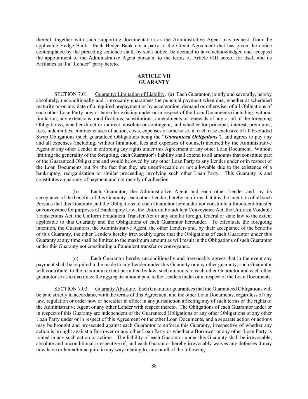 88 thereof, together with such supporting documentation as the Administrative Agent may request, from the applicable Hedge Bank. Each Hedge Bank not a party to the Credit Agreement that has given the notice contemplated by the preceding sentence shall, by such notice, be deemed to have acknowledged and accepted the appointment of the Administrative Agent pursuant to the terms of Article VIII hereof for itself and its Affiliates as if a “Lender” party hereto. ARTICLE VII GUARANTY SECTION 7.01. Guaranty; Limitation of Liability. (a) Each Guarantor, jointly and severally, hereby absolutely, unconditionally and irrevocably guarantees the punctual payment when due, whether at scheduled maturity or on any date of a required prepayment or by acceleration, demand or otherwise, of all Obligations of each other Loan Party now or hereafter existing under or in respect of the Loan Documents (including, without limitation, any extensions, modifications, substitutions, amendments or renewals of any or all of the foregoing Obligations), whether direct or indirect, absolute or contingent, and whether for principal, interest, premiums, fees, indemnities, contract causes of action, costs, expenses or otherwise, in each case exclusive of all Excluded Swap Obligations (such guaranteed Obligations being the “Guaranteed Obligations”), and agrees to pay any and all expenses (including, without limitation, fees and expenses of counsel) incurred by the Administrative Agent or any other Lender in enforcing any rights under this Agreement or any other Loan Document. Without limiting the generality of the foregoing, each Guarantor’s liability shall extend to all amounts that constitute part of the Guaranteed Obligations and would be owed by any other Loan Party to any Lender under or in respect of the Loan Documents but for the fact that they are unenforceable or not allowable due to the existence of a bankruptcy, reorganization or similar proceeding involving such other Loan Party. This Guaranty is and constitutes a guaranty of payment and not merely of collection. (b) Each Guarantor, the Administrative Agent and each other Lender and, by its acceptance of the benefits of this Guaranty, each other Lender, hereby confirms that it is the intention of all such Persons that this Guaranty and the Obligations of each Guarantor hereunder not constitute a fraudulent transfer or conveyance for purposes of Bankruptcy Law, the Uniform Fraudulent Conveyance Act, the Uniform Voidable Transactions Act, the Uniform Fraudulent Transfer Act or any similar foreign, federal or state law to the extent applicable to this Guaranty and the Obligations of each Guarantor hereunder. To effectuate the foregoing intention, the Guarantors, the Administrative Agent, the other Lenders and, by their acceptance of the benefits of this Guaranty, the other Lenders hereby irrevocably agree that the Obligations of each Guarantor under this Guaranty at any time shall be limited to the maximum amount as will result in the Obligations of such Guarantor under this Guaranty not constituting a fraudulent transfer or conveyance. (c) Each Guarantor hereby unconditionally and irrevocably agrees that in the event any payment shall be required to be made to any Lender under this Guaranty or any other guaranty, such Guarantor will contribute, to the maximum extent permitted by law, such amounts to each other Guarantor and each other guarantor so as to maximize the aggregate amount paid to the Lenders under or in respect of the Loan Documents. SECTION 7.02. Guaranty Absolute. Each Guarantor guarantees that the Guaranteed Obligations will be paid strictly in accordance with the terms of this Agreement and the other Loan Documents, regardless of any law, regulation or order now or hereafter in effect in any jurisdiction affecting any of such terms or the rights of the Administrative Agent or any other Lender with respect thereto. The Obligations of each Guarantor under or in respect of this Guaranty are independent of the Guaranteed Obligations or any other Obligations of any other Loan Party under or in respect of this Agreement or the other Loan Documents, and a separate action or actions may be brought and prosecuted against each Guarantor to enforce this Guaranty, irrespective of whether any action is brought against a Borrower or any other Loan Party or whether a Borrower or any other Loan Party is joined in any such action or actions. The liability of each Guarantor under this Guaranty shall be irrevocable, absolute and unconditional irrespective of, and each Guarantor hereby irrevocably waives any defenses it may now have or hereafter acquire in any way relating to, any or all of the following: