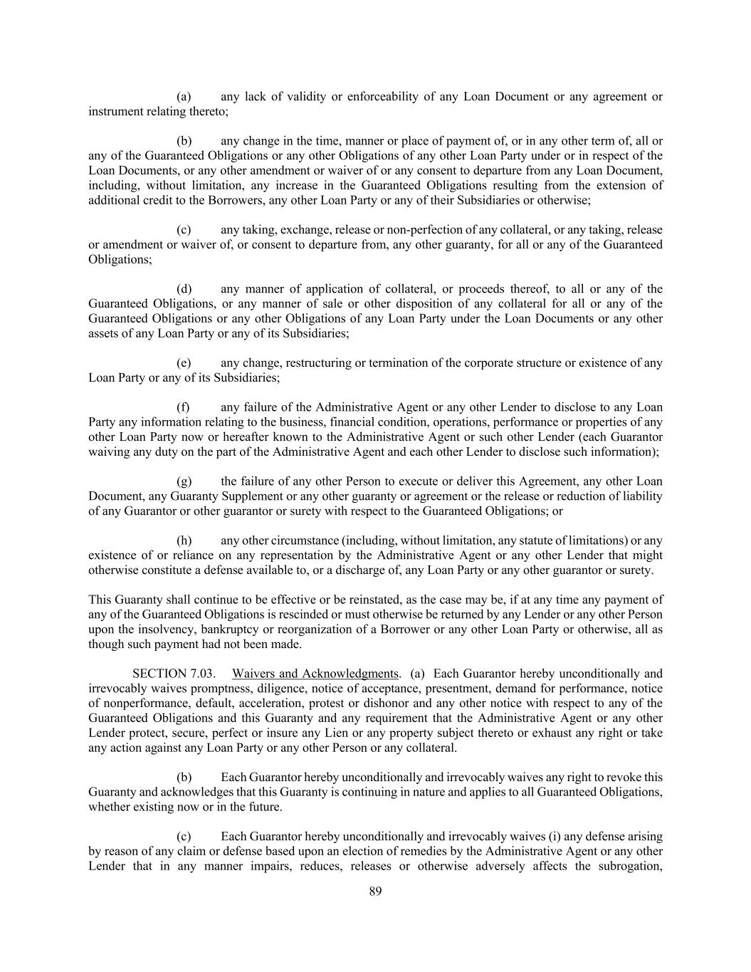 89 (a) any lack of validity or enforceability of any Loan Document or any agreement or instrument relating thereto; (b) any change in the time, manner or place of payment of, or in any other term of, all or any of the Guaranteed Obligations or any other Obligations of any other Loan Party under or in respect of the Loan Documents, or any other amendment or waiver of or any consent to departure from any Loan Document, including, without limitation, any increase in the Guaranteed Obligations resulting from the extension of additional credit to the Borrowers, any other Loan Party or any of their Subsidiaries or otherwise; (c) any taking, exchange, release or non-perfection of any collateral, or any taking, release or amendment or waiver of, or consent to departure from, any other guaranty, for all or any of the Guaranteed Obligations; (d) any manner of application of collateral, or proceeds thereof, to all or any of the Guaranteed Obligations, or any manner of sale or other disposition of any collateral for all or any of the Guaranteed Obligations or any other Obligations of any Loan Party under the Loan Documents or any other assets of any Loan Party or any of its Subsidiaries; (e) any change, restructuring or termination of the corporate structure or existence of any Loan Party or any of its Subsidiaries; (f) any failure of the Administrative Agent or any other Lender to disclose to any Loan Party any information relating to the business, financial condition, operations, performance or properties of any other Loan Party now or hereafter known to the Administrative Agent or such other Lender (each Guarantor waiving any duty on the part of the Administrative Agent and each other Lender to disclose such information); (g) the failure of any other Person to execute or deliver this Agreement, any other Loan Document, any Guaranty Supplement or any other guaranty or agreement or the release or reduction of liability of any Guarantor or other guarantor or surety with respect to the Guaranteed Obligations; or (h) any other circumstance (including, without limitation, any statute of limitations) or any existence of or reliance on any representation by the Administrative Agent or any other Lender that might otherwise constitute a defense available to, or a discharge of, any Loan Party or any other guarantor or surety. This Guaranty shall continue to be effective or be reinstated, as the case may be, if at any time any payment of any of the Guaranteed Obligations is rescinded or must otherwise be returned by any Lender or any other Person upon the insolvency, bankruptcy or reorganization of a Borrower or any other Loan Party or otherwise, all as though such payment had not been made. SECTION 7.03. Waivers and Acknowledgments. (a) Each Guarantor hereby unconditionally and irrevocably waives promptness, diligence, notice of acceptance, presentment, demand for performance, notice of nonperformance, default, acceleration, protest or dishonor and any other notice with respect to any of the Guaranteed Obligations and this Guaranty and any requirement that the Administrative Agent or any other Lender protect, secure, perfect or insure any Lien or any property subject thereto or exhaust any right or take any action against any Loan Party or any other Person or any collateral. (b) Each Guarantor hereby unconditionally and irrevocably waives any right to revoke this Guaranty and acknowledges that this Guaranty is continuing in nature and applies to all Guaranteed Obligations, whether existing now or in the future. (c) Each Guarantor hereby unconditionally and irrevocably waives (i) any defense arising by reason of any claim or defense based upon an election of remedies by the Administrative Agent or any other Lender that in any manner impairs, reduces, releases or otherwise adversely affects the subrogation,