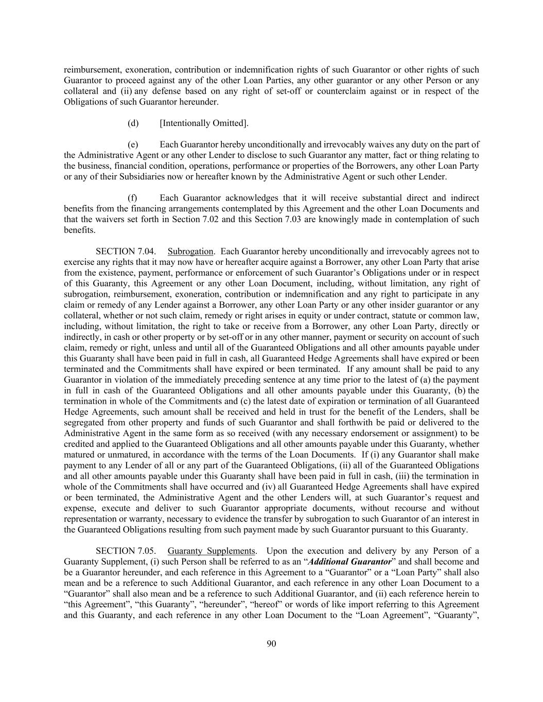 90 reimbursement, exoneration, contribution or indemnification rights of such Guarantor or other rights of such Guarantor to proceed against any of the other Loan Parties, any other guarantor or any other Person or any collateral and (ii) any defense based on any right of set-off or counterclaim against or in respect of the Obligations of such Guarantor hereunder. (d) [Intentionally Omitted]. (e) Each Guarantor hereby unconditionally and irrevocably waives any duty on the part of the Administrative Agent or any other Lender to disclose to such Guarantor any matter, fact or thing relating to the business, financial condition, operations, performance or properties of the Borrowers, any other Loan Party or any of their Subsidiaries now or hereafter known by the Administrative Agent or such other Lender. (f) Each Guarantor acknowledges that it will receive substantial direct and indirect benefits from the financing arrangements contemplated by this Agreement and the other Loan Documents and that the waivers set forth in Section 7.02 and this Section 7.03 are knowingly made in contemplation of such benefits. SECTION 7.04. Subrogation. Each Guarantor hereby unconditionally and irrevocably agrees not to exercise any rights that it may now have or hereafter acquire against a Borrower, any other Loan Party that arise from the existence, payment, performance or enforcement of such Guarantor’s Obligations under or in respect of this Guaranty, this Agreement or any other Loan Document, including, without limitation, any right of subrogation, reimbursement, exoneration, contribution or indemnification and any right to participate in any claim or remedy of any Lender against a Borrower, any other Loan Party or any other insider guarantor or any collateral, whether or not such claim, remedy or right arises in equity or under contract, statute or common law, including, without limitation, the right to take or receive from a Borrower, any other Loan Party, directly or indirectly, in cash or other property or by set-off or in any other manner, payment or security on account of such claim, remedy or right, unless and until all of the Guaranteed Obligations and all other amounts payable under this Guaranty shall have been paid in full in cash, all Guaranteed Hedge Agreements shall have expired or been terminated and the Commitments shall have expired or been terminated. If any amount shall be paid to any Guarantor in violation of the immediately preceding sentence at any time prior to the latest of (a) the payment in full in cash of the Guaranteed Obligations and all other amounts payable under this Guaranty, (b) the termination in whole of the Commitments and (c) the latest date of expiration or termination of all Guaranteed Hedge Agreements, such amount shall be received and held in trust for the benefit of the Lenders, shall be segregated from other property and funds of such Guarantor and shall forthwith be paid or delivered to the Administrative Agent in the same form as so received (with any necessary endorsement or assignment) to be credited and applied to the Guaranteed Obligations and all other amounts payable under this Guaranty, whether matured or unmatured, in accordance with the terms of the Loan Documents. If (i) any Guarantor shall make payment to any Lender of all or any part of the Guaranteed Obligations, (ii) all of the Guaranteed Obligations and all other amounts payable under this Guaranty shall have been paid in full in cash, (iii) the termination in whole of the Commitments shall have occurred and (iv) all Guaranteed Hedge Agreements shall have expired or been terminated, the Administrative Agent and the other Lenders will, at such Guarantor’s request and expense, execute and deliver to such Guarantor appropriate documents, without recourse and without representation or warranty, necessary to evidence the transfer by subrogation to such Guarantor of an interest in the Guaranteed Obligations resulting from such payment made by such Guarantor pursuant to this Guaranty. SECTION 7.05. Guaranty Supplements. Upon the execution and delivery by any Person of a Guaranty Supplement, (i) such Person shall be referred to as an “Additional Guarantor” and shall become and be a Guarantor hereunder, and each reference in this Agreement to a “Guarantor” or a “Loan Party” shall also mean and be a reference to such Additional Guarantor, and each reference in any other Loan Document to a “Guarantor” shall also mean and be a reference to such Additional Guarantor, and (ii) each reference herein to “this Agreement”, “this Guaranty”, “hereunder”, “hereof” or words of like import referring to this Agreement and this Guaranty, and each reference in any other Loan Document to the “Loan Agreement”, “Guaranty”,