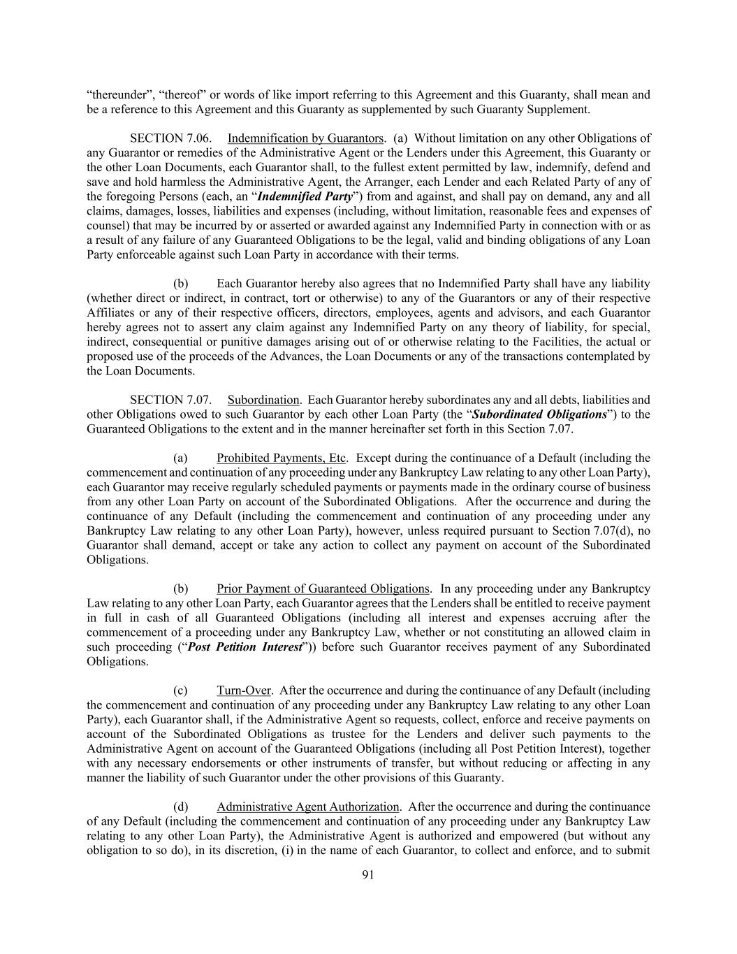 91 “thereunder”, “thereof” or words of like import referring to this Agreement and this Guaranty, shall mean and be a reference to this Agreement and this Guaranty as supplemented by such Guaranty Supplement. SECTION 7.06. Indemnification by Guarantors. (a) Without limitation on any other Obligations of any Guarantor or remedies of the Administrative Agent or the Lenders under this Agreement, this Guaranty or the other Loan Documents, each Guarantor shall, to the fullest extent permitted by law, indemnify, defend and save and hold harmless the Administrative Agent, the Arranger, each Lender and each Related Party of any of the foregoing Persons (each, an “Indemnified Party”) from and against, and shall pay on demand, any and all claims, damages, losses, liabilities and expenses (including, without limitation, reasonable fees and expenses of counsel) that may be incurred by or asserted or awarded against any Indemnified Party in connection with or as a result of any failure of any Guaranteed Obligations to be the legal, valid and binding obligations of any Loan Party enforceable against such Loan Party in accordance with their terms. (b) Each Guarantor hereby also agrees that no Indemnified Party shall have any liability (whether direct or indirect, in contract, tort or otherwise) to any of the Guarantors or any of their respective Affiliates or any of their respective officers, directors, employees, agents and advisors, and each Guarantor hereby agrees not to assert any claim against any Indemnified Party on any theory of liability, for special, indirect, consequential or punitive damages arising out of or otherwise relating to the Facilities, the actual or proposed use of the proceeds of the Advances, the Loan Documents or any of the transactions contemplated by the Loan Documents. SECTION 7.07. Subordination. Each Guarantor hereby subordinates any and all debts, liabilities and other Obligations owed to such Guarantor by each other Loan Party (the “Subordinated Obligations”) to the Guaranteed Obligations to the extent and in the manner hereinafter set forth in this Section 7.07. (a) Prohibited Payments, Etc. Except during the continuance of a Default (including the commencement and continuation of any proceeding under any Bankruptcy Law relating to any other Loan Party), each Guarantor may receive regularly scheduled payments or payments made in the ordinary course of business from any other Loan Party on account of the Subordinated Obligations. After the occurrence and during the continuance of any Default (including the commencement and continuation of any proceeding under any Bankruptcy Law relating to any other Loan Party), however, unless required pursuant to Section 7.07(d), no Guarantor shall demand, accept or take any action to collect any payment on account of the Subordinated Obligations. (b) Prior Payment of Guaranteed Obligations. In any proceeding under any Bankruptcy Law relating to any other Loan Party, each Guarantor agrees that the Lenders shall be entitled to receive payment in full in cash of all Guaranteed Obligations (including all interest and expenses accruing after the commencement of a proceeding under any Bankruptcy Law, whether or not constituting an allowed claim in such proceeding (“Post Petition Interest”)) before such Guarantor receives payment of any Subordinated Obligations. (c) Turn-Over. After the occurrence and during the continuance of any Default (including the commencement and continuation of any proceeding under any Bankruptcy Law relating to any other Loan Party), each Guarantor shall, if the Administrative Agent so requests, collect, enforce and receive payments on account of the Subordinated Obligations as trustee for the Lenders and deliver such payments to the Administrative Agent on account of the Guaranteed Obligations (including all Post Petition Interest), together with any necessary endorsements or other instruments of transfer, but without reducing or affecting in any manner the liability of such Guarantor under the other provisions of this Guaranty. (d) Administrative Agent Authorization. After the occurrence and during the continuance of any Default (including the commencement and continuation of any proceeding under any Bankruptcy Law relating to any other Loan Party), the Administrative Agent is authorized and empowered (but without any obligation to so do), in its discretion, (i) in the name of each Guarantor, to collect and enforce, and to submit