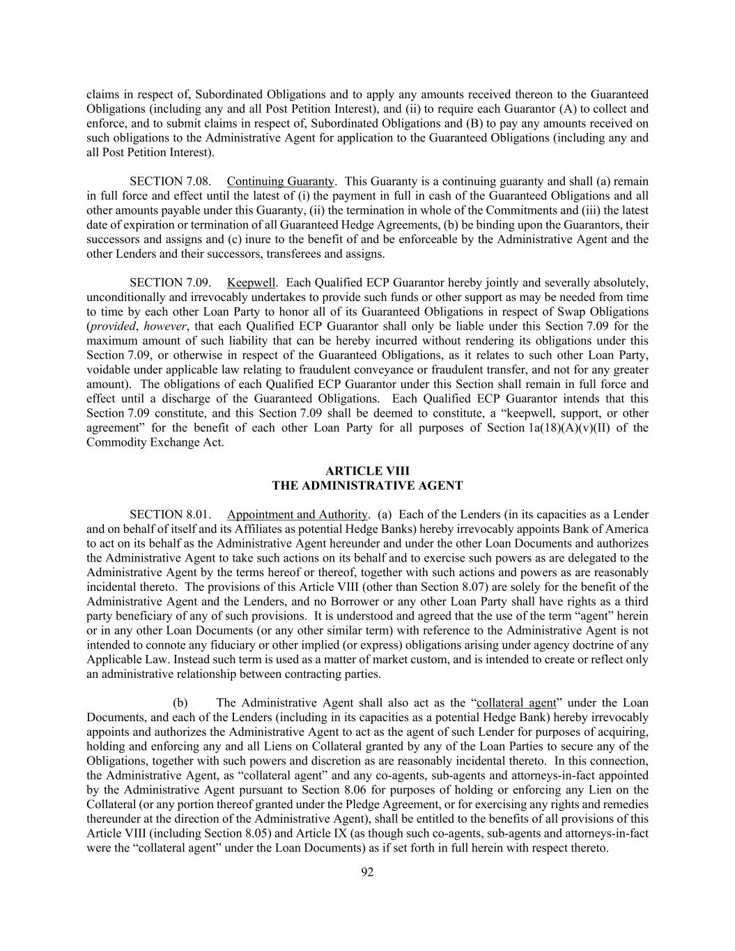 92 claims in respect of, Subordinated Obligations and to apply any amounts received thereon to the Guaranteed Obligations (including any and all Post Petition Interest), and (ii) to require each Guarantor (A) to collect and enforce, and to submit claims in respect of, Subordinated Obligations and (B) to pay any amounts received on such obligations to the Administrative Agent for application to the Guaranteed Obligations (including any and all Post Petition Interest). SECTION 7.08. Continuing Guaranty. This Guaranty is a continuing guaranty and shall (a) remain in full force and effect until the latest of (i) the payment in full in cash of the Guaranteed Obligations and all other amounts payable under this Guaranty, (ii) the termination in whole of the Commitments and (iii) the latest date of expiration or termination of all Guaranteed Hedge Agreements, (b) be binding upon the Guarantors, their successors and assigns and (c) inure to the benefit of and be enforceable by the Administrative Agent and the other Lenders and their successors, transferees and assigns. SECTION 7.09. Keepwell. Each Qualified ECP Guarantor hereby jointly and severally absolutely, unconditionally and irrevocably undertakes to provide such funds or other support as may be needed from time to time by each other Loan Party to honor all of its Guaranteed Obligations in respect of Swap Obligations (provided, however, that each Qualified ECP Guarantor shall only be liable under this Section 7.09 for the maximum amount of such liability that can be hereby incurred without rendering its obligations under this Section 7.09, or otherwise in respect of the Guaranteed Obligations, as it relates to such other Loan Party, voidable under applicable law relating to fraudulent conveyance or fraudulent transfer, and not for any greater amount). The obligations of each Qualified ECP Guarantor under this Section shall remain in full force and effect until a discharge of the Guaranteed Obligations. Each Qualified ECP Guarantor intends that this Section 7.09 constitute, and this Section 7.09 shall be deemed to constitute, a “keepwell, support, or other agreement” for the benefit of each other Loan Party for all purposes of Section 1a(18)(A)(v)(II) of the Commodity Exchange Act. ARTICLE VIII THE ADMINISTRATIVE AGENT SECTION 8.01. Appointment and Authority. (a) Each of the Lenders (in its capacities as a Lender and on behalf of itself and its Affiliates as potential Hedge Banks) hereby irrevocably appoints Bank of America to act on its behalf as the Administrative Agent hereunder and under the other Loan Documents and authorizes the Administrative Agent to take such actions on its behalf and to exercise such powers as are delegated to the Administrative Agent by the terms hereof or thereof, together with such actions and powers as are reasonably incidental thereto. The provisions of this Article VIII (other than Section 8.07) are solely for the benefit of the Administrative Agent and the Lenders, and no Borrower or any other Loan Party shall have rights as a third party beneficiary of any of such provisions. It is understood and agreed that the use of the term “agent” herein or in any other Loan Documents (or any other similar term) with reference to the Administrative Agent is not intended to connote any fiduciary or other implied (or express) obligations arising under agency doctrine of any Applicable Law. Instead such term is used as a matter of market custom, and is intended to create or reflect only an administrative relationship between contracting parties. (b) The Administrative Agent shall also act as the “collateral agent” under the Loan Documents, and each of the Lenders (including in its capacities as a potential Hedge Bank) hereby irrevocably appoints and authorizes the Administrative Agent to act as the agent of such Lender for purposes of acquiring, holding and enforcing any and all Liens on Collateral granted by any of the Loan Parties to secure any of the Obligations, together with such powers and discretion as are reasonably incidental thereto. In this connection, the Administrative Agent, as “collateral agent” and any co-agents, sub-agents and attorneys-in-fact appointed by the Administrative Agent pursuant to Section 8.06 for purposes of holding or enforcing any Lien on the Collateral (or any portion thereof granted under the Pledge Agreement, or for exercising any rights and remedies thereunder at the direction of the Administrative Agent), shall be entitled to the benefits of all provisions of this Article VIII (including Section 8.05) and Article IX (as though such co-agents, sub-agents and attorneys-in-fact were the “collateral agent” under the Loan Documents) as if set forth in full herein with respect thereto.