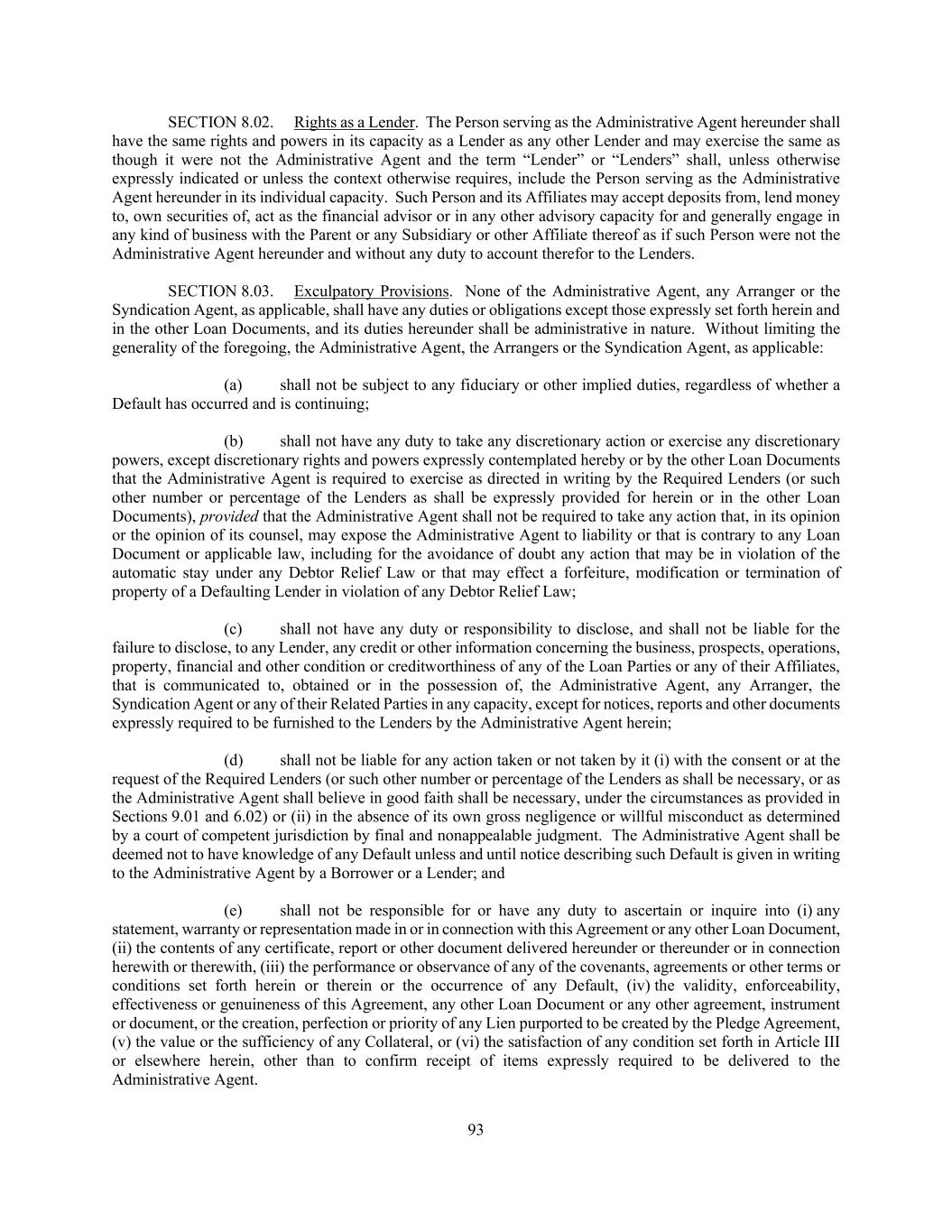 93 SECTION 8.02. Rights as a Lender. The Person serving as the Administrative Agent hereunder shall have the same rights and powers in its capacity as a Lender as any other Lender and may exercise the same as though it were not the Administrative Agent and the term “Lender” or “Lenders” shall, unless otherwise expressly indicated or unless the context otherwise requires, include the Person serving as the Administrative Agent hereunder in its individual capacity. Such Person and its Affiliates may accept deposits from, lend money to, own securities of, act as the financial advisor or in any other advisory capacity for and generally engage in any kind of business with the Parent or any Subsidiary or other Affiliate thereof as if such Person were not the Administrative Agent hereunder and without any duty to account therefor to the Lenders. SECTION 8.03. Exculpatory Provisions. None of the Administrative Agent, any Arranger or the Syndication Agent, as applicable, shall have any duties or obligations except those expressly set forth herein and in the other Loan Documents, and its duties hereunder shall be administrative in nature. Without limiting the generality of the foregoing, the Administrative Agent, the Arrangers or the Syndication Agent, as applicable: (a) shall not be subject to any fiduciary or other implied duties, regardless of whether a Default has occurred and is continuing; (b) shall not have any duty to take any discretionary action or exercise any discretionary powers, except discretionary rights and powers expressly contemplated hereby or by the other Loan Documents that the Administrative Agent is required to exercise as directed in writing by the Required Lenders (or such other number or percentage of the Lenders as shall be expressly provided for herein or in the other Loan Documents), provided that the Administrative Agent shall not be required to take any action that, in its opinion or the opinion of its counsel, may expose the Administrative Agent to liability or that is contrary to any Loan Document or applicable law, including for the avoidance of doubt any action that may be in violation of the automatic stay under any Debtor Relief Law or that may effect a forfeiture, modification or termination of property of a Defaulting Lender in violation of any Debtor Relief Law; (c) shall not have any duty or responsibility to disclose, and shall not be liable for the failure to disclose, to any Lender, any credit or other information concerning the business, prospects, operations, property, financial and other condition or creditworthiness of any of the Loan Parties or any of their Affiliates, that is communicated to, obtained or in the possession of, the Administrative Agent, any Arranger, the Syndication Agent or any of their Related Parties in any capacity, except for notices, reports and other documents expressly required to be furnished to the Lenders by the Administrative Agent herein; (d) shall not be liable for any action taken or not taken by it (i) with the consent or at the request of the Required Lenders (or such other number or percentage of the Lenders as shall be necessary, or as the Administrative Agent shall believe in good faith shall be necessary, under the circumstances as provided in Sections 9.01 and 6.02) or (ii) in the absence of its own gross negligence or willful misconduct as determined by a court of competent jurisdiction by final and nonappealable judgment. The Administrative Agent shall be deemed not to have knowledge of any Default unless and until notice describing such Default is given in writing to the Administrative Agent by a Borrower or a Lender; and (e) shall not be responsible for or have any duty to ascertain or inquire into (i) any statement, warranty or representation made in or in connection with this Agreement or any other Loan Document, (ii) the contents of any certificate, report or other document delivered hereunder or thereunder or in connection herewith or therewith, (iii) the performance or observance of any of the covenants, agreements or other terms or conditions set forth herein or therein or the occurrence of any Default, (iv) the validity, enforceability, effectiveness or genuineness of this Agreement, any other Loan Document or any other agreement, instrument or document, or the creation, perfection or priority of any Lien purported to be created by the Pledge Agreement, (v) the value or the sufficiency of any Collateral, or (vi) the satisfaction of any condition set forth in Article III or elsewhere herein, other than to confirm receipt of items expressly required to be delivered to the Administrative Agent.