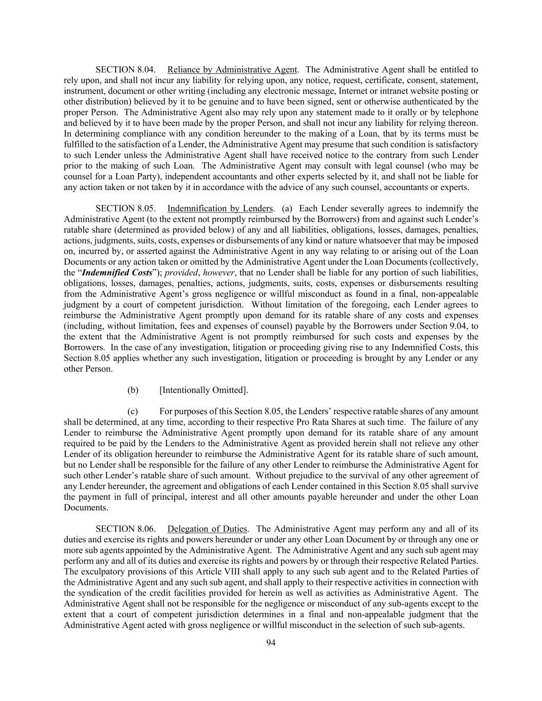 94 SECTION 8.04. Reliance by Administrative Agent. The Administrative Agent shall be entitled to rely upon, and shall not incur any liability for relying upon, any notice, request, certificate, consent, statement, instrument, document or other writing (including any electronic message, Internet or intranet website posting or other distribution) believed by it to be genuine and to have been signed, sent or otherwise authenticated by the proper Person. The Administrative Agent also may rely upon any statement made to it orally or by telephone and believed by it to have been made by the proper Person, and shall not incur any liability for relying thereon. In determining compliance with any condition hereunder to the making of a Loan, that by its terms must be fulfilled to the satisfaction of a Lender, the Administrative Agent may presume that such condition is satisfactory to such Lender unless the Administrative Agent shall have received notice to the contrary from such Lender prior to the making of such Loan. The Administrative Agent may consult with legal counsel (who may be counsel for a Loan Party), independent accountants and other experts selected by it, and shall not be liable for any action taken or not taken by it in accordance with the advice of any such counsel, accountants or experts. SECTION 8.05. Indemnification by Lenders. (a) Each Lender severally agrees to indemnify the Administrative Agent (to the extent not promptly reimbursed by the Borrowers) from and against such Lender’s ratable share (determined as provided below) of any and all liabilities, obligations, losses, damages, penalties, actions, judgments, suits, costs, expenses or disbursements of any kind or nature whatsoever that may be imposed on, incurred by, or asserted against the Administrative Agent in any way relating to or arising out of the Loan Documents or any action taken or omitted by the Administrative Agent under the Loan Documents (collectively, the “Indemnified Costs”); provided, however, that no Lender shall be liable for any portion of such liabilities, obligations, losses, damages, penalties, actions, judgments, suits, costs, expenses or disbursements resulting from the Administrative Agent’s gross negligence or willful misconduct as found in a final, non-appealable judgment by a court of competent jurisdiction. Without limitation of the foregoing, each Lender agrees to reimburse the Administrative Agent promptly upon demand for its ratable share of any costs and expenses (including, without limitation, fees and expenses of counsel) payable by the Borrowers under Section 9.04, to the extent that the Administrative Agent is not promptly reimbursed for such costs and expenses by the Borrowers. In the case of any investigation, litigation or proceeding giving rise to any Indemnified Costs, this Section 8.05 applies whether any such investigation, litigation or proceeding is brought by any Lender or any other Person. (b) [Intentionally Omitted]. (c) For purposes of this Section 8.05, the Lenders’ respective ratable shares of any amount shall be determined, at any time, according to their respective Pro Rata Shares at such time. The failure of any Lender to reimburse the Administrative Agent promptly upon demand for its ratable share of any amount required to be paid by the Lenders to the Administrative Agent as provided herein shall not relieve any other Lender of its obligation hereunder to reimburse the Administrative Agent for its ratable share of such amount, but no Lender shall be responsible for the failure of any other Lender to reimburse the Administrative Agent for such other Lender’s ratable share of such amount. Without prejudice to the survival of any other agreement of any Lender hereunder, the agreement and obligations of each Lender contained in this Section 8.05 shall survive the payment in full of principal, interest and all other amounts payable hereunder and under the other Loan Documents. SECTION 8.06. Delegation of Duties. The Administrative Agent may perform any and all of its duties and exercise its rights and powers hereunder or under any other Loan Document by or through any one or more sub agents appointed by the Administrative Agent. The Administrative Agent and any such sub agent may perform any and all of its duties and exercise its rights and powers by or through their respective Related Parties. The exculpatory provisions of this Article VIII shall apply to any such sub agent and to the Related Parties of the Administrative Agent and any such sub agent, and shall apply to their respective activities in connection with the syndication of the credit facilities provided for herein as well as activities as Administrative Agent. The Administrative Agent shall not be responsible for the negligence or misconduct of any sub-agents except to the extent that a court of competent jurisdiction determines in a final and non-appealable judgment that the Administrative Agent acted with gross negligence or willful misconduct in the selection of such sub-agents.