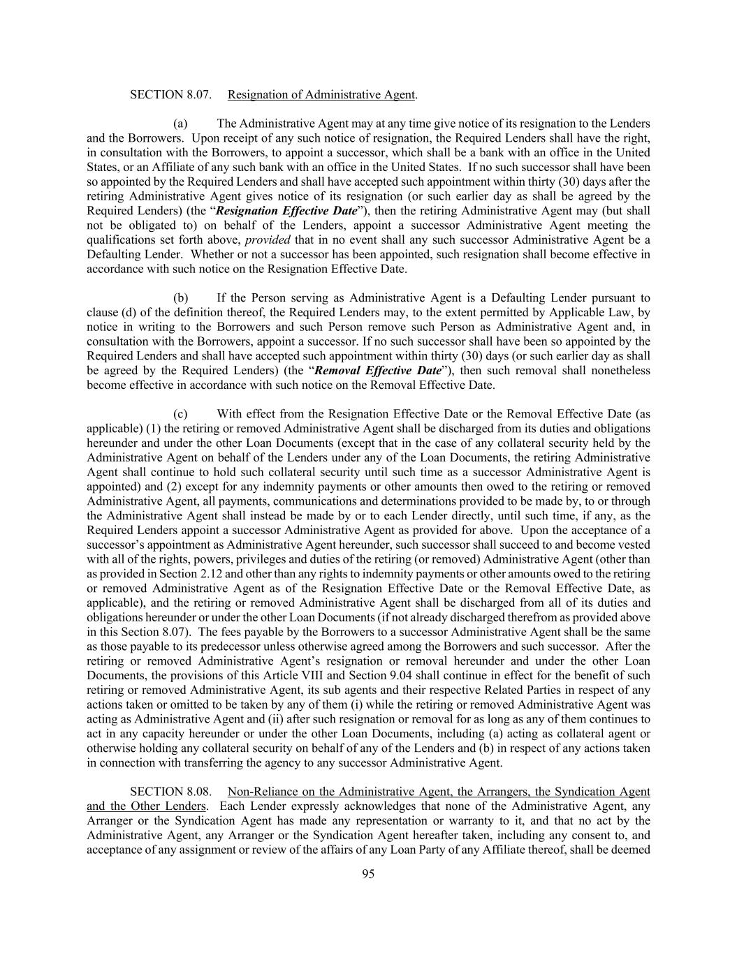 95 SECTION 8.07. Resignation of Administrative Agent. (a) The Administrative Agent may at any time give notice of its resignation to the Lenders and the Borrowers. Upon receipt of any such notice of resignation, the Required Lenders shall have the right, in consultation with the Borrowers, to appoint a successor, which shall be a bank with an office in the United States, or an Affiliate of any such bank with an office in the United States. If no such successor shall have been so appointed by the Required Lenders and shall have accepted such appointment within thirty (30) days after the retiring Administrative Agent gives notice of its resignation (or such earlier day as shall be agreed by the Required Lenders) (the “Resignation Effective Date”), then the retiring Administrative Agent may (but shall not be obligated to) on behalf of the Lenders, appoint a successor Administrative Agent meeting the qualifications set forth above, provided that in no event shall any such successor Administrative Agent be a Defaulting Lender. Whether or not a successor has been appointed, such resignation shall become effective in accordance with such notice on the Resignation Effective Date. (b) If the Person serving as Administrative Agent is a Defaulting Lender pursuant to clause (d) of the definition thereof, the Required Lenders may, to the extent permitted by Applicable Law, by notice in writing to the Borrowers and such Person remove such Person as Administrative Agent and, in consultation with the Borrowers, appoint a successor. If no such successor shall have been so appointed by the Required Lenders and shall have accepted such appointment within thirty (30) days (or such earlier day as shall be agreed by the Required Lenders) (the “Removal Effective Date”), then such removal shall nonetheless become effective in accordance with such notice on the Removal Effective Date. (c) With effect from the Resignation Effective Date or the Removal Effective Date (as applicable) (1) the retiring or removed Administrative Agent shall be discharged from its duties and obligations hereunder and under the other Loan Documents (except that in the case of any collateral security held by the Administrative Agent on behalf of the Lenders under any of the Loan Documents, the retiring Administrative Agent shall continue to hold such collateral security until such time as a successor Administrative Agent is appointed) and (2) except for any indemnity payments or other amounts then owed to the retiring or removed Administrative Agent, all payments, communications and determinations provided to be made by, to or through the Administrative Agent shall instead be made by or to each Lender directly, until such time, if any, as the Required Lenders appoint a successor Administrative Agent as provided for above. Upon the acceptance of a successor’s appointment as Administrative Agent hereunder, such successor shall succeed to and become vested with all of the rights, powers, privileges and duties of the retiring (or removed) Administrative Agent (other than as provided in Section 2.12 and other than any rights to indemnity payments or other amounts owed to the retiring or removed Administrative Agent as of the Resignation Effective Date or the Removal Effective Date, as applicable), and the retiring or removed Administrative Agent shall be discharged from all of its duties and obligations hereunder or under the other Loan Documents (if not already discharged therefrom as provided above in this Section 8.07). The fees payable by the Borrowers to a successor Administrative Agent shall be the same as those payable to its predecessor unless otherwise agreed among the Borrowers and such successor. After the retiring or removed Administrative Agent’s resignation or removal hereunder and under the other Loan Documents, the provisions of this Article VIII and Section 9.04 shall continue in effect for the benefit of such retiring or removed Administrative Agent, its sub agents and their respective Related Parties in respect of any actions taken or omitted to be taken by any of them (i) while the retiring or removed Administrative Agent was acting as Administrative Agent and (ii) after such resignation or removal for as long as any of them continues to act in any capacity hereunder or under the other Loan Documents, including (a) acting as collateral agent or otherwise holding any collateral security on behalf of any of the Lenders and (b) in respect of any actions taken in connection with transferring the agency to any successor Administrative Agent. SECTION 8.08. Non-Reliance on the Administrative Agent, the Arrangers, the Syndication Agent and the Other Lenders. Each Lender expressly acknowledges that none of the Administrative Agent, any Arranger or the Syndication Agent has made any representation or warranty to it, and that no act by the Administrative Agent, any Arranger or the Syndication Agent hereafter taken, including any consent to, and acceptance of any assignment or review of the affairs of any Loan Party of any Affiliate thereof, shall be deemed