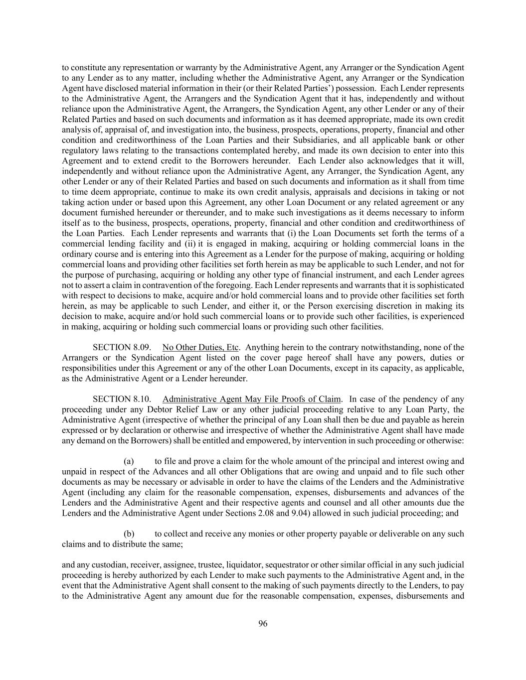 96 to constitute any representation or warranty by the Administrative Agent, any Arranger or the Syndication Agent to any Lender as to any matter, including whether the Administrative Agent, any Arranger or the Syndication Agent have disclosed material information in their (or their Related Parties’) possession. Each Lender represents to the Administrative Agent, the Arrangers and the Syndication Agent that it has, independently and without reliance upon the Administrative Agent, the Arrangers, the Syndication Agent, any other Lender or any of their Related Parties and based on such documents and information as it has deemed appropriate, made its own credit analysis of, appraisal of, and investigation into, the business, prospects, operations, property, financial and other condition and creditworthiness of the Loan Parties and their Subsidiaries, and all applicable bank or other regulatory laws relating to the transactions contemplated hereby, and made its own decision to enter into this Agreement and to extend credit to the Borrowers hereunder. Each Lender also acknowledges that it will, independently and without reliance upon the Administrative Agent, any Arranger, the Syndication Agent, any other Lender or any of their Related Parties and based on such documents and information as it shall from time to time deem appropriate, continue to make its own credit analysis, appraisals and decisions in taking or not taking action under or based upon this Agreement, any other Loan Document or any related agreement or any document furnished hereunder or thereunder, and to make such investigations as it deems necessary to inform itself as to the business, prospects, operations, property, financial and other condition and creditworthiness of the Loan Parties. Each Lender represents and warrants that (i) the Loan Documents set forth the terms of a commercial lending facility and (ii) it is engaged in making, acquiring or holding commercial loans in the ordinary course and is entering into this Agreement as a Lender for the purpose of making, acquiring or holding commercial loans and providing other facilities set forth herein as may be applicable to such Lender, and not for the purpose of purchasing, acquiring or holding any other type of financial instrument, and each Lender agrees not to assert a claim in contravention of the foregoing. Each Lender represents and warrants that it is sophisticated with respect to decisions to make, acquire and/or hold commercial loans and to provide other facilities set forth herein, as may be applicable to such Lender, and either it, or the Person exercising discretion in making its decision to make, acquire and/or hold such commercial loans or to provide such other facilities, is experienced in making, acquiring or holding such commercial loans or providing such other facilities. SECTION 8.09. No Other Duties, Etc. Anything herein to the contrary notwithstanding, none of the Arrangers or the Syndication Agent listed on the cover page hereof shall have any powers, duties or responsibilities under this Agreement or any of the other Loan Documents, except in its capacity, as applicable, as the Administrative Agent or a Lender hereunder. SECTION 8.10. Administrative Agent May File Proofs of Claim. In case of the pendency of any proceeding under any Debtor Relief Law or any other judicial proceeding relative to any Loan Party, the Administrative Agent (irrespective of whether the principal of any Loan shall then be due and payable as herein expressed or by declaration or otherwise and irrespective of whether the Administrative Agent shall have made any demand on the Borrowers) shall be entitled and empowered, by intervention in such proceeding or otherwise: (a) to file and prove a claim for the whole amount of the principal and interest owing and unpaid in respect of the Advances and all other Obligations that are owing and unpaid and to file such other documents as may be necessary or advisable in order to have the claims of the Lenders and the Administrative Agent (including any claim for the reasonable compensation, expenses, disbursements and advances of the Lenders and the Administrative Agent and their respective agents and counsel and all other amounts due the Lenders and the Administrative Agent under Sections 2.08 and 9.04) allowed in such judicial proceeding; and (b) to collect and receive any monies or other property payable or deliverable on any such claims and to distribute the same; and any custodian, receiver, assignee, trustee, liquidator, sequestrator or other similar official in any such judicial proceeding is hereby authorized by each Lender to make such payments to the Administrative Agent and, in the event that the Administrative Agent shall consent to the making of such payments directly to the Lenders, to pay to the Administrative Agent any amount due for the reasonable compensation, expenses, disbursements and