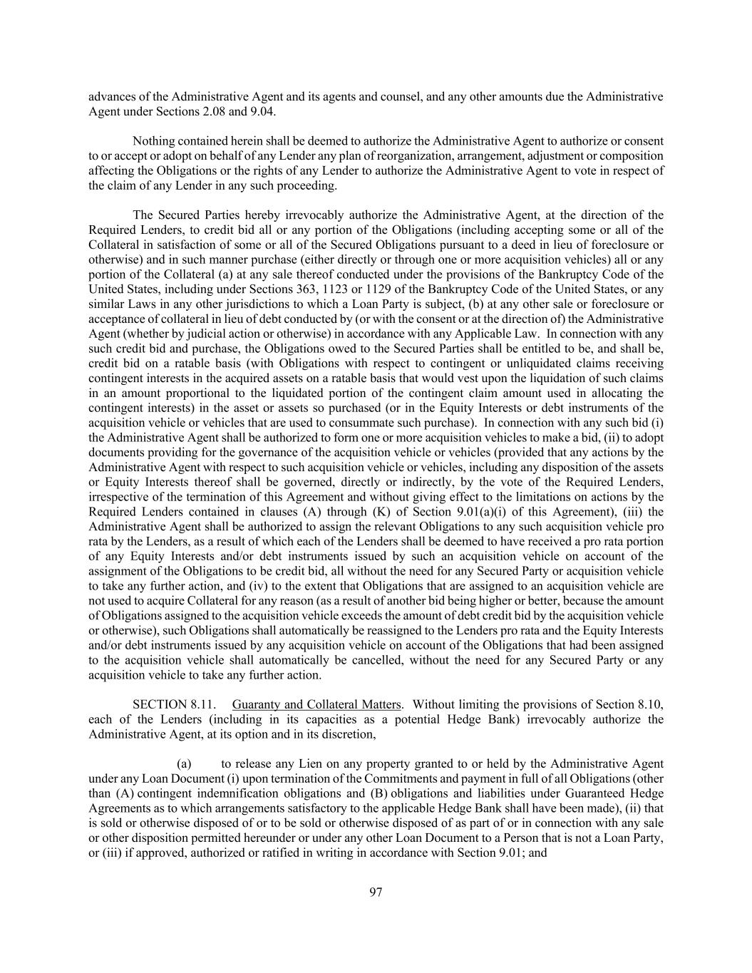 97 advances of the Administrative Agent and its agents and counsel, and any other amounts due the Administrative Agent under Sections 2.08 and 9.04. Nothing contained herein shall be deemed to authorize the Administrative Agent to authorize or consent to or accept or adopt on behalf of any Lender any plan of reorganization, arrangement, adjustment or composition affecting the Obligations or the rights of any Lender to authorize the Administrative Agent to vote in respect of the claim of any Lender in any such proceeding. The Secured Parties hereby irrevocably authorize the Administrative Agent, at the direction of the Required Lenders, to credit bid all or any portion of the Obligations (including accepting some or all of the Collateral in satisfaction of some or all of the Secured Obligations pursuant to a deed in lieu of foreclosure or otherwise) and in such manner purchase (either directly or through one or more acquisition vehicles) all or any portion of the Collateral (a) at any sale thereof conducted under the provisions of the Bankruptcy Code of the United States, including under Sections 363, 1123 or 1129 of the Bankruptcy Code of the United States, or any similar Laws in any other jurisdictions to which a Loan Party is subject, (b) at any other sale or foreclosure or acceptance of collateral in lieu of debt conducted by (or with the consent or at the direction of) the Administrative Agent (whether by judicial action or otherwise) in accordance with any Applicable Law. In connection with any such credit bid and purchase, the Obligations owed to the Secured Parties shall be entitled to be, and shall be, credit bid on a ratable basis (with Obligations with respect to contingent or unliquidated claims receiving contingent interests in the acquired assets on a ratable basis that would vest upon the liquidation of such claims in an amount proportional to the liquidated portion of the contingent claim amount used in allocating the contingent interests) in the asset or assets so purchased (or in the Equity Interests or debt instruments of the acquisition vehicle or vehicles that are used to consummate such purchase). In connection with any such bid (i) the Administrative Agent shall be authorized to form one or more acquisition vehicles to make a bid, (ii) to adopt documents providing for the governance of the acquisition vehicle or vehicles (provided that any actions by the Administrative Agent with respect to such acquisition vehicle or vehicles, including any disposition of the assets or Equity Interests thereof shall be governed, directly or indirectly, by the vote of the Required Lenders, irrespective of the termination of this Agreement and without giving effect to the limitations on actions by the Required Lenders contained in clauses (A) through (K) of Section 9.01(a)(i) of this Agreement), (iii) the Administrative Agent shall be authorized to assign the relevant Obligations to any such acquisition vehicle pro rata by the Lenders, as a result of which each of the Lenders shall be deemed to have received a pro rata portion of any Equity Interests and/or debt instruments issued by such an acquisition vehicle on account of the assignment of the Obligations to be credit bid, all without the need for any Secured Party or acquisition vehicle to take any further action, and (iv) to the extent that Obligations that are assigned to an acquisition vehicle are not used to acquire Collateral for any reason (as a result of another bid being higher or better, because the amount of Obligations assigned to the acquisition vehicle exceeds the amount of debt credit bid by the acquisition vehicle or otherwise), such Obligations shall automatically be reassigned to the Lenders pro rata and the Equity Interests and/or debt instruments issued by any acquisition vehicle on account of the Obligations that had been assigned to the acquisition vehicle shall automatically be cancelled, without the need for any Secured Party or any acquisition vehicle to take any further action. SECTION 8.11. Guaranty and Collateral Matters. Without limiting the provisions of Section 8.10, each of the Lenders (including in its capacities as a potential Hedge Bank) irrevocably authorize the Administrative Agent, at its option and in its discretion, (a) to release any Lien on any property granted to or held by the Administrative Agent under any Loan Document (i) upon termination of the Commitments and payment in full of all Obligations (other than (A) contingent indemnification obligations and (B) obligations and liabilities under Guaranteed Hedge Agreements as to which arrangements satisfactory to the applicable Hedge Bank shall have been made), (ii) that is sold or otherwise disposed of or to be sold or otherwise disposed of as part of or in connection with any sale or other disposition permitted hereunder or under any other Loan Document to a Person that is not a Loan Party, or (iii) if approved, authorized or ratified in writing in accordance with Section 9.01; and