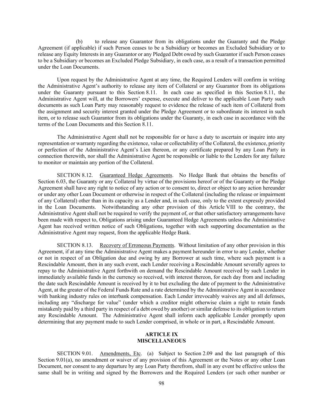 98 (b) to release any Guarantor from its obligations under the Guaranty and the Pledge Agreement (if applicable) if such Person ceases to be a Subsidiary or becomes an Excluded Subsidiary or to release any Equity Interests in any Guarantor or any Pledged Debt owed by such Guarantor if such Person ceases to be a Subsidiary or becomes an Excluded Pledge Subsidiary, in each case, as a result of a transaction permitted under the Loan Documents. Upon request by the Administrative Agent at any time, the Required Lenders will confirm in writing the Administrative Agent’s authority to release any item of Collateral or any Guarantor from its obligations under the Guaranty pursuant to this Section 8.11. In each case as specified in this Section 8.11, the Administrative Agent will, at the Borrowers’ expense, execute and deliver to the applicable Loan Party such documents as such Loan Party may reasonably request to evidence the release of such item of Collateral from the assignment and security interest granted under the Pledge Agreement or to subordinate its interest in such item, or to release such Guarantor from its obligations under the Guaranty, in each case in accordance with the terms of the Loan Documents and this Section 8.11. The Administrative Agent shall not be responsible for or have a duty to ascertain or inquire into any representation or warranty regarding the existence, value or collectability of the Collateral, the existence, priority or perfection of the Administrative Agent’s Lien thereon, or any certificate prepared by any Loan Party in connection therewith, nor shall the Administrative Agent be responsible or liable to the Lenders for any failure to monitor or maintain any portion of the Collateral. SECTION 8.12. Guaranteed Hedge Agreements. No Hedge Bank that obtains the benefits of Section 6.03, the Guaranty or any Collateral by virtue of the provisions hereof or of the Guaranty or the Pledge Agreement shall have any right to notice of any action or to consent to, direct or object to any action hereunder or under any other Loan Document or otherwise in respect of the Collateral (including the release or impairment of any Collateral) other than in its capacity as a Lender and, in such case, only to the extent expressly provided in the Loan Documents. Notwithstanding any other provision of this Article VIII to the contrary, the Administrative Agent shall not be required to verify the payment of, or that other satisfactory arrangements have been made with respect to, Obligations arising under Guaranteed Hedge Agreements unless the Administrative Agent has received written notice of such Obligations, together with such supporting documentation as the Administrative Agent may request, from the applicable Hedge Bank. SECTION 8.13. Recovery of Erroneous Payments. Without limitation of any other provision in this Agreement, if at any time the Administrative Agent makes a payment hereunder in error to any Lender, whether or not in respect of an Obligation due and owing by any Borrower at such time, where such payment is a Rescindable Amount, then in any such event, each Lender receiving a Rescindable Amount severally agrees to repay to the Administrative Agent forthwith on demand the Rescindable Amount received by such Lender in immediately available funds in the currency so received, with interest thereon, for each day from and including the date such Rescindable Amount is received by it to but excluding the date of payment to the Administrative Agent, at the greater of the Federal Funds Rate and a rate determined by the Administrative Agent in accordance with banking industry rules on interbank compensation. Each Lender irrevocably waives any and all defenses, including any “discharge for value” (under which a creditor might otherwise claim a right to retain funds mistakenly paid by a third party in respect of a debt owed by another) or similar defense to its obligation to return any Rescindable Amount. The Administrative Agent shall inform each applicable Lender promptly upon determining that any payment made to such Lender comprised, in whole or in part, a Rescindable Amount. ARTICLE IX MISCELLANEOUS SECTION 9.01. Amendments, Etc. (a) Subject to Section 2.09 and the last paragraph of this Section 9.01(a), no amendment or waiver of any provision of this Agreement or the Notes or any other Loan Document, nor consent to any departure by any Loan Party therefrom, shall in any event be effective unless the same shall be in writing and signed by the Borrowers and the Required Lenders (or such other number or