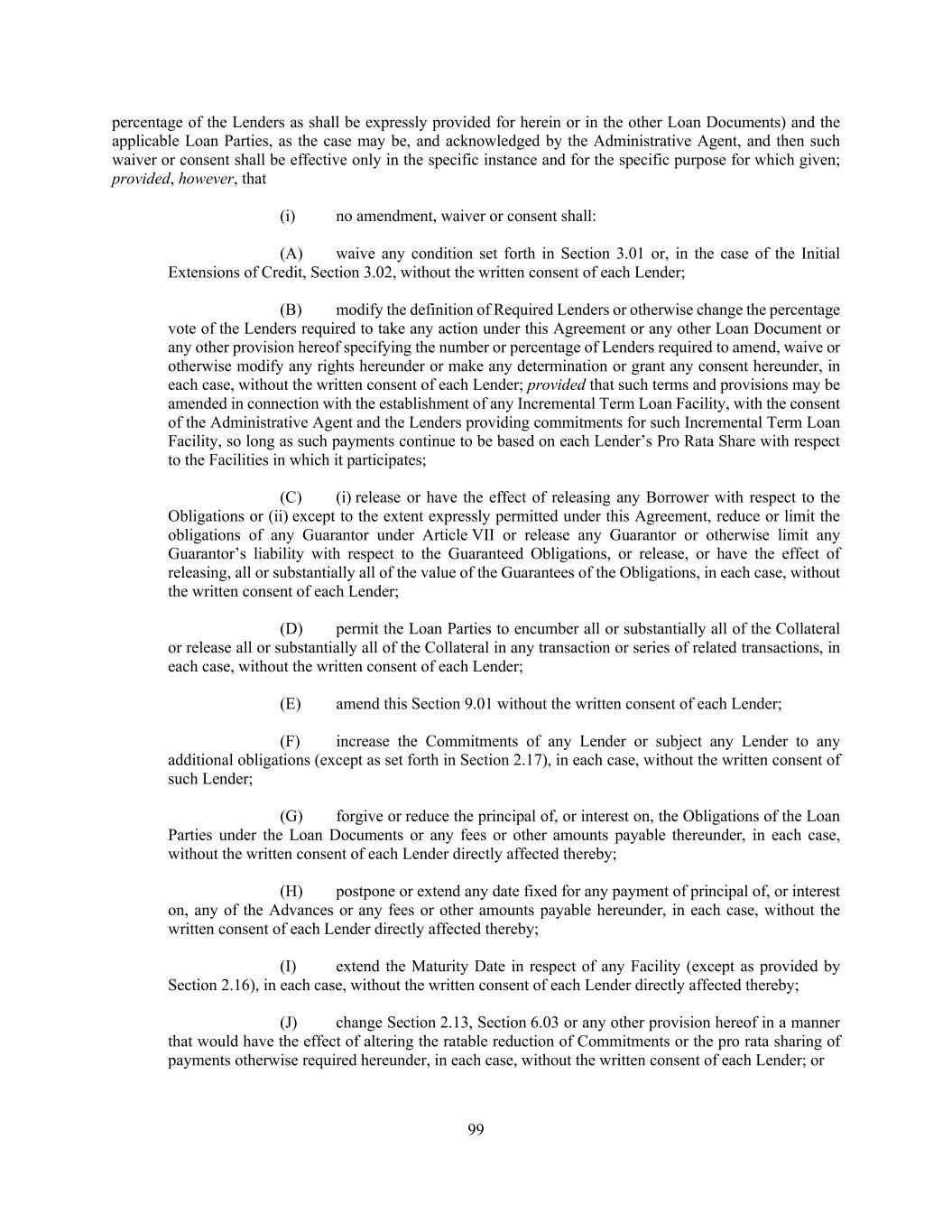 99 percentage of the Lenders as shall be expressly provided for herein or in the other Loan Documents) and the applicable Loan Parties, as the case may be, and acknowledged by the Administrative Agent, and then such waiver or consent shall be effective only in the specific instance and for the specific purpose for which given; provided, however, that (i) no amendment, waiver or consent shall: (A) waive any condition set forth in Section 3.01 or, in the case of the Initial Extensions of Credit, Section 3.02, without the written consent of each Lender; (B) modify the definition of Required Lenders or otherwise change the percentage vote of the Lenders required to take any action under this Agreement or any other Loan Document or any other provision hereof specifying the number or percentage of Lenders required to amend, waive or otherwise modify any rights hereunder or make any determination or grant any consent hereunder, in each case, without the written consent of each Lender; provided that such terms and provisions may be amended in connection with the establishment of any Incremental Term Loan Facility, with the consent of the Administrative Agent and the Lenders providing commitments for such Incremental Term Loan Facility, so long as such payments continue to be based on each Lender’s Pro Rata Share with respect to the Facilities in which it participates; (C) (i) release or have the effect of releasing any Borrower with respect to the Obligations or (ii) except to the extent expressly permitted under this Agreement, reduce or limit the obligations of any Guarantor under Article VII or release any Guarantor or otherwise limit any Guarantor’s liability with respect to the Guaranteed Obligations, or release, or have the effect of releasing, all or substantially all of the value of the Guarantees of the Obligations, in each case, without the written consent of each Lender; (D) permit the Loan Parties to encumber all or substantially all of the Collateral or release all or substantially all of the Collateral in any transaction or series of related transactions, in each case, without the written consent of each Lender; (E) amend this Section 9.01 without the written consent of each Lender; (F) increase the Commitments of any Lender or subject any Lender to any additional obligations (except as set forth in Section 2.17), in each case, without the written consent of such Lender; (G) forgive or reduce the principal of, or interest on, the Obligations of the Loan Parties under the Loan Documents or any fees or other amounts payable thereunder, in each case, without the written consent of each Lender directly affected thereby; (H) postpone or extend any date fixed for any payment of principal of, or interest on, any of the Advances or any fees or other amounts payable hereunder, in each case, without the written consent of each Lender directly affected thereby; (I) extend the Maturity Date in respect of any Facility (except as provided by Section 2.16), in each case, without the written consent of each Lender directly affected thereby; (J) change Section 2.13, Section 6.03 or any other provision hereof in a manner that would have the effect of altering the ratable reduction of Commitments or the pro rata sharing of payments otherwise required hereunder, in each case, without the written consent of each Lender; or