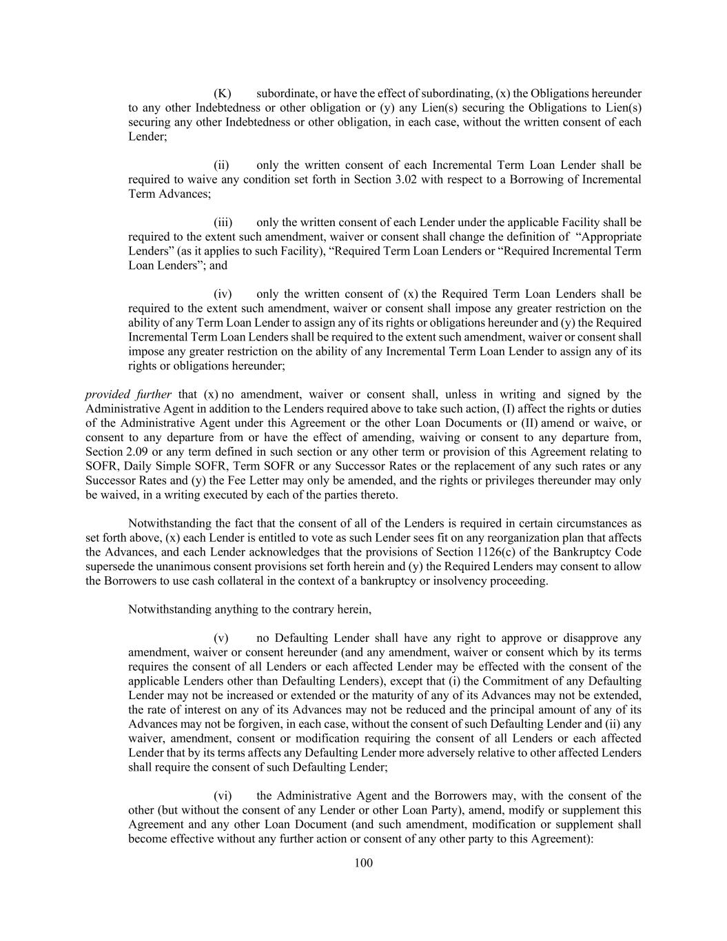 100 (K) subordinate, or have the effect of subordinating, (x) the Obligations hereunder to any other Indebtedness or other obligation or (y) any Lien(s) securing the Obligations to Lien(s) securing any other Indebtedness or other obligation, in each case, without the written consent of each Lender; (ii) only the written consent of each Incremental Term Loan Lender shall be required to waive any condition set forth in Section 3.02 with respect to a Borrowing of Incremental Term Advances; (iii) only the written consent of each Lender under the applicable Facility shall be required to the extent such amendment, waiver or consent shall change the definition of “Appropriate Lenders” (as it applies to such Facility), “Required Term Loan Lenders or “Required Incremental Term Loan Lenders”; and (iv) only the written consent of (x) the Required Term Loan Lenders shall be required to the extent such amendment, waiver or consent shall impose any greater restriction on the ability of any Term Loan Lender to assign any of its rights or obligations hereunder and (y) the Required Incremental Term Loan Lenders shall be required to the extent such amendment, waiver or consent shall impose any greater restriction on the ability of any Incremental Term Loan Lender to assign any of its rights or obligations hereunder; provided further that (x) no amendment, waiver or consent shall, unless in writing and signed by the Administrative Agent in addition to the Lenders required above to take such action, (I) affect the rights or duties of the Administrative Agent under this Agreement or the other Loan Documents or (II) amend or waive, or consent to any departure from or have the effect of amending, waiving or consent to any departure from, Section 2.09 or any term defined in such section or any other term or provision of this Agreement relating to SOFR, Daily Simple SOFR, Term SOFR or any Successor Rates or the replacement of any such rates or any Successor Rates and (y) the Fee Letter may only be amended, and the rights or privileges thereunder may only be waived, in a writing executed by each of the parties thereto. Notwithstanding the fact that the consent of all of the Lenders is required in certain circumstances as set forth above, (x) each Lender is entitled to vote as such Lender sees fit on any reorganization plan that affects the Advances, and each Lender acknowledges that the provisions of Section 1126(c) of the Bankruptcy Code supersede the unanimous consent provisions set forth herein and (y) the Required Lenders may consent to allow the Borrowers to use cash collateral in the context of a bankruptcy or insolvency proceeding. Notwithstanding anything to the contrary herein, (v) no Defaulting Lender shall have any right to approve or disapprove any amendment, waiver or consent hereunder (and any amendment, waiver or consent which by its terms requires the consent of all Lenders or each affected Lender may be effected with the consent of the applicable Lenders other than Defaulting Lenders), except that (i) the Commitment of any Defaulting Lender may not be increased or extended or the maturity of any of its Advances may not be extended, the rate of interest on any of its Advances may not be reduced and the principal amount of any of its Advances may not be forgiven, in each case, without the consent of such Defaulting Lender and (ii) any waiver, amendment, consent or modification requiring the consent of all Lenders or each affected Lender that by its terms affects any Defaulting Lender more adversely relative to other affected Lenders shall require the consent of such Defaulting Lender; (vi) the Administrative Agent and the Borrowers may, with the consent of the other (but without the consent of any Lender or other Loan Party), amend, modify or supplement this Agreement and any other Loan Document (and such amendment, modification or supplement shall become effective without any further action or consent of any other party to this Agreement):