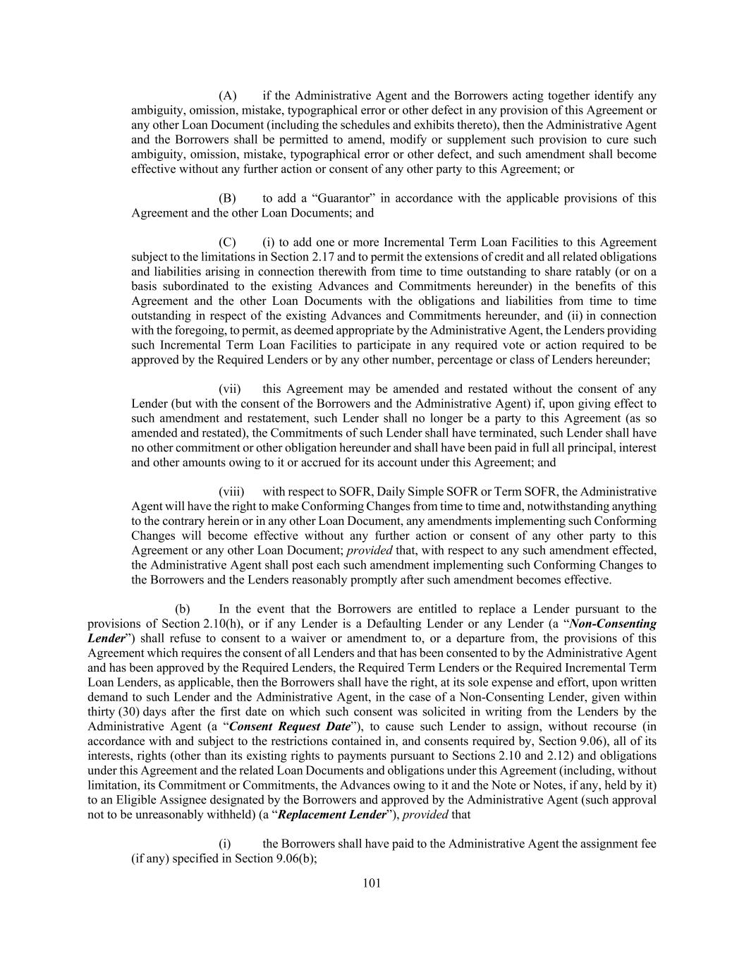 101 (A) if the Administrative Agent and the Borrowers acting together identify any ambiguity, omission, mistake, typographical error or other defect in any provision of this Agreement or any other Loan Document (including the schedules and exhibits thereto), then the Administrative Agent and the Borrowers shall be permitted to amend, modify or supplement such provision to cure such ambiguity, omission, mistake, typographical error or other defect, and such amendment shall become effective without any further action or consent of any other party to this Agreement; or (B) to add a “Guarantor” in accordance with the applicable provisions of this Agreement and the other Loan Documents; and (C) (i) to add one or more Incremental Term Loan Facilities to this Agreement subject to the limitations in Section 2.17 and to permit the extensions of credit and all related obligations and liabilities arising in connection therewith from time to time outstanding to share ratably (or on a basis subordinated to the existing Advances and Commitments hereunder) in the benefits of this Agreement and the other Loan Documents with the obligations and liabilities from time to time outstanding in respect of the existing Advances and Commitments hereunder, and (ii) in connection with the foregoing, to permit, as deemed appropriate by the Administrative Agent, the Lenders providing such Incremental Term Loan Facilities to participate in any required vote or action required to be approved by the Required Lenders or by any other number, percentage or class of Lenders hereunder; (vii) this Agreement may be amended and restated without the consent of any Lender (but with the consent of the Borrowers and the Administrative Agent) if, upon giving effect to such amendment and restatement, such Lender shall no longer be a party to this Agreement (as so amended and restated), the Commitments of such Lender shall have terminated, such Lender shall have no other commitment or other obligation hereunder and shall have been paid in full all principal, interest and other amounts owing to it or accrued for its account under this Agreement; and (viii) with respect to SOFR, Daily Simple SOFR or Term SOFR, the Administrative Agent will have the right to make Conforming Changes from time to time and, notwithstanding anything to the contrary herein or in any other Loan Document, any amendments implementing such Conforming Changes will become effective without any further action or consent of any other party to this Agreement or any other Loan Document; provided that, with respect to any such amendment effected, the Administrative Agent shall post each such amendment implementing such Conforming Changes to the Borrowers and the Lenders reasonably promptly after such amendment becomes effective. (b) In the event that the Borrowers are entitled to replace a Lender pursuant to the provisions of Section 2.10(h), or if any Lender is a Defaulting Lender or any Lender (a “Non-Consenting Lender”) shall refuse to consent to a waiver or amendment to, or a departure from, the provisions of this Agreement which requires the consent of all Lenders and that has been consented to by the Administrative Agent and has been approved by the Required Lenders, the Required Term Lenders or the Required Incremental Term Loan Lenders, as applicable, then the Borrowers shall have the right, at its sole expense and effort, upon written demand to such Lender and the Administrative Agent, in the case of a Non-Consenting Lender, given within thirty (30) days after the first date on which such consent was solicited in writing from the Lenders by the Administrative Agent (a “Consent Request Date”), to cause such Lender to assign, without recourse (in accordance with and subject to the restrictions contained in, and consents required by, Section 9.06), all of its interests, rights (other than its existing rights to payments pursuant to Sections 2.10 and 2.12) and obligations under this Agreement and the related Loan Documents and obligations under this Agreement (including, without limitation, its Commitment or Commitments, the Advances owing to it and the Note or Notes, if any, held by it) to an Eligible Assignee designated by the Borrowers and approved by the Administrative Agent (such approval not to be unreasonably withheld) (a “Replacement Lender”), provided that (i) the Borrowers shall have paid to the Administrative Agent the assignment fee (if any) specified in Section 9.06(b);