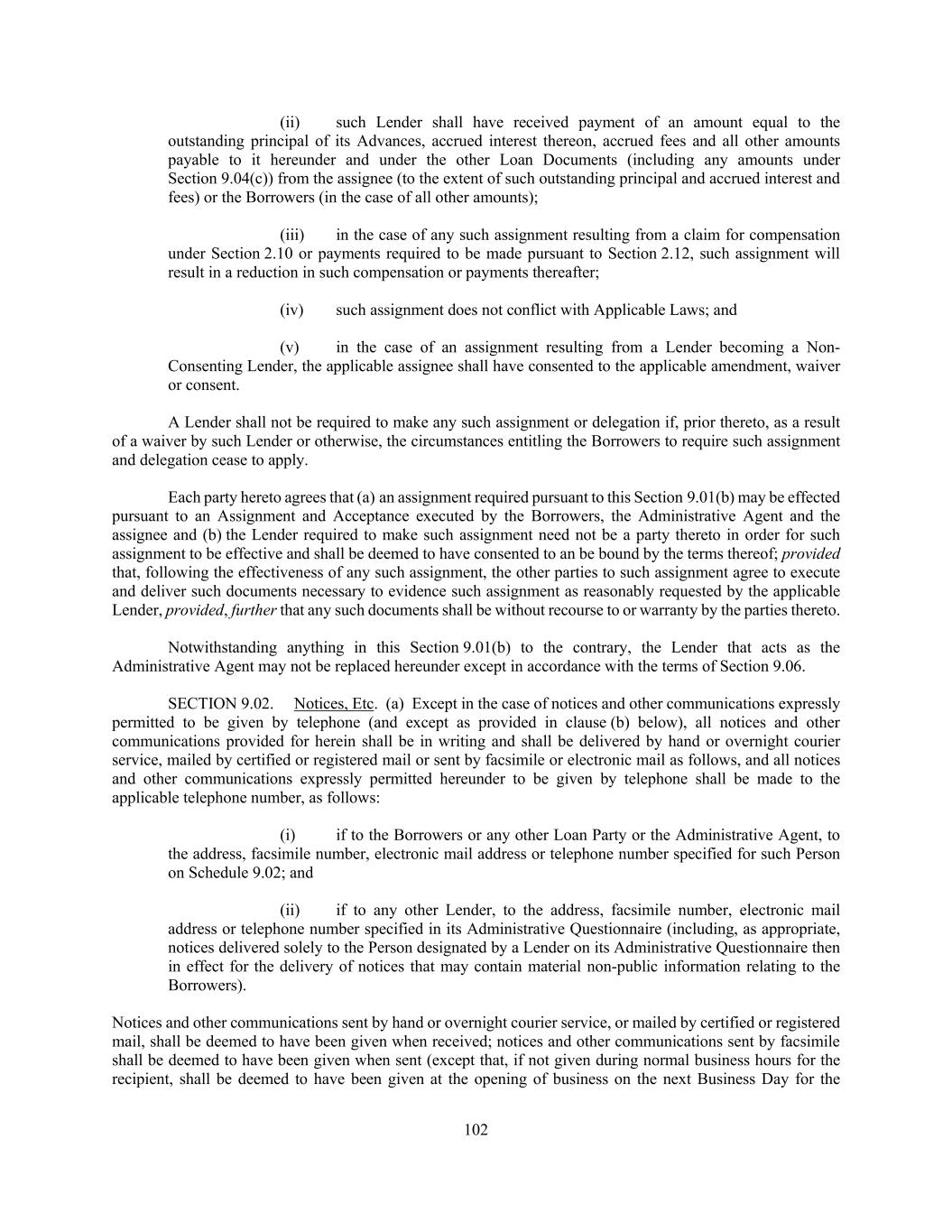 102 (ii) such Lender shall have received payment of an amount equal to the outstanding principal of its Advances, accrued interest thereon, accrued fees and all other amounts payable to it hereunder and under the other Loan Documents (including any amounts under Section 9.04(c)) from the assignee (to the extent of such outstanding principal and accrued interest and fees) or the Borrowers (in the case of all other amounts); (iii) in the case of any such assignment resulting from a claim for compensation under Section 2.10 or payments required to be made pursuant to Section 2.12, such assignment will result in a reduction in such compensation or payments thereafter; (iv) such assignment does not conflict with Applicable Laws; and (v) in the case of an assignment resulting from a Lender becoming a Non- Consenting Lender, the applicable assignee shall have consented to the applicable amendment, waiver or consent. A Lender shall not be required to make any such assignment or delegation if, prior thereto, as a result of a waiver by such Lender or otherwise, the circumstances entitling the Borrowers to require such assignment and delegation cease to apply. Each party hereto agrees that (a) an assignment required pursuant to this Section 9.01(b) may be effected pursuant to an Assignment and Acceptance executed by the Borrowers, the Administrative Agent and the assignee and (b) the Lender required to make such assignment need not be a party thereto in order for such assignment to be effective and shall be deemed to have consented to an be bound by the terms thereof; provided that, following the effectiveness of any such assignment, the other parties to such assignment agree to execute and deliver such documents necessary to evidence such assignment as reasonably requested by the applicable Lender, provided, further that any such documents shall be without recourse to or warranty by the parties thereto. Notwithstanding anything in this Section 9.01(b) to the contrary, the Lender that acts as the Administrative Agent may not be replaced hereunder except in accordance with the terms of Section 9.06. SECTION 9.02. Notices, Etc. (a) Except in the case of notices and other communications expressly permitted to be given by telephone (and except as provided in clause (b) below), all notices and other communications provided for herein shall be in writing and shall be delivered by hand or overnight courier service, mailed by certified or registered mail or sent by facsimile or electronic mail as follows, and all notices and other communications expressly permitted hereunder to be given by telephone shall be made to the applicable telephone number, as follows: (i) if to the Borrowers or any other Loan Party or the Administrative Agent, to the address, facsimile number, electronic mail address or telephone number specified for such Person on Schedule 9.02; and (ii) if to any other Lender, to the address, facsimile number, electronic mail address or telephone number specified in its Administrative Questionnaire (including, as appropriate, notices delivered solely to the Person designated by a Lender on its Administrative Questionnaire then in effect for the delivery of notices that may contain material non-public information relating to the Borrowers). Notices and other communications sent by hand or overnight courier service, or mailed by certified or registered mail, shall be deemed to have been given when received; notices and other communications sent by facsimile shall be deemed to have been given when sent (except that, if not given during normal business hours for the recipient, shall be deemed to have been given at the opening of business on the next Business Day for the