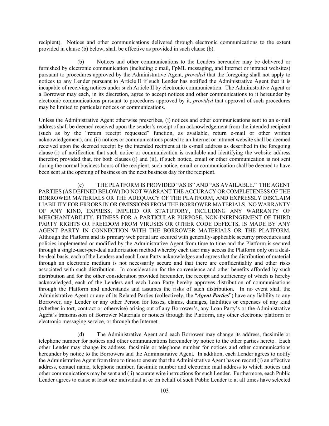 103 recipient). Notices and other communications delivered through electronic communications to the extent provided in clause (b) below, shall be effective as provided in such clause (b). (b) Notices and other communications to the Lenders hereunder may be delivered or furnished by electronic communication (including e mail, FpML messaging, and Internet or intranet websites) pursuant to procedures approved by the Administrative Agent, provided that the foregoing shall not apply to notices to any Lender pursuant to Article II if such Lender has notified the Administrative Agent that it is incapable of receiving notices under such Article II by electronic communication. The Administrative Agent or a Borrower may each, in its discretion, agree to accept notices and other communications to it hereunder by electronic communications pursuant to procedures approved by it, provided that approval of such procedures may be limited to particular notices or communications. Unless the Administrative Agent otherwise prescribes, (i) notices and other communications sent to an e-mail address shall be deemed received upon the sender’s receipt of an acknowledgement from the intended recipient (such as by the “return receipt requested” function, as available, return e-mail or other written acknowledgement), and (ii) notices or communications posted to an Internet or intranet website shall be deemed received upon the deemed receipt by the intended recipient at its e-mail address as described in the foregoing clause (i) of notification that such notice or communication is available and identifying the website address therefor; provided that, for both clauses (i) and (ii), if such notice, email or other communication is not sent during the normal business hours of the recipient, such notice, email or communication shall be deemed to have been sent at the opening of business on the next business day for the recipient. (c) THE PLATFORM IS PROVIDED “AS IS” AND “AS AVAILABLE.” THE AGENT PARTIES (AS DEFINED BELOW) DO NOT WARRANT THE ACCURACY OR COMPLETENESS OF THE BORROWER MATERIALS OR THE ADEQUACY OF THE PLATFORM, AND EXPRESSLY DISCLAIM LIABILITY FOR ERRORS IN OR OMISSIONS FROM THE BORROWER MATERIALS. NO WARRANTY OF ANY KIND, EXPRESS, IMPLIED OR STATUTORY, INCLUDING ANY WARRANTY OF MERCHANTABILITY, FITNESS FOR A PARTICULAR PURPOSE, NON-INFRINGEMENT OF THIRD PARTY RIGHTS OR FREEDOM FROM VIRUSES OR OTHER CODE DEFECTS, IS MADE BY ANY AGENT PARTY IN CONNECTION WITH THE BORROWER MATERIALS OR THE PLATFORM. Although the Platform and its primary web portal are secured with generally-applicable security procedures and policies implemented or modified by the Administrative Agent from time to time and the Platform is secured through a single-user-per-deal authorization method whereby each user may access the Platform only on a deal- by-deal basis, each of the Lenders and each Loan Party acknowledges and agrees that the distribution of material through an electronic medium is not necessarily secure and that there are confidentiality and other risks associated with such distribution. In consideration for the convenience and other benefits afforded by such distribution and for the other consideration provided hereunder, the receipt and sufficiency of which is hereby acknowledged, each of the Lenders and each Loan Party hereby approves distribution of communications through the Platform and understands and assumes the risks of such distribution. In no event shall the Administrative Agent or any of its Related Parties (collectively, the “Agent Parties”) have any liability to any Borrower, any Lender or any other Person for losses, claims, damages, liabilities or expenses of any kind (whether in tort, contract or otherwise) arising out of any Borrower’s, any Loan Party’s or the Administrative Agent’s transmission of Borrower Materials or notices through the Platform, any other electronic platform or electronic messaging service, or through the Internet. (d) The Administrative Agent and each Borrower may change its address, facsimile or telephone number for notices and other communications hereunder by notice to the other parties hereto. Each other Lender may change its address, facsimile or telephone number for notices and other communications hereunder by notice to the Borrowers and the Administrative Agent. In addition, each Lender agrees to notify the Administrative Agent from time to time to ensure that the Administrative Agent has on record (i) an effective address, contact name, telephone number, facsimile number and electronic mail address to which notices and other communications may be sent and (ii) accurate wire instructions for such Lender. Furthermore, each Public Lender agrees to cause at least one individual at or on behalf of such Public Lender to at all times have selected