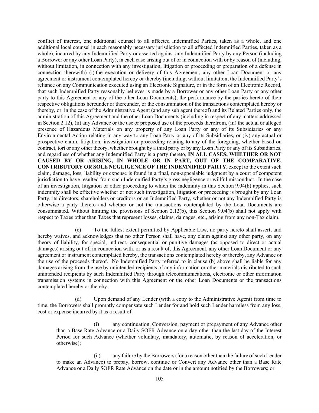105 conflict of interest, one additional counsel to all affected Indemnified Parties, taken as a whole, and one additional local counsel in each reasonably necessary jurisdiction to all affected Indemnified Parties, taken as a whole), incurred by any Indemnified Party or asserted against any Indemnified Party by any Person (including a Borrower or any other Loan Party), in each case arising out of or in connection with or by reason of (including, without limitation, in connection with any investigation, litigation or proceeding or preparation of a defense in connection therewith) (i) the execution or delivery of this Agreement, any other Loan Document or any agreement or instrument contemplated hereby or thereby (including, without limitation, the Indemnified Party’s reliance on any Communication executed using an Electronic Signature, or in the form of an Electronic Record, that such Indemnified Party reasonably believes is made by a Borrower or any other Loan Party or any other party to this Agreement or any of the other Loan Documents), the performance by the parties hereto of their respective obligations hereunder or thereunder, or the consummation of the transactions contemplated hereby or thereby, or, in the case of the Administrative Agent (and any sub agent thereof) and its Related Parties only, the administration of this Agreement and the other Loan Documents (including in respect of any matters addressed in Section 2.12), (ii) any Advance or the use or proposed use of the proceeds therefrom, (iii) the actual or alleged presence of Hazardous Materials on any property of any Loan Party or any of its Subsidiaries or any Environmental Action relating in any way to any Loan Party or any of its Subsidiaries, or (iv) any actual or prospective claim, litigation, investigation or proceeding relating to any of the foregoing, whether based on contract, tort or any other theory, whether brought by a third party or by any Loan Party or any of its Subsidiaries, and regardless of whether any Indemnified Party is a party thereto, IN ALL CASES, WHETHER OR NOT CAUSED BY OR ARISING, IN WHOLE OR IN PART, OUT OF THE COMPARATIVE, CONTRIBUTORY OR SOLE NEGLIGENCE OF THE INDEMNIFIED PARTY, except to the extent such claim, damage, loss, liability or expense is found in a final, non-appealable judgment by a court of competent jurisdiction to have resulted from such Indemnified Party’s gross negligence or willful misconduct. In the case of an investigation, litigation or other proceeding to which the indemnity in this Section 9.04(b) applies, such indemnity shall be effective whether or not such investigation, litigation or proceeding is brought by any Loan Party, its directors, shareholders or creditors or an Indemnified Party, whether or not any Indemnified Party is otherwise a party thereto and whether or not the transactions contemplated by the Loan Documents are consummated. Without limiting the provisions of Section 2.12(b), this Section 9.04(b) shall not apply with respect to Taxes other than Taxes that represent losses, claims, damages, etc., arising from any non-Tax claim. (c) To the fullest extent permitted by Applicable Law, no party hereto shall assert, and hereby waives, and acknowledges that no other Person shall have, any claim against any other party, on any theory of liability, for special, indirect, consequential or punitive damages (as opposed to direct or actual damages) arising out of, in connection with, or as a result of, this Agreement, any other Loan Document or any agreement or instrument contemplated hereby, the transactions contemplated hereby or thereby, any Advance or the use of the proceeds thereof. No Indemnified Party referred to in clause (b) above shall be liable for any damages arising from the use by unintended recipients of any information or other materials distributed to such unintended recipients by such Indemnified Party through telecommunications, electronic or other information transmission systems in connection with this Agreement or the other Loan Documents or the transactions contemplated hereby or thereby. (d) Upon demand of any Lender (with a copy to the Administrative Agent) from time to time, the Borrowers shall promptly compensate such Lender for and hold such Lender harmless from any loss, cost or expense incurred by it as a result of: (i) any continuation, Conversion, payment or prepayment of any Advance other than a Base Rate Advance or a Daily SOFR Advance on a day other than the last day of the Interest Period for such Advance (whether voluntary, mandatory, automatic, by reason of acceleration, or otherwise); (ii) any failure by the Borrowers (for a reason other than the failure of such Lender to make an Advance) to prepay, borrow, continue or Convert any Advance other than a Base Rate Advance or a Daily SOFR Rate Advance on the date or in the amount notified by the Borrowers; or