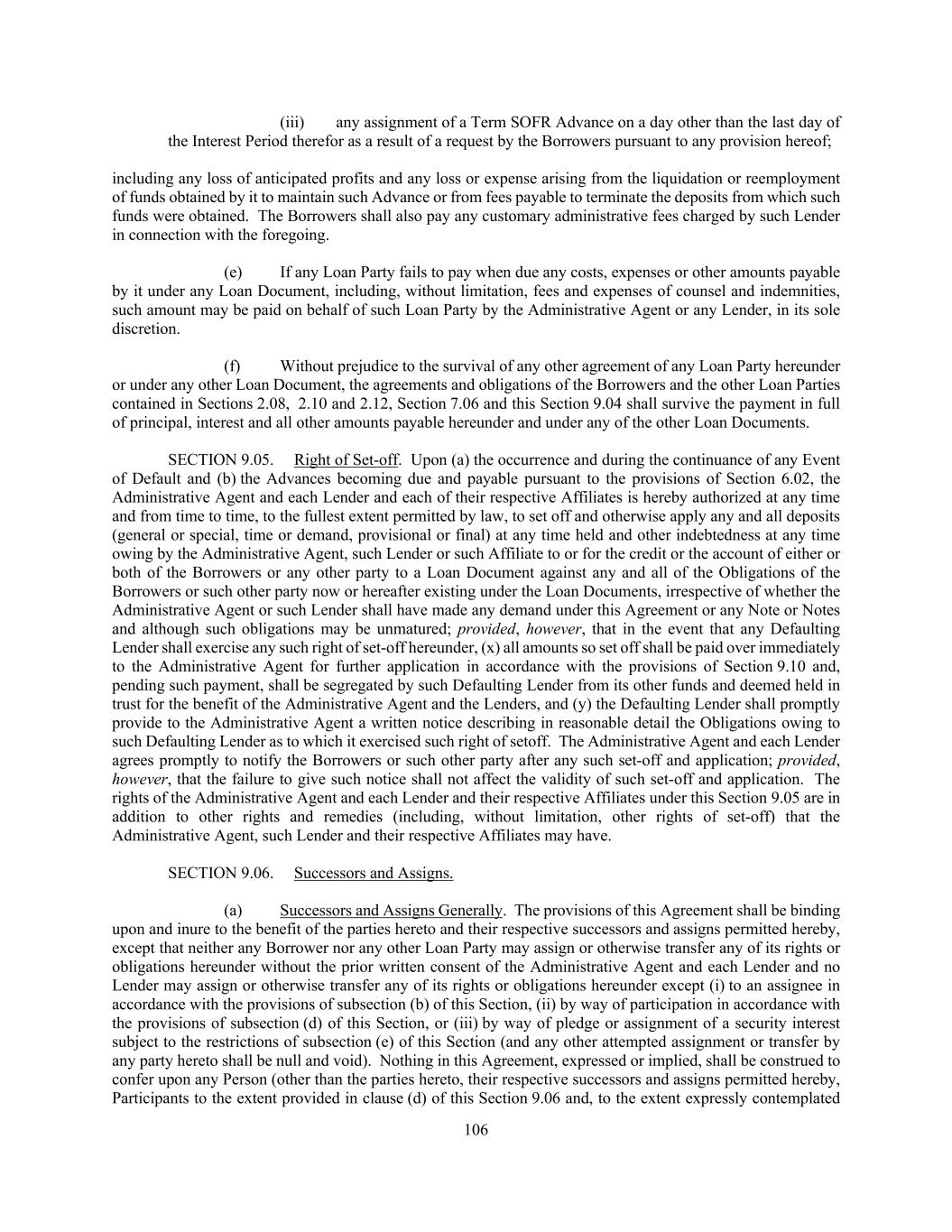 106 (iii) any assignment of a Term SOFR Advance on a day other than the last day of the Interest Period therefor as a result of a request by the Borrowers pursuant to any provision hereof; including any loss of anticipated profits and any loss or expense arising from the liquidation or reemployment of funds obtained by it to maintain such Advance or from fees payable to terminate the deposits from which such funds were obtained. The Borrowers shall also pay any customary administrative fees charged by such Lender in connection with the foregoing. (e) If any Loan Party fails to pay when due any costs, expenses or other amounts payable by it under any Loan Document, including, without limitation, fees and expenses of counsel and indemnities, such amount may be paid on behalf of such Loan Party by the Administrative Agent or any Lender, in its sole discretion. (f) Without prejudice to the survival of any other agreement of any Loan Party hereunder or under any other Loan Document, the agreements and obligations of the Borrowers and the other Loan Parties contained in Sections 2.08, 2.10 and 2.12, Section 7.06 and this Section 9.04 shall survive the payment in full of principal, interest and all other amounts payable hereunder and under any of the other Loan Documents. SECTION 9.05. Right of Set-off. Upon (a) the occurrence and during the continuance of any Event of Default and (b) the Advances becoming due and payable pursuant to the provisions of Section 6.02, the Administrative Agent and each Lender and each of their respective Affiliates is hereby authorized at any time and from time to time, to the fullest extent permitted by law, to set off and otherwise apply any and all deposits (general or special, time or demand, provisional or final) at any time held and other indebtedness at any time owing by the Administrative Agent, such Lender or such Affiliate to or for the credit or the account of either or both of the Borrowers or any other party to a Loan Document against any and all of the Obligations of the Borrowers or such other party now or hereafter existing under the Loan Documents, irrespective of whether the Administrative Agent or such Lender shall have made any demand under this Agreement or any Note or Notes and although such obligations may be unmatured; provided, however, that in the event that any Defaulting Lender shall exercise any such right of set-off hereunder, (x) all amounts so set off shall be paid over immediately to the Administrative Agent for further application in accordance with the provisions of Section 9.10 and, pending such payment, shall be segregated by such Defaulting Lender from its other funds and deemed held in trust for the benefit of the Administrative Agent and the Lenders, and (y) the Defaulting Lender shall promptly provide to the Administrative Agent a written notice describing in reasonable detail the Obligations owing to such Defaulting Lender as to which it exercised such right of setoff. The Administrative Agent and each Lender agrees promptly to notify the Borrowers or such other party after any such set-off and application; provided, however, that the failure to give such notice shall not affect the validity of such set-off and application. The rights of the Administrative Agent and each Lender and their respective Affiliates under this Section 9.05 are in addition to other rights and remedies (including, without limitation, other rights of set-off) that the Administrative Agent, such Lender and their respective Affiliates may have. SECTION 9.06. Successors and Assigns. (a) Successors and Assigns Generally. The provisions of this Agreement shall be binding upon and inure to the benefit of the parties hereto and their respective successors and assigns permitted hereby, except that neither any Borrower nor any other Loan Party may assign or otherwise transfer any of its rights or obligations hereunder without the prior written consent of the Administrative Agent and each Lender and no Lender may assign or otherwise transfer any of its rights or obligations hereunder except (i) to an assignee in accordance with the provisions of subsection (b) of this Section, (ii) by way of participation in accordance with the provisions of subsection (d) of this Section, or (iii) by way of pledge or assignment of a security interest subject to the restrictions of subsection (e) of this Section (and any other attempted assignment or transfer by any party hereto shall be null and void). Nothing in this Agreement, expressed or implied, shall be construed to confer upon any Person (other than the parties hereto, their respective successors and assigns permitted hereby, Participants to the extent provided in clause (d) of this Section 9.06 and, to the extent expressly contemplated