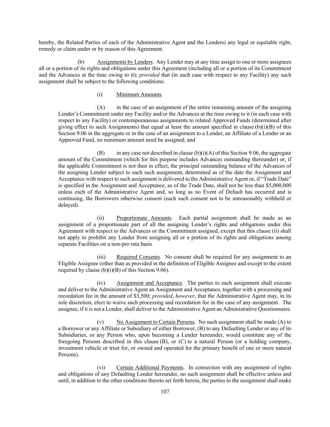 107 hereby, the Related Parties of each of the Administrative Agent and the Lenders) any legal or equitable right, remedy or claim under or by reason of this Agreement. (b) Assignments by Lenders. Any Lender may at any time assign to one or more assignees all or a portion of its rights and obligations under this Agreement (including all or a portion of its Commitment and the Advances at the time owing to it); provided that (in each case with respect to any Facility) any such assignment shall be subject to the following conditions: (i) Minimum Amounts. (A) in the case of an assignment of the entire remaining amount of the assigning Lender’s Commitment under any Facility and/or the Advances at the time owing to it (in each case with respect to any Facility) or contemporaneous assignments to related Approved Funds (determined after giving effect to such Assignments) that equal at least the amount specified in clause (b)(i)(B) of this Section 9.06 in the aggregate or in the case of an assignment to a Lender, an Affiliate of a Lender or an Approved Fund, no minimum amount need be assigned; and (B) in any case not described in clause (b)(i)(A) of this Section 9.06, the aggregate amount of the Commitment (which for this purpose includes Advances outstanding thereunder) or, if the applicable Commitment is not then in effect, the principal outstanding balance of the Advances of the assigning Lender subject to each such assignment, determined as of the date the Assignment and Acceptance with respect to such assignment is delivered to the Administrative Agent or, if “Trade Date” is specified in the Assignment and Acceptance, as of the Trade Date, shall not be less than $5,000,000 unless each of the Administrative Agent and, so long as no Event of Default has occurred and is continuing, the Borrowers otherwise consent (each such consent not to be unreasonably withheld or delayed). (ii) Proportionate Amounts. Each partial assignment shall be made as an assignment of a proportionate part of all the assigning Lender’s rights and obligations under this Agreement with respect to the Advances or the Commitment assigned, except that this clause (ii) shall not apply to prohibit any Lender from assigning all or a portion of its rights and obligations among separate Facilities on a non-pro rata basis (iii) Required Consents. No consent shall be required for any assignment to an Eligible Assignee (other than as provided in the definition of Eligible Assignee and except to the extent required by clause (b)(i)(B) of this Section 9.06). (iv) Assignment and Acceptance. The parties to each assignment shall execute and deliver to the Administrative Agent an Assignment and Acceptance, together with a processing and recordation fee in the amount of $3,500; provided, however, that the Administrative Agent may, in its sole discretion, elect to waive such processing and recordation fee in the case of any assignment. The assignee, if it is not a Lender, shall deliver to the Administrative Agent an Administrative Questionnaire. (v) No Assignment to Certain Persons. No such assignment shall be made (A) to a Borrower or any Affiliate or Subsidiary of either Borrower, (B) to any Defaulting Lender or any of its Subsidiaries, or any Person who, upon becoming a Lender hereunder, would constitute any of the foregoing Persons described in this clause (B), or (C) to a natural Person (or a holding company, investment vehicle or trust for, or owned and operated for the primary benefit of one or more natural Persons). (vi) Certain Additional Payments. In connection with any assignment of rights and obligations of any Defaulting Lender hereunder, no such assignment shall be effective unless and until, in addition to the other conditions thereto set forth herein, the parties to the assignment shall make