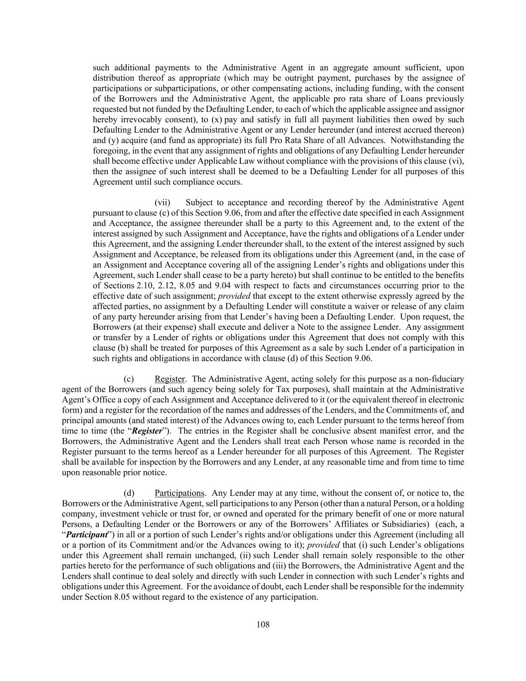 108 such additional payments to the Administrative Agent in an aggregate amount sufficient, upon distribution thereof as appropriate (which may be outright payment, purchases by the assignee of participations or subparticipations, or other compensating actions, including funding, with the consent of the Borrowers and the Administrative Agent, the applicable pro rata share of Loans previously requested but not funded by the Defaulting Lender, to each of which the applicable assignee and assignor hereby irrevocably consent), to (x) pay and satisfy in full all payment liabilities then owed by such Defaulting Lender to the Administrative Agent or any Lender hereunder (and interest accrued thereon) and (y) acquire (and fund as appropriate) its full Pro Rata Share of all Advances. Notwithstanding the foregoing, in the event that any assignment of rights and obligations of any Defaulting Lender hereunder shall become effective under Applicable Law without compliance with the provisions of this clause (vi), then the assignee of such interest shall be deemed to be a Defaulting Lender for all purposes of this Agreement until such compliance occurs. (vii) Subject to acceptance and recording thereof by the Administrative Agent pursuant to clause (c) of this Section 9.06, from and after the effective date specified in each Assignment and Acceptance, the assignee thereunder shall be a party to this Agreement and, to the extent of the interest assigned by such Assignment and Acceptance, have the rights and obligations of a Lender under this Agreement, and the assigning Lender thereunder shall, to the extent of the interest assigned by such Assignment and Acceptance, be released from its obligations under this Agreement (and, in the case of an Assignment and Acceptance covering all of the assigning Lender’s rights and obligations under this Agreement, such Lender shall cease to be a party hereto) but shall continue to be entitled to the benefits of Sections 2.10, 2.12, 8.05 and 9.04 with respect to facts and circumstances occurring prior to the effective date of such assignment; provided that except to the extent otherwise expressly agreed by the affected parties, no assignment by a Defaulting Lender will constitute a waiver or release of any claim of any party hereunder arising from that Lender’s having been a Defaulting Lender. Upon request, the Borrowers (at their expense) shall execute and deliver a Note to the assignee Lender. Any assignment or transfer by a Lender of rights or obligations under this Agreement that does not comply with this clause (b) shall be treated for purposes of this Agreement as a sale by such Lender of a participation in such rights and obligations in accordance with clause (d) of this Section 9.06. (c) Register. The Administrative Agent, acting solely for this purpose as a non-fiduciary agent of the Borrowers (and such agency being solely for Tax purposes), shall maintain at the Administrative Agent’s Office a copy of each Assignment and Acceptance delivered to it (or the equivalent thereof in electronic form) and a register for the recordation of the names and addresses of the Lenders, and the Commitments of, and principal amounts (and stated interest) of the Advances owing to, each Lender pursuant to the terms hereof from time to time (the “Register”). The entries in the Register shall be conclusive absent manifest error, and the Borrowers, the Administrative Agent and the Lenders shall treat each Person whose name is recorded in the Register pursuant to the terms hereof as a Lender hereunder for all purposes of this Agreement. The Register shall be available for inspection by the Borrowers and any Lender, at any reasonable time and from time to time upon reasonable prior notice. (d) Participations. Any Lender may at any time, without the consent of, or notice to, the Borrowers or the Administrative Agent, sell participations to any Person (other than a natural Person, or a holding company, investment vehicle or trust for, or owned and operated for the primary benefit of one or more natural Persons, a Defaulting Lender or the Borrowers or any of the Borrowers’ Affiliates or Subsidiaries) (each, a “Participant”) in all or a portion of such Lender’s rights and/or obligations under this Agreement (including all or a portion of its Commitment and/or the Advances owing to it); provided that (i) such Lender’s obligations under this Agreement shall remain unchanged, (ii) such Lender shall remain solely responsible to the other parties hereto for the performance of such obligations and (iii) the Borrowers, the Administrative Agent and the Lenders shall continue to deal solely and directly with such Lender in connection with such Lender’s rights and obligations under this Agreement. For the avoidance of doubt, each Lender shall be responsible for the indemnity under Section 8.05 without regard to the existence of any participation.