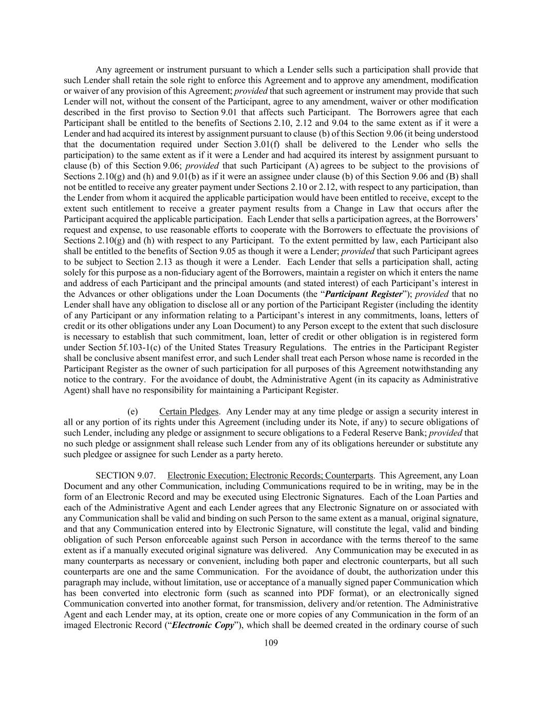109 Any agreement or instrument pursuant to which a Lender sells such a participation shall provide that such Lender shall retain the sole right to enforce this Agreement and to approve any amendment, modification or waiver of any provision of this Agreement; provided that such agreement or instrument may provide that such Lender will not, without the consent of the Participant, agree to any amendment, waiver or other modification described in the first proviso to Section 9.01 that affects such Participant. The Borrowers agree that each Participant shall be entitled to the benefits of Sections 2.10, 2.12 and 9.04 to the same extent as if it were a Lender and had acquired its interest by assignment pursuant to clause (b) of this Section 9.06 (it being understood that the documentation required under Section 3.01(f) shall be delivered to the Lender who sells the participation) to the same extent as if it were a Lender and had acquired its interest by assignment pursuant to clause (b) of this Section 9.06; provided that such Participant (A) agrees to be subject to the provisions of Sections 2.10(g) and (h) and 9.01(b) as if it were an assignee under clause (b) of this Section 9.06 and (B) shall not be entitled to receive any greater payment under Sections 2.10 or 2.12, with respect to any participation, than the Lender from whom it acquired the applicable participation would have been entitled to receive, except to the extent such entitlement to receive a greater payment results from a Change in Law that occurs after the Participant acquired the applicable participation. Each Lender that sells a participation agrees, at the Borrowers’ request and expense, to use reasonable efforts to cooperate with the Borrowers to effectuate the provisions of Sections 2.10(g) and (h) with respect to any Participant. To the extent permitted by law, each Participant also shall be entitled to the benefits of Section 9.05 as though it were a Lender; provided that such Participant agrees to be subject to Section 2.13 as though it were a Lender. Each Lender that sells a participation shall, acting solely for this purpose as a non-fiduciary agent of the Borrowers, maintain a register on which it enters the name and address of each Participant and the principal amounts (and stated interest) of each Participant’s interest in the Advances or other obligations under the Loan Documents (the “Participant Register”); provided that no Lender shall have any obligation to disclose all or any portion of the Participant Register (including the identity of any Participant or any information relating to a Participant’s interest in any commitments, loans, letters of credit or its other obligations under any Loan Document) to any Person except to the extent that such disclosure is necessary to establish that such commitment, loan, letter of credit or other obligation is in registered form under Section 5f.103-1(c) of the United States Treasury Regulations. The entries in the Participant Register shall be conclusive absent manifest error, and such Lender shall treat each Person whose name is recorded in the Participant Register as the owner of such participation for all purposes of this Agreement notwithstanding any notice to the contrary. For the avoidance of doubt, the Administrative Agent (in its capacity as Administrative Agent) shall have no responsibility for maintaining a Participant Register. (e) Certain Pledges. Any Lender may at any time pledge or assign a security interest in all or any portion of its rights under this Agreement (including under its Note, if any) to secure obligations of such Lender, including any pledge or assignment to secure obligations to a Federal Reserve Bank; provided that no such pledge or assignment shall release such Lender from any of its obligations hereunder or substitute any such pledgee or assignee for such Lender as a party hereto. SECTION 9.07. Electronic Execution; Electronic Records; Counterparts. This Agreement, any Loan Document and any other Communication, including Communications required to be in writing, may be in the form of an Electronic Record and may be executed using Electronic Signatures. Each of the Loan Parties and each of the Administrative Agent and each Lender agrees that any Electronic Signature on or associated with any Communication shall be valid and binding on such Person to the same extent as a manual, original signature, and that any Communication entered into by Electronic Signature, will constitute the legal, valid and binding obligation of such Person enforceable against such Person in accordance with the terms thereof to the same extent as if a manually executed original signature was delivered. Any Communication may be executed in as many counterparts as necessary or convenient, including both paper and electronic counterparts, but all such counterparts are one and the same Communication. For the avoidance of doubt, the authorization under this paragraph may include, without limitation, use or acceptance of a manually signed paper Communication which has been converted into electronic form (such as scanned into PDF format), or an electronically signed Communication converted into another format, for transmission, delivery and/or retention. The Administrative Agent and each Lender may, at its option, create one or more copies of any Communication in the form of an imaged Electronic Record (“Electronic Copy”), which shall be deemed created in the ordinary course of such
