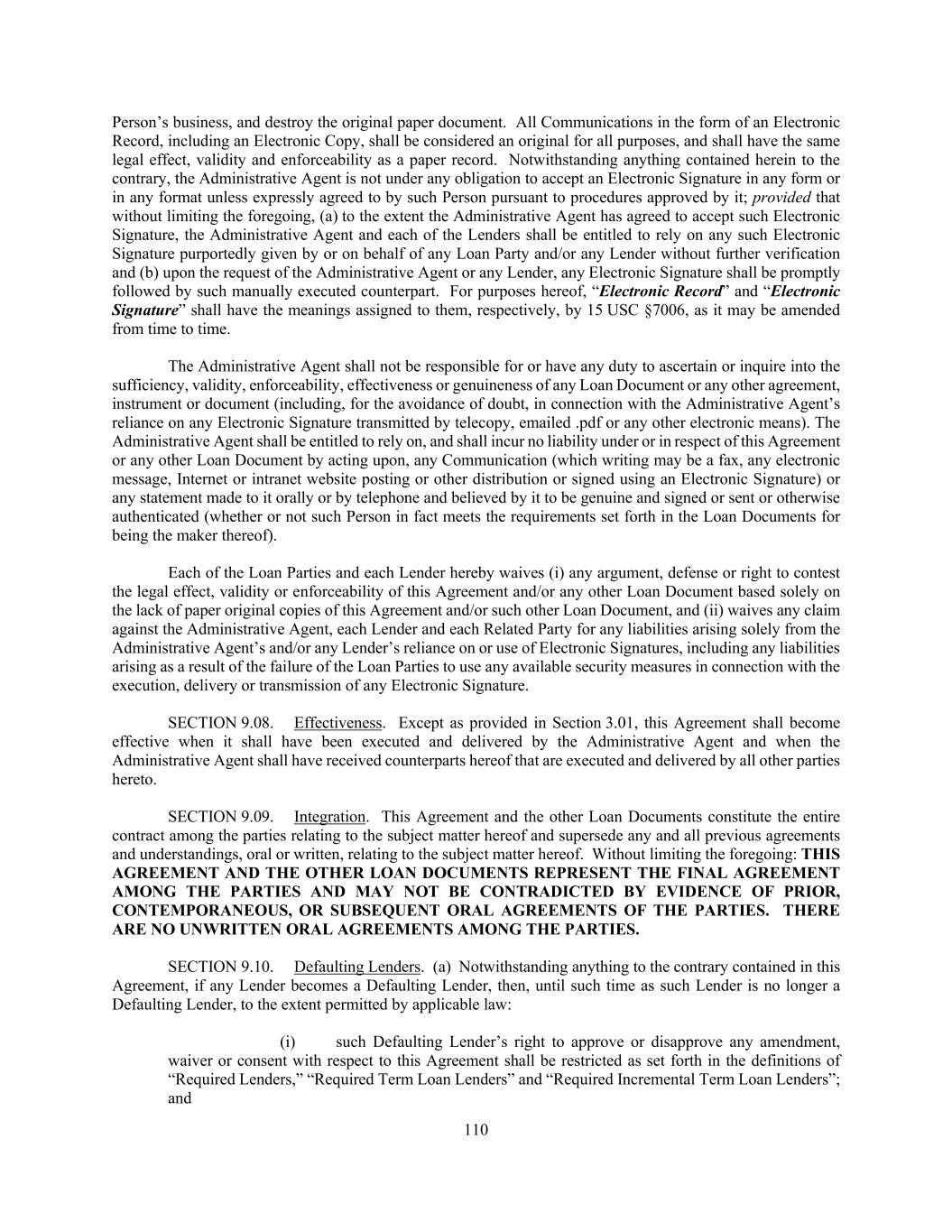 110 Person’s business, and destroy the original paper document. All Communications in the form of an Electronic Record, including an Electronic Copy, shall be considered an original for all purposes, and shall have the same legal effect, validity and enforceability as a paper record. Notwithstanding anything contained herein to the contrary, the Administrative Agent is not under any obligation to accept an Electronic Signature in any form or in any format unless expressly agreed to by such Person pursuant to procedures approved by it; provided that without limiting the foregoing, (a) to the extent the Administrative Agent has agreed to accept such Electronic Signature, the Administrative Agent and each of the Lenders shall be entitled to rely on any such Electronic Signature purportedly given by or on behalf of any Loan Party and/or any Lender without further verification and (b) upon the request of the Administrative Agent or any Lender, any Electronic Signature shall be promptly followed by such manually executed counterpart. For purposes hereof, “Electronic Record” and “Electronic Signature” shall have the meanings assigned to them, respectively, by 15 USC §7006, as it may be amended from time to time. The Administrative Agent shall not be responsible for or have any duty to ascertain or inquire into the sufficiency, validity, enforceability, effectiveness or genuineness of any Loan Document or any other agreement, instrument or document (including, for the avoidance of doubt, in connection with the Administrative Agent’s reliance on any Electronic Signature transmitted by telecopy, emailed .pdf or any other electronic means). The Administrative Agent shall be entitled to rely on, and shall incur no liability under or in respect of this Agreement or any other Loan Document by acting upon, any Communication (which writing may be a fax, any electronic message, Internet or intranet website posting or other distribution or signed using an Electronic Signature) or any statement made to it orally or by telephone and believed by it to be genuine and signed or sent or otherwise authenticated (whether or not such Person in fact meets the requirements set forth in the Loan Documents for being the maker thereof). Each of the Loan Parties and each Lender hereby waives (i) any argument, defense or right to contest the legal effect, validity or enforceability of this Agreement and/or any other Loan Document based solely on the lack of paper original copies of this Agreement and/or such other Loan Document, and (ii) waives any claim against the Administrative Agent, each Lender and each Related Party for any liabilities arising solely from the Administrative Agent’s and/or any Lender’s reliance on or use of Electronic Signatures, including any liabilities arising as a result of the failure of the Loan Parties to use any available security measures in connection with the execution, delivery or transmission of any Electronic Signature. SECTION 9.08. Effectiveness. Except as provided in Section 3.01, this Agreement shall become effective when it shall have been executed and delivered by the Administrative Agent and when the Administrative Agent shall have received counterparts hereof that are executed and delivered by all other parties hereto. SECTION 9.09. Integration. This Agreement and the other Loan Documents constitute the entire contract among the parties relating to the subject matter hereof and supersede any and all previous agreements and understandings, oral or written, relating to the subject matter hereof. Without limiting the foregoing: THIS AGREEMENT AND THE OTHER LOAN DOCUMENTS REPRESENT THE FINAL AGREEMENT AMONG THE PARTIES AND MAY NOT BE CONTRADICTED BY EVIDENCE OF PRIOR, CONTEMPORANEOUS, OR SUBSEQUENT ORAL AGREEMENTS OF THE PARTIES. THERE ARE NO UNWRITTEN ORAL AGREEMENTS AMONG THE PARTIES. SECTION 9.10. Defaulting Lenders. (a) Notwithstanding anything to the contrary contained in this Agreement, if any Lender becomes a Defaulting Lender, then, until such time as such Lender is no longer a Defaulting Lender, to the extent permitted by applicable law: (i) such Defaulting Lender’s right to approve or disapprove any amendment, waiver or consent with respect to this Agreement shall be restricted as set forth in the definitions of “Required Lenders,” “Required Term Loan Lenders” and “Required Incremental Term Loan Lenders”; and