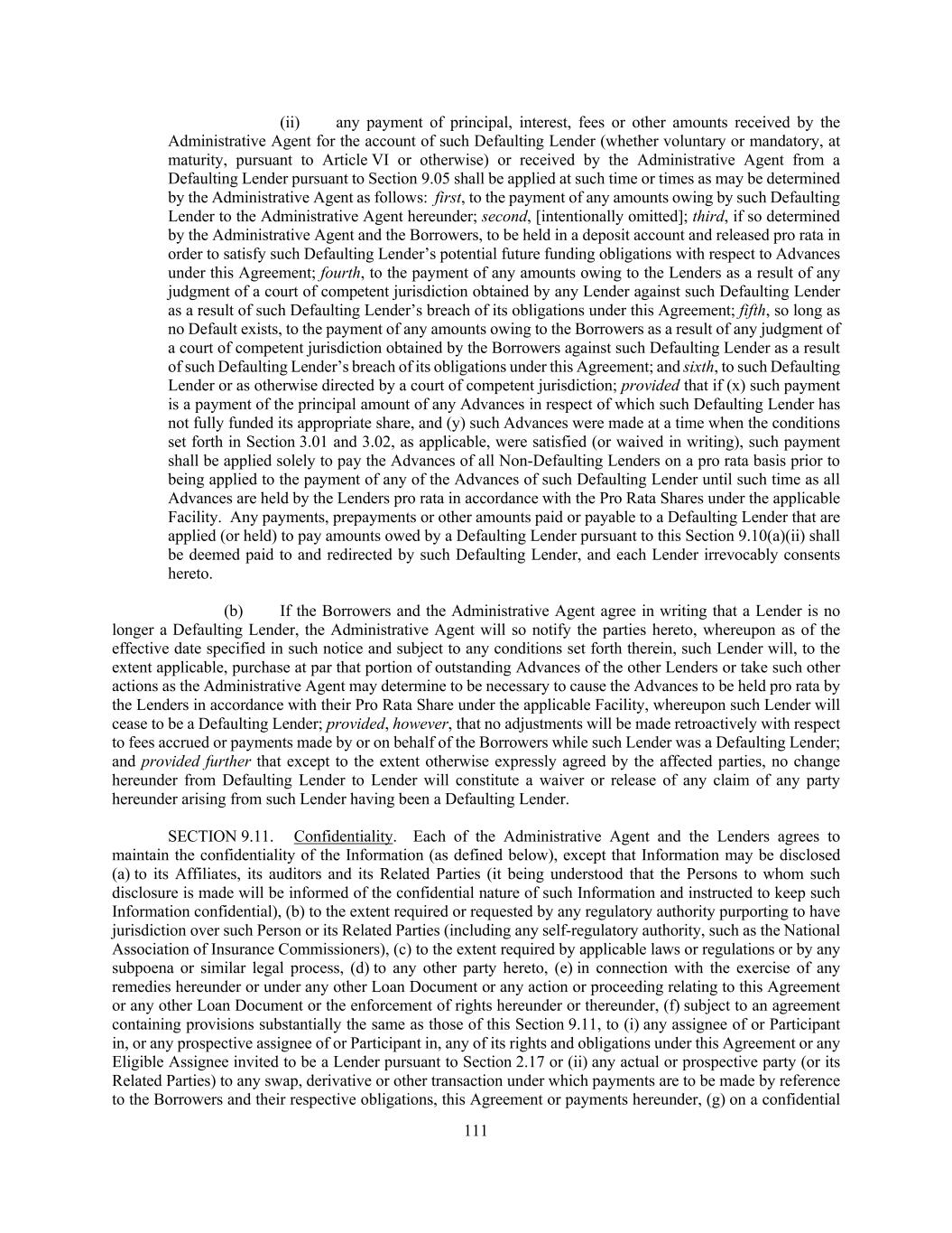 111 (ii) any payment of principal, interest, fees or other amounts received by the Administrative Agent for the account of such Defaulting Lender (whether voluntary or mandatory, at maturity, pursuant to Article VI or otherwise) or received by the Administrative Agent from a Defaulting Lender pursuant to Section 9.05 shall be applied at such time or times as may be determined by the Administrative Agent as follows: first, to the payment of any amounts owing by such Defaulting Lender to the Administrative Agent hereunder; second, [intentionally omitted]; third, if so determined by the Administrative Agent and the Borrowers, to be held in a deposit account and released pro rata in order to satisfy such Defaulting Lender’s potential future funding obligations with respect to Advances under this Agreement; fourth, to the payment of any amounts owing to the Lenders as a result of any judgment of a court of competent jurisdiction obtained by any Lender against such Defaulting Lender as a result of such Defaulting Lender’s breach of its obligations under this Agreement; fifth, so long as no Default exists, to the payment of any amounts owing to the Borrowers as a result of any judgment of a court of competent jurisdiction obtained by the Borrowers against such Defaulting Lender as a result of such Defaulting Lender’s breach of its obligations under this Agreement; and sixth, to such Defaulting Lender or as otherwise directed by a court of competent jurisdiction; provided that if (x) such payment is a payment of the principal amount of any Advances in respect of which such Defaulting Lender has not fully funded its appropriate share, and (y) such Advances were made at a time when the conditions set forth in Section 3.01 and 3.02, as applicable, were satisfied (or waived in writing), such payment shall be applied solely to pay the Advances of all Non-Defaulting Lenders on a pro rata basis prior to being applied to the payment of any of the Advances of such Defaulting Lender until such time as all Advances are held by the Lenders pro rata in accordance with the Pro Rata Shares under the applicable Facility. Any payments, prepayments or other amounts paid or payable to a Defaulting Lender that are applied (or held) to pay amounts owed by a Defaulting Lender pursuant to this Section 9.10(a)(ii) shall be deemed paid to and redirected by such Defaulting Lender, and each Lender irrevocably consents hereto. (b) If the Borrowers and the Administrative Agent agree in writing that a Lender is no longer a Defaulting Lender, the Administrative Agent will so notify the parties hereto, whereupon as of the effective date specified in such notice and subject to any conditions set forth therein, such Lender will, to the extent applicable, purchase at par that portion of outstanding Advances of the other Lenders or take such other actions as the Administrative Agent may determine to be necessary to cause the Advances to be held pro rata by the Lenders in accordance with their Pro Rata Share under the applicable Facility, whereupon such Lender will cease to be a Defaulting Lender; provided, however, that no adjustments will be made retroactively with respect to fees accrued or payments made by or on behalf of the Borrowers while such Lender was a Defaulting Lender; and provided further that except to the extent otherwise expressly agreed by the affected parties, no change hereunder from Defaulting Lender to Lender will constitute a waiver or release of any claim of any party hereunder arising from such Lender having been a Defaulting Lender. SECTION 9.11. Confidentiality. Each of the Administrative Agent and the Lenders agrees to maintain the confidentiality of the Information (as defined below), except that Information may be disclosed (a) to its Affiliates, its auditors and its Related Parties (it being understood that the Persons to whom such disclosure is made will be informed of the confidential nature of such Information and instructed to keep such Information confidential), (b) to the extent required or requested by any regulatory authority purporting to have jurisdiction over such Person or its Related Parties (including any self-regulatory authority, such as the National Association of Insurance Commissioners), (c) to the extent required by applicable laws or regulations or by any subpoena or similar legal process, (d) to any other party hereto, (e) in connection with the exercise of any remedies hereunder or under any other Loan Document or any action or proceeding relating to this Agreement or any other Loan Document or the enforcement of rights hereunder or thereunder, (f) subject to an agreement containing provisions substantially the same as those of this Section 9.11, to (i) any assignee of or Participant in, or any prospective assignee of or Participant in, any of its rights and obligations under this Agreement or any Eligible Assignee invited to be a Lender pursuant to Section 2.17 or (ii) any actual or prospective party (or its Related Parties) to any swap, derivative or other transaction under which payments are to be made by reference to the Borrowers and their respective obligations, this Agreement or payments hereunder, (g) on a confidential
