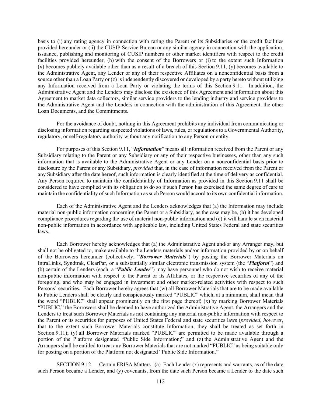 112 basis to (i) any rating agency in connection with rating the Parent or its Subsidiaries or the credit facilities provided hereunder or (ii) the CUSIP Service Bureau or any similar agency in connection with the application, issuance, publishing and monitoring of CUSIP numbers or other market identifiers with respect to the credit facilities provided hereunder, (h) with the consent of the Borrowers or (i) to the extent such Information (x) becomes publicly available other than as a result of a breach of this Section 9.11, (y) becomes available to the Administrative Agent, any Lender or any of their respective Affiliates on a nonconfidential basis from a source other than a Loan Party or (z) is independently discovered or developed by a party hereto without utilizing any Information received from a Loan Party or violating the terms of this Section 9.11. In addition, the Administrative Agent and the Lenders may disclose the existence of this Agreement and information about this Agreement to market data collectors, similar service providers to the lending industry and service providers to the Administrative Agent and the Lenders in connection with the administration of this Agreement, the other Loan Documents, and the Commitments. For the avoidance of doubt, nothing in this Agreement prohibits any individual from communicating or disclosing information regarding suspected violations of laws, rules, or regulations to a Governmental Authority, regulatory, or self-regulatory authority without any notification to any Person or entity. For purposes of this Section 9.11, “Information” means all information received from the Parent or any Subsidiary relating to the Parent or any Subsidiary or any of their respective businesses, other than any such information that is available to the Administrative Agent or any Lender on a nonconfidential basis prior to disclosure by the Parent or any Subsidiary, provided that, in the case of information received from the Parent or any Subsidiary after the date hereof, such information is clearly identified at the time of delivery as confidential. Any Person required to maintain the confidentiality of Information as provided in this Section 9.11 shall be considered to have complied with its obligation to do so if such Person has exercised the same degree of care to maintain the confidentiality of such Information as such Person would accord to its own confidential information. Each of the Administrative Agent and the Lenders acknowledges that (a) the Information may include material non-public information concerning the Parent or a Subsidiary, as the case may be, (b) it has developed compliance procedures regarding the use of material non-public information and (c) it will handle such material non-public information in accordance with applicable law, including United States Federal and state securities laws. Each Borrower hereby acknowledges that (a) the Administrative Agent and/or any Arranger may, but shall not be obligated to, make available to the Lenders materials and/or information provided by or on behalf of the Borrowers hereunder (collectively, “Borrower Materials”) by posting the Borrower Materials on IntraLinks, Syndtrak, ClearPar, or a substantially similar electronic transmission system (the “Platform”) and (b) certain of the Lenders (each, a “Public Lender”) may have personnel who do not wish to receive material non-public information with respect to the Parent or its Affiliates, or the respective securities of any of the foregoing, and who may be engaged in investment and other market-related activities with respect to such Persons’ securities. Each Borrower hereby agrees that (w) all Borrower Materials that are to be made available to Public Lenders shall be clearly and conspicuously marked “PUBLIC” which, at a minimum, shall mean that the word “PUBLIC” shall appear prominently on the first page thereof; (x) by marking Borrower Materials “PUBLIC,” the Borrowers shall be deemed to have authorized the Administrative Agent, the Arrangers and the Lenders to treat such Borrower Materials as not containing any material non-public information with respect to the Parent or its securities for purposes of United States Federal and state securities laws (provided, however, that to the extent such Borrower Materials constitute Information, they shall be treated as set forth in Section 9.11); (y) all Borrower Materials marked “PUBLIC” are permitted to be made available through a portion of the Platform designated “Public Side Information;” and (z) the Administrative Agent and the Arrangers shall be entitled to treat any Borrower Materials that are not marked “PUBLIC” as being suitable only for posting on a portion of the Platform not designated “Public Side Information.” SECTION 9.12. Certain ERISA Matters. (a) Each Lender (x) represents and warrants, as of the date such Person became a Lender, and (y) covenants, from the date such Person became a Lender to the date such