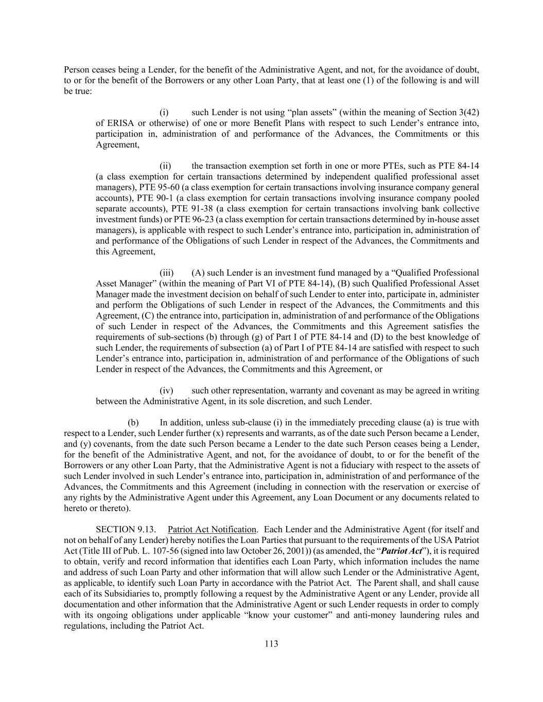 113 Person ceases being a Lender, for the benefit of the Administrative Agent, and not, for the avoidance of doubt, to or for the benefit of the Borrowers or any other Loan Party, that at least one (1) of the following is and will be true: (i) such Lender is not using “plan assets” (within the meaning of Section 3(42) of ERISA or otherwise) of one or more Benefit Plans with respect to such Lender’s entrance into, participation in, administration of and performance of the Advances, the Commitments or this Agreement, (ii) the transaction exemption set forth in one or more PTEs, such as PTE 84-14 (a class exemption for certain transactions determined by independent qualified professional asset managers), PTE 95-60 (a class exemption for certain transactions involving insurance company general accounts), PTE 90-1 (a class exemption for certain transactions involving insurance company pooled separate accounts), PTE 91-38 (a class exemption for certain transactions involving bank collective investment funds) or PTE 96-23 (a class exemption for certain transactions determined by in-house asset managers), is applicable with respect to such Lender’s entrance into, participation in, administration of and performance of the Obligations of such Lender in respect of the Advances, the Commitments and this Agreement, (iii) (A) such Lender is an investment fund managed by a “Qualified Professional Asset Manager” (within the meaning of Part VI of PTE 84-14), (B) such Qualified Professional Asset Manager made the investment decision on behalf of such Lender to enter into, participate in, administer and perform the Obligations of such Lender in respect of the Advances, the Commitments and this Agreement, (C) the entrance into, participation in, administration of and performance of the Obligations of such Lender in respect of the Advances, the Commitments and this Agreement satisfies the requirements of sub-sections (b) through (g) of Part I of PTE 84-14 and (D) to the best knowledge of such Lender, the requirements of subsection (a) of Part I of PTE 84-14 are satisfied with respect to such Lender’s entrance into, participation in, administration of and performance of the Obligations of such Lender in respect of the Advances, the Commitments and this Agreement, or (iv) such other representation, warranty and covenant as may be agreed in writing between the Administrative Agent, in its sole discretion, and such Lender. (b) In addition, unless sub-clause (i) in the immediately preceding clause (a) is true with respect to a Lender, such Lender further (x) represents and warrants, as of the date such Person became a Lender, and (y) covenants, from the date such Person became a Lender to the date such Person ceases being a Lender, for the benefit of the Administrative Agent, and not, for the avoidance of doubt, to or for the benefit of the Borrowers or any other Loan Party, that the Administrative Agent is not a fiduciary with respect to the assets of such Lender involved in such Lender’s entrance into, participation in, administration of and performance of the Advances, the Commitments and this Agreement (including in connection with the reservation or exercise of any rights by the Administrative Agent under this Agreement, any Loan Document or any documents related to hereto or thereto). SECTION 9.13. Patriot Act Notification. Each Lender and the Administrative Agent (for itself and not on behalf of any Lender) hereby notifies the Loan Parties that pursuant to the requirements of the USA Patriot Act (Title III of Pub. L. 107-56 (signed into law October 26, 2001)) (as amended, the “Patriot Act”), it is required to obtain, verify and record information that identifies each Loan Party, which information includes the name and address of such Loan Party and other information that will allow such Lender or the Administrative Agent, as applicable, to identify such Loan Party in accordance with the Patriot Act. The Parent shall, and shall cause each of its Subsidiaries to, promptly following a request by the Administrative Agent or any Lender, provide all documentation and other information that the Administrative Agent or such Lender requests in order to comply with its ongoing obligations under applicable “know your customer” and anti-money laundering rules and regulations, including the Patriot Act.