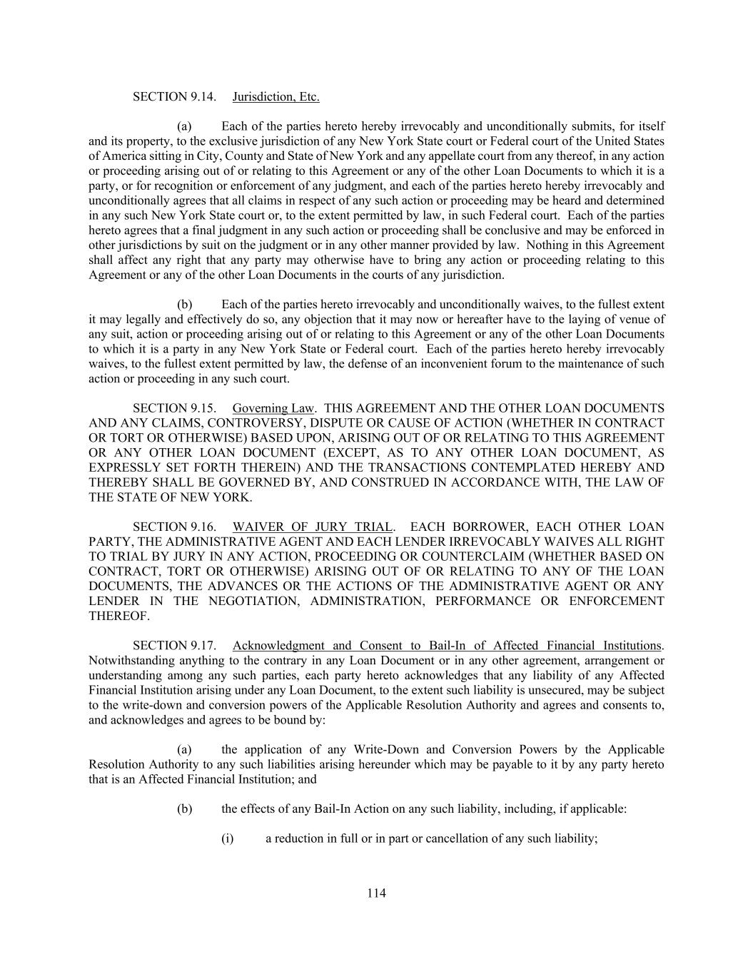 114 SECTION 9.14. Jurisdiction, Etc. (a) Each of the parties hereto hereby irrevocably and unconditionally submits, for itself and its property, to the exclusive jurisdiction of any New York State court or Federal court of the United States of America sitting in City, County and State of New York and any appellate court from any thereof, in any action or proceeding arising out of or relating to this Agreement or any of the other Loan Documents to which it is a party, or for recognition or enforcement of any judgment, and each of the parties hereto hereby irrevocably and unconditionally agrees that all claims in respect of any such action or proceeding may be heard and determined in any such New York State court or, to the extent permitted by law, in such Federal court. Each of the parties hereto agrees that a final judgment in any such action or proceeding shall be conclusive and may be enforced in other jurisdictions by suit on the judgment or in any other manner provided by law. Nothing in this Agreement shall affect any right that any party may otherwise have to bring any action or proceeding relating to this Agreement or any of the other Loan Documents in the courts of any jurisdiction. (b) Each of the parties hereto irrevocably and unconditionally waives, to the fullest extent it may legally and effectively do so, any objection that it may now or hereafter have to the laying of venue of any suit, action or proceeding arising out of or relating to this Agreement or any of the other Loan Documents to which it is a party in any New York State or Federal court. Each of the parties hereto hereby irrevocably waives, to the fullest extent permitted by law, the defense of an inconvenient forum to the maintenance of such action or proceeding in any such court. SECTION 9.15. Governing Law. THIS AGREEMENT AND THE OTHER LOAN DOCUMENTS AND ANY CLAIMS, CONTROVERSY, DISPUTE OR CAUSE OF ACTION (WHETHER IN CONTRACT OR TORT OR OTHERWISE) BASED UPON, ARISING OUT OF OR RELATING TO THIS AGREEMENT OR ANY OTHER LOAN DOCUMENT (EXCEPT, AS TO ANY OTHER LOAN DOCUMENT, AS EXPRESSLY SET FORTH THEREIN) AND THE TRANSACTIONS CONTEMPLATED HEREBY AND THEREBY SHALL BE GOVERNED BY, AND CONSTRUED IN ACCORDANCE WITH, THE LAW OF THE STATE OF NEW YORK. SECTION 9.16. WAIVER OF JURY TRIAL. EACH BORROWER, EACH OTHER LOAN PARTY, THE ADMINISTRATIVE AGENT AND EACH LENDER IRREVOCABLY WAIVES ALL RIGHT TO TRIAL BY JURY IN ANY ACTION, PROCEEDING OR COUNTERCLAIM (WHETHER BASED ON CONTRACT, TORT OR OTHERWISE) ARISING OUT OF OR RELATING TO ANY OF THE LOAN DOCUMENTS, THE ADVANCES OR THE ACTIONS OF THE ADMINISTRATIVE AGENT OR ANY LENDER IN THE NEGOTIATION, ADMINISTRATION, PERFORMANCE OR ENFORCEMENT THEREOF. SECTION 9.17. Acknowledgment and Consent to Bail-In of Affected Financial Institutions. Notwithstanding anything to the contrary in any Loan Document or in any other agreement, arrangement or understanding among any such parties, each party hereto acknowledges that any liability of any Affected Financial Institution arising under any Loan Document, to the extent such liability is unsecured, may be subject to the write-down and conversion powers of the Applicable Resolution Authority and agrees and consents to, and acknowledges and agrees to be bound by: (a) the application of any Write-Down and Conversion Powers by the Applicable Resolution Authority to any such liabilities arising hereunder which may be payable to it by any party hereto that is an Affected Financial Institution; and (b) the effects of any Bail-In Action on any such liability, including, if applicable: (i) a reduction in full or in part or cancellation of any such liability;