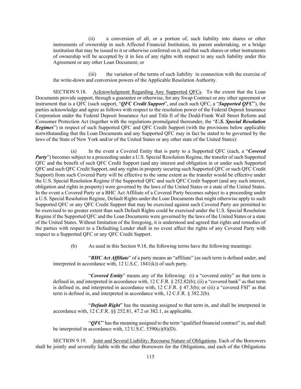 115 (ii) a conversion of all, or a portion of, such liability into shares or other instruments of ownership in such Affected Financial Institution, its parent undertaking, or a bridge institution that may be issued to it or otherwise conferred on it, and that such shares or other instruments of ownership will be accepted by it in lieu of any rights with respect to any such liability under this Agreement or any other Loan Document; or (iii) the variation of the terms of such liability in connection with the exercise of the write-down and conversion powers of the Applicable Resolution Authority. SECTION 9.18. Acknowledgment Regarding Any Supported QFCs. To the extent that the Loan Documents provide support, through a guarantee or otherwise, for any Swap Contract or any other agreement or instrument that is a QFC (such support, “QFC Credit Support”, and each such QFC, a “Supported QFC”), the parties acknowledge and agree as follows with respect to the resolution power of the Federal Deposit Insurance Corporation under the Federal Deposit Insurance Act and Title II of the Dodd-Frank Wall Street Reform and Consumer Protection Act (together with the regulations promulgated thereunder, the “U.S. Special Resolution Regimes”) in respect of such Supported QFC and QFC Credit Support (with the provisions below applicable notwithstanding that the Loan Documents and any Supported QFC may in fact be stated to be governed by the laws of the State of New York and/or of the United States or any other state of the United States): (a) In the event a Covered Entity that is party to a Supported QFC (each, a “Covered Party”) becomes subject to a proceeding under a U.S. Special Resolution Regime, the transfer of such Supported QFC and the benefit of such QFC Credit Support (and any interest and obligation in or under such Supported QFC and such QFC Credit Support, and any rights in property securing such Supported QFC or such QFC Credit Support) from such Covered Party will be effective to the same extent as the transfer would be effective under the U.S. Special Resolution Regime if the Supported QFC and such QFC Credit Support (and any such interest, obligation and rights in property) were governed by the laws of the United States or a state of the United States. In the event a Covered Party or a BHC Act Affiliate of a Covered Party becomes subject to a proceeding under a U.S. Special Resolution Regime, Default Rights under the Loan Documents that might otherwise apply to such Supported QFC or any QFC Credit Support that may be exercised against such Covered Party are permitted to be exercised to no greater extent than such Default Rights could be exercised under the U.S. Special Resolution Regime if the Supported QFC and the Loan Documents were governed by the laws of the United States or a state of the United States. Without limitation of the foregoing, it is understood and agreed that rights and remedies of the parties with respect to a Defaulting Lender shall in no event affect the rights of any Covered Party with respect to a Supported QFC or any QFC Credit Support. (b) As used in this Section 9.18, the following terms have the following meanings: “BHC Act Affiliate” of a party means an “affiliate” (as such term is defined under, and interpreted in accordance with, 12 U.S.C. 1841(k)) of such party. “Covered Entity” means any of the following: (i) a “covered entity” as that term is defined in, and interpreted in accordance with, 12 C.F.R. § 252.82(b); (ii) a “covered bank” as that term is defined in, and interpreted in accordance with, 12 C.F.R. § 47.3(b); or (iii) a “covered FSI” as that term is defined in, and interpreted in accordance with, 12 C.F.R. § 382.2(b). “Default Right” has the meaning assigned to that term in, and shall be interpreted in accordance with, 12 C.F.R. §§ 252.81, 47.2 or 382.1, as applicable. “QFC” has the meaning assigned to the term “qualified financial contract” in, and shall be interpreted in accordance with, 12 U.S.C. 5390(c)(8)(D). SECTION 9.19. Joint and Several Liability; Recourse Nature of Obligations. Each of the Borrowers shall be jointly and severally liable with the other Borrowers for the Obligations, and each of the Obligations