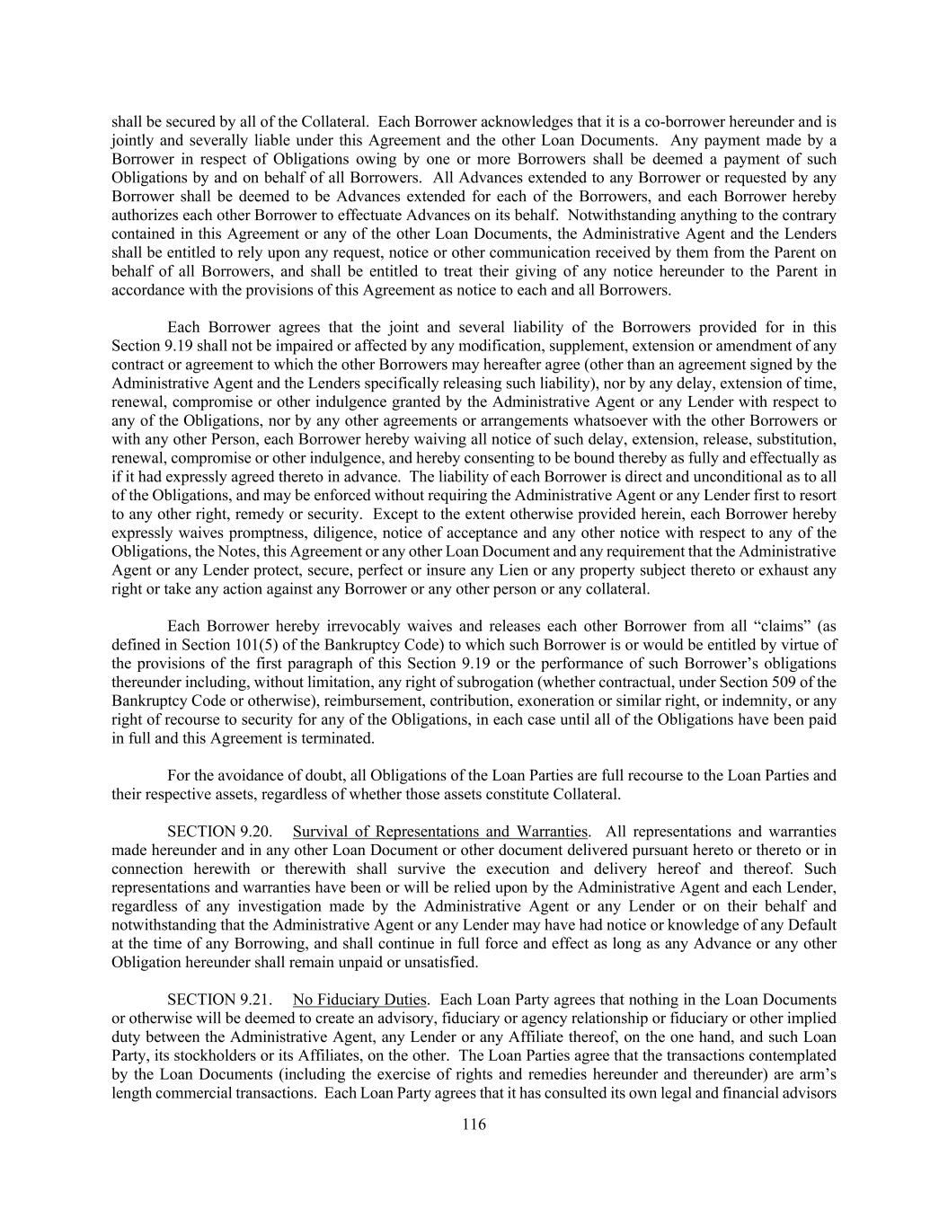 116 shall be secured by all of the Collateral. Each Borrower acknowledges that it is a co-borrower hereunder and is jointly and severally liable under this Agreement and the other Loan Documents. Any payment made by a Borrower in respect of Obligations owing by one or more Borrowers shall be deemed a payment of such Obligations by and on behalf of all Borrowers. All Advances extended to any Borrower or requested by any Borrower shall be deemed to be Advances extended for each of the Borrowers, and each Borrower hereby authorizes each other Borrower to effectuate Advances on its behalf. Notwithstanding anything to the contrary contained in this Agreement or any of the other Loan Documents, the Administrative Agent and the Lenders shall be entitled to rely upon any request, notice or other communication received by them from the Parent on behalf of all Borrowers, and shall be entitled to treat their giving of any notice hereunder to the Parent in accordance with the provisions of this Agreement as notice to each and all Borrowers. Each Borrower agrees that the joint and several liability of the Borrowers provided for in this Section 9.19 shall not be impaired or affected by any modification, supplement, extension or amendment of any contract or agreement to which the other Borrowers may hereafter agree (other than an agreement signed by the Administrative Agent and the Lenders specifically releasing such liability), nor by any delay, extension of time, renewal, compromise or other indulgence granted by the Administrative Agent or any Lender with respect to any of the Obligations, nor by any other agreements or arrangements whatsoever with the other Borrowers or with any other Person, each Borrower hereby waiving all notice of such delay, extension, release, substitution, renewal, compromise or other indulgence, and hereby consenting to be bound thereby as fully and effectually as if it had expressly agreed thereto in advance. The liability of each Borrower is direct and unconditional as to all of the Obligations, and may be enforced without requiring the Administrative Agent or any Lender first to resort to any other right, remedy or security. Except to the extent otherwise provided herein, each Borrower hereby expressly waives promptness, diligence, notice of acceptance and any other notice with respect to any of the Obligations, the Notes, this Agreement or any other Loan Document and any requirement that the Administrative Agent or any Lender protect, secure, perfect or insure any Lien or any property subject thereto or exhaust any right or take any action against any Borrower or any other person or any collateral. Each Borrower hereby irrevocably waives and releases each other Borrower from all “claims” (as defined in Section 101(5) of the Bankruptcy Code) to which such Borrower is or would be entitled by virtue of the provisions of the first paragraph of this Section 9.19 or the performance of such Borrower’s obligations thereunder including, without limitation, any right of subrogation (whether contractual, under Section 509 of the Bankruptcy Code or otherwise), reimbursement, contribution, exoneration or similar right, or indemnity, or any right of recourse to security for any of the Obligations, in each case until all of the Obligations have been paid in full and this Agreement is terminated. For the avoidance of doubt, all Obligations of the Loan Parties are full recourse to the Loan Parties and their respective assets, regardless of whether those assets constitute Collateral. SECTION 9.20. Survival of Representations and Warranties. All representations and warranties made hereunder and in any other Loan Document or other document delivered pursuant hereto or thereto or in connection herewith or therewith shall survive the execution and delivery hereof and thereof. Such representations and warranties have been or will be relied upon by the Administrative Agent and each Lender, regardless of any investigation made by the Administrative Agent or any Lender or on their behalf and notwithstanding that the Administrative Agent or any Lender may have had notice or knowledge of any Default at the time of any Borrowing, and shall continue in full force and effect as long as any Advance or any other Obligation hereunder shall remain unpaid or unsatisfied. SECTION 9.21. No Fiduciary Duties. Each Loan Party agrees that nothing in the Loan Documents or otherwise will be deemed to create an advisory, fiduciary or agency relationship or fiduciary or other implied duty between the Administrative Agent, any Lender or any Affiliate thereof, on the one hand, and such Loan Party, its stockholders or its Affiliates, on the other. The Loan Parties agree that the transactions contemplated by the Loan Documents (including the exercise of rights and remedies hereunder and thereunder) are arm’s length commercial transactions. Each Loan Party agrees that it has consulted its own legal and financial advisors