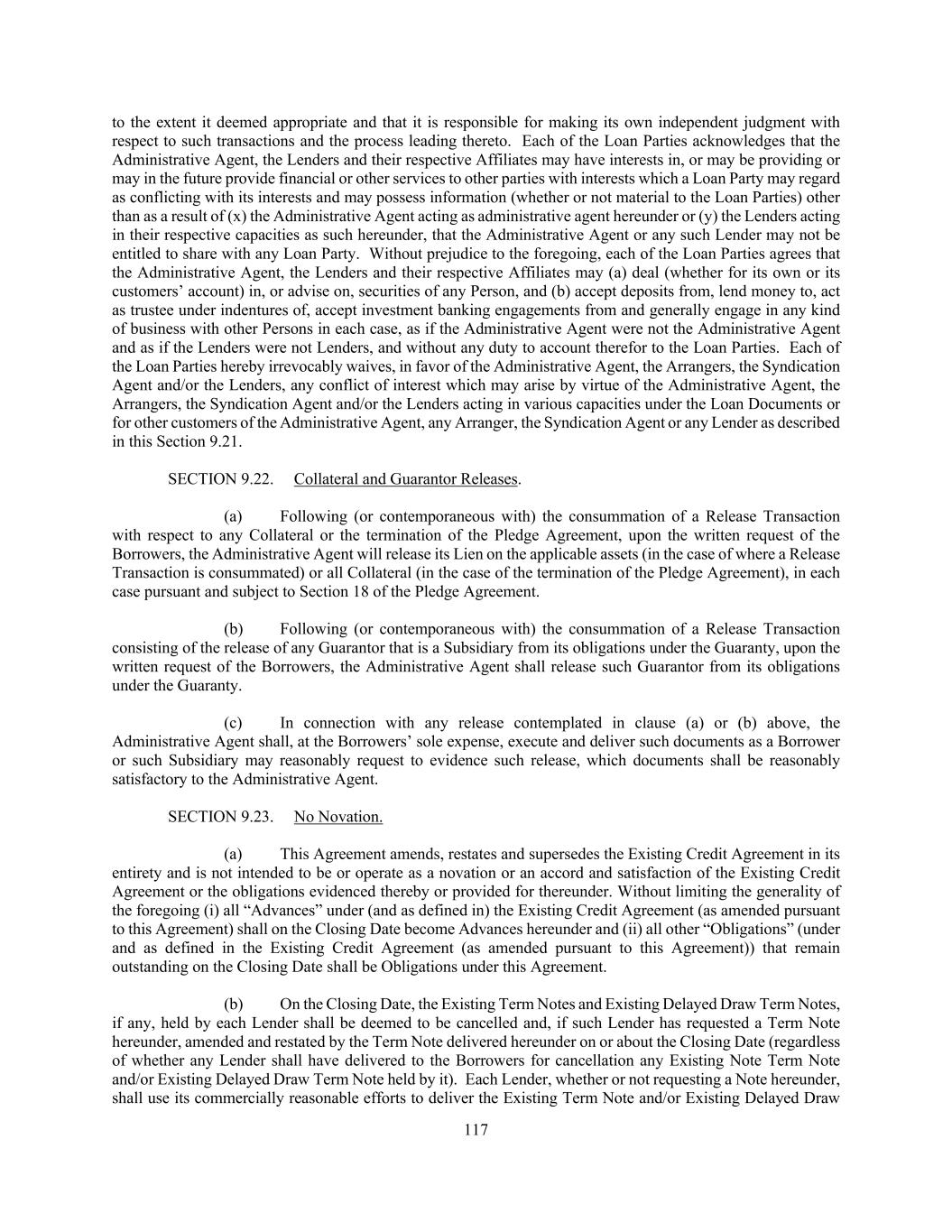 117 to the extent it deemed appropriate and that it is responsible for making its own independent judgment with respect to such transactions and the process leading thereto. Each of the Loan Parties acknowledges that the Administrative Agent, the Lenders and their respective Affiliates may have interests in, or may be providing or may in the future provide financial or other services to other parties with interests which a Loan Party may regard as conflicting with its interests and may possess information (whether or not material to the Loan Parties) other than as a result of (x) the Administrative Agent acting as administrative agent hereunder or (y) the Lenders acting in their respective capacities as such hereunder, that the Administrative Agent or any such Lender may not be entitled to share with any Loan Party. Without prejudice to the foregoing, each of the Loan Parties agrees that the Administrative Agent, the Lenders and their respective Affiliates may (a) deal (whether for its own or its customers’ account) in, or advise on, securities of any Person, and (b) accept deposits from, lend money to, act as trustee under indentures of, accept investment banking engagements from and generally engage in any kind of business with other Persons in each case, as if the Administrative Agent were not the Administrative Agent and as if the Lenders were not Lenders, and without any duty to account therefor to the Loan Parties. Each of the Loan Parties hereby irrevocably waives, in favor of the Administrative Agent, the Arrangers, the Syndication Agent and/or the Lenders, any conflict of interest which may arise by virtue of the Administrative Agent, the Arrangers, the Syndication Agent and/or the Lenders acting in various capacities under the Loan Documents or for other customers of the Administrative Agent, any Arranger, the Syndication Agent or any Lender as described in this Section 9.21. SECTION 9.22. Collateral and Guarantor Releases. (a) Following (or contemporaneous with) the consummation of a Release Transaction with respect to any Collateral or the termination of the Pledge Agreement, upon the written request of the Borrowers, the Administrative Agent will release its Lien on the applicable assets (in the case of where a Release Transaction is consummated) or all Collateral (in the case of the termination of the Pledge Agreement), in each case pursuant and subject to Section 18 of the Pledge Agreement. (b) Following (or contemporaneous with) the consummation of a Release Transaction consisting of the release of any Guarantor that is a Subsidiary from its obligations under the Guaranty, upon the written request of the Borrowers, the Administrative Agent shall release such Guarantor from its obligations under the Guaranty. (c) In connection with any release contemplated in clause (a) or (b) above, the Administrative Agent shall, at the Borrowers’ sole expense, execute and deliver such documents as a Borrower or such Subsidiary may reasonably request to evidence such release, which documents shall be reasonably satisfactory to the Administrative Agent. SECTION 9.23. No Novation. (a) This Agreement amends, restates and supersedes the Existing Credit Agreement in its entirety and is not intended to be or operate as a novation or an accord and satisfaction of the Existing Credit Agreement or the obligations evidenced thereby or provided for thereunder. Without limiting the generality of the foregoing (i) all “Advances” under (and as defined in) the Existing Credit Agreement (as amended pursuant to this Agreement) shall on the Closing Date become Advances hereunder and (ii) all other “Obligations” (under and as defined in the Existing Credit Agreement (as amended pursuant to this Agreement)) that remain outstanding on the Closing Date shall be Obligations under this Agreement. (b) On the Closing Date, the Existing Term Notes and Existing Delayed Draw Term Notes, if any, held by each Lender shall be deemed to be cancelled and, if such Lender has requested a Term Note hereunder, amended and restated by the Term Note delivered hereunder on or about the Closing Date (regardless of whether any Lender shall have delivered to the Borrowers for cancellation any Existing Note Term Note and/or Existing Delayed Draw Term Note held by it). Each Lender, whether or not requesting a Note hereunder, shall use its commercially reasonable efforts to deliver the Existing Term Note and/or Existing Delayed Draw