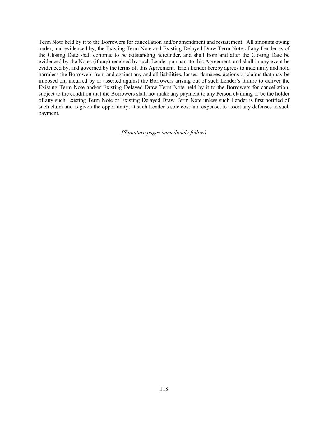 118 Term Note held by it to the Borrowers for cancellation and/or amendment and restatement. All amounts owing under, and evidenced by, the Existing Term Note and Existing Delayed Draw Term Note of any Lender as of the Closing Date shall continue to be outstanding hereunder, and shall from and after the Closing Date be evidenced by the Notes (if any) received by such Lender pursuant to this Agreement, and shall in any event be evidenced by, and governed by the terms of, this Agreement. Each Lender hereby agrees to indemnify and hold harmless the Borrowers from and against any and all liabilities, losses, damages, actions or claims that may be imposed on, incurred by or asserted against the Borrowers arising out of such Lender’s failure to deliver the Existing Term Note and/or Existing Delayed Draw Term Note held by it to the Borrowers for cancellation, subject to the condition that the Borrowers shall not make any payment to any Person claiming to be the holder of any such Existing Term Note or Existing Delayed Draw Term Note unless such Lender is first notified of such claim and is given the opportunity, at such Lender’s sole cost and expense, to assert any defenses to such payment. [Signature pages immediately follow]