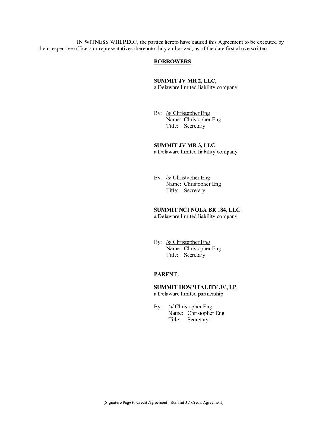 [Signature Page to Credit Agreement - Summit JV Credit Agreement] IN WITNESS WHEREOF, the parties hereto have caused this Agreement to be executed by their respective officers or representatives thereunto duly authorized, as of the date first above written. BORROWERS: SUMMIT JV MR 2, LLC, a Delaware limited liability company By: /s/ Christopher Eng Name: Christopher Eng Title: Secretary SUMMIT JV MR 3, LLC, a Delaware limited liability company By: /s/ Christopher Eng Name: Christopher Eng Title: Secretary SUMMIT NCI NOLA BR 184, LLC, a Delaware limited liability company By: /s/ Christopher Eng Name: Christopher Eng Title: Secretary PARENT: SUMMIT HOSPITALITY JV, LP, a Delaware limited partnership By: /s/ Christopher Eng Name: Christopher Eng Title: Secretary