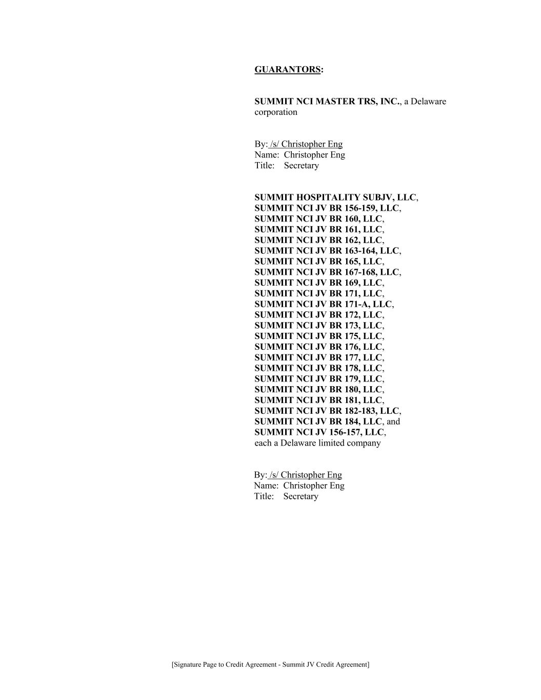 [Signature Page to Credit Agreement - Summit JV Credit Agreement] GUARANTORS: SUMMIT NCI MASTER TRS, INC., a Delaware corporation By: /s/ Christopher Eng Name: Christopher Eng Title: Secretary SUMMIT HOSPITALITY SUBJV, LLC, SUMMIT NCI JV BR 156-159, LLC, SUMMIT NCI JV BR 160, LLC, SUMMIT NCI JV BR 161, LLC, SUMMIT NCI JV BR 162, LLC, SUMMIT NCI JV BR 163-164, LLC, SUMMIT NCI JV BR 165, LLC, SUMMIT NCI JV BR 167-168, LLC, SUMMIT NCI JV BR 169, LLC, SUMMIT NCI JV BR 171, LLC, SUMMIT NCI JV BR 171-A, LLC, SUMMIT NCI JV BR 172, LLC, SUMMIT NCI JV BR 173, LLC, SUMMIT NCI JV BR 175, LLC, SUMMIT NCI JV BR 176, LLC, SUMMIT NCI JV BR 177, LLC, SUMMIT NCI JV BR 178, LLC, SUMMIT NCI JV BR 179, LLC, SUMMIT NCI JV BR 180, LLC, SUMMIT NCI JV BR 181, LLC, SUMMIT NCI JV BR 182-183, LLC, SUMMIT NCI JV BR 184, LLC, and SUMMIT NCI JV 156-157, LLC, each a Delaware limited company By: /s/ Christopher Eng Name: Christopher Eng Title: Secretary
