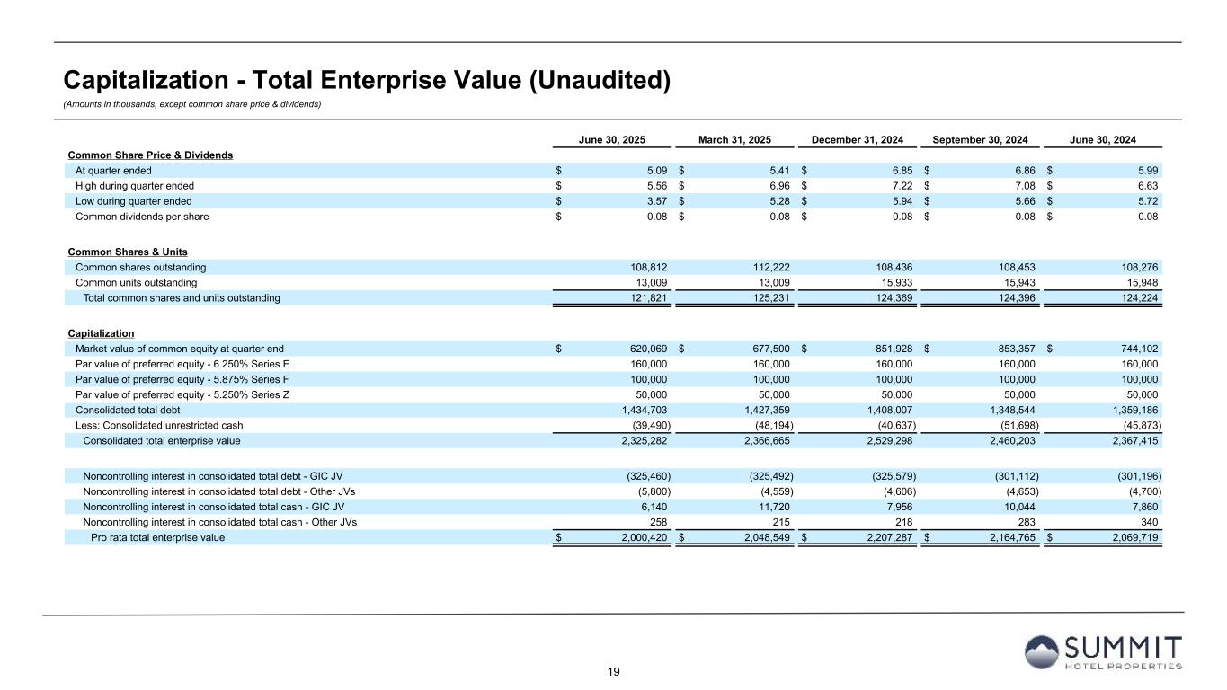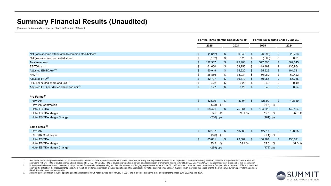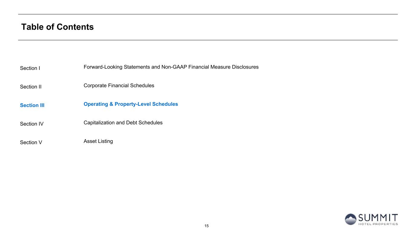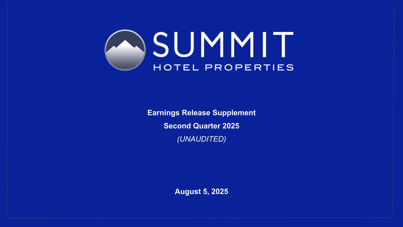 14 Reconciliation to Adjusted FFO - By Ownership Interest (Unaudited) (Amounts in thousands, except per share metrics) 1. GIC Joint Venture is 51% owned by Summit while Other Joint Ventures are 90% owned by Summit. 2. Non-cash interest income relates to the amortization of the discount on certain notes receivable. The discount on these notes receivable was recorded at inception of the related loans based on the estimated value of the embedded purchase options in the notes receivable. 3. The Company includes the outstanding OP units issued by Summit Hotel OP, LP, the Company’s operating partnership, held by limited partners other than the Company because the OP units are redeemable for cash or, at the Company’s option, shares of the Company’s common stock on a one-for-one basis. Summit GIC Other GIC JV Other JVs Wholly-Owned Joint Venture (1) Joint Ventures (1) Combined Pro Rata Adj Pro Rata Adj Pro Rata For The Six Months Ended June 30, 2025 2024 2025 2024 2025 2024 2025 2024 2025 2024 2025 2024 2025 2024 Net (loss) income $ (164) $ 41,764 $ 545 $ (1,930) $ 2,279 $ 1,697 $ 2,660 $ 41,531 $ (286) $ 907 $ (228) $ (170) $ 2,146 $ 42,268 Preferred dividends (7,938) (7,938) — — — — (7,938) (7,938) — — — — (7,938) (7,938) Distributions to and accretion of redeemable non-controlling interests (1,314) (1,314) — — — — (1,314) (1,314) — — — — (1,314) (1,314) Net (loss) income applicable to common shares and Common Units (9,416) 32,512 545 (1,930) 2,279 1,697 (6,592) 32,279 (286) 907 (228) (170) (7,106) 33,016 Real estate-related depreciation 38,454 38,334 32,662 30,396 2,241 2,139 73,357 70,869 (16,004) (14,894) (224) (214) 57,129 55,761 Loss (gain) on disposal of assets and other dispositions, net 38 (28,290) 41 (127) — — 79 (28,417) (20) 62 — — 59 (28,355) FFO applicable to common shares and Common Units 29,076 42,556 33,248 28,339 4,520 3,836 66,844 74,731 (16,310) (13,925) (452) (384) 50,082 60,422 Amortization of deferred financing costs 2,167 2,320 1,107 890 76 30 3,350 3,240 (542) (436) (8) (3) 2,800 2,801 Amortization of franchise fees 179 168 171 157 — — 350 325 (84) (77) — — 266 248 Amortization of intangible assets (16) — 540 1,822 — — 524 1,822 (265) (893) — — 259 929 Equity based compensation 4,705 4,483 — — — — 4,705 4,483 — — — — 4,705 4,483 Debt transaction costs — 567 — 14 15 — 15 581 — (7) (2) — 13 574 Gain on extinguishment of debt — (3,000) — — — — — (3,000) — — — — — (3,000) Non-Cash Interest Income (2) — (266) — — — — — (266) — — — — — (266) Non-cash lease expense, net 253 244 13 (22) — — 266 222 (6) 11 — — 260 233 Casualty losses (gains), net 540 386 170 (863) 14 (404) 724 (881) (83) 423 (1) 40 640 (418) Deferred tax expense (benefit) 974 — 194 (3) — — 1,168 (3) (95) 1 — — 1,073 (2) Other (315) 362 — — 315 — — 362 — — (32) — (32) 362 AFFO applicable to common shares and common units (3) $ 37,563 $ 47,820 $ 35,443 $ 30,334 $ 4,940 $ 3,462 $ 77,946 $ 81,616 $ (17,385) $ (14,903) $ (495) $ (347) $ 60,066 $ 66,366 FFO per common share/Common Unit $ 0.40 $ 0.49 AFFO per common share/Common Unit $ 0.49 $ 0.54 Weighted-average diluted common shares/Common Units (3) 123,742 123,664