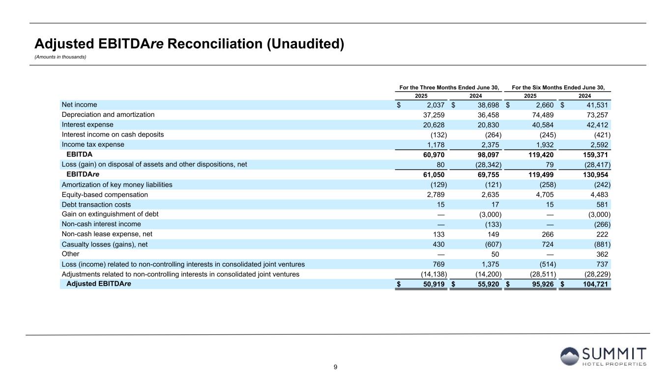 8 Summary Pro Forma Operating Results (Unaudited) (Amounts in thousands, except operating statistics) 1. Unaudited pro forma information includes operating results for 97 hotels owned as of June 30, 2025, as if all such hotels had been owned by the Company since July 1, 2024. For hotels acquired by the Company after July 1, 2024, the Company has included in the pro forma information the financial results of each of the hotels for the period from July 1, 2024, to June 30, 2025. The financial results for the hotels include information provided by the third-party owner of such hotel prior to purchase by the Company and have not been audited or reviewed by our auditors or adjusted by us. For any hotels sold by the Company after July 1, 2024, the Company excludes the financial results of each of those hotels from July 1, 2024 to the date the hotels were sold by the Company in determining pro forma total revenues and pro forma hotel operating expenses. The pro forma information is included to enable comparison of results for the current reporting period to results for the comparable period of the prior year and are not indicative of future results. 2024 2025 Trailing Twelve Months Ended Pro Forma Operating Data: (1) Q3 Q4 Q1 Q2 June 30, 2025 Pro forma room revenue $ 162,848 $ 156,955 $ 163,731 $ 170,599 $ 654,133 Pro forma other hotel operations revenue 19,689 20,299 20,747 22,318 83,053 Pro forma total revenues 182,537 177,254 184,478 192,917 737,186 Pro forma total hotel operating expenses 120,357 116,886 118,873 124,496 480,612 Pro forma hotel EBITDA $ 62,180 $ 60,368 $ 65,605 $ 68,421 $ 256,574 Pro forma hotel EBITDA Margin 34.1 % 34.1 % 35.6 % 35.5 % 34.8 % Pro Forma Statistics: (1) Rooms sold 991,580 957,027 946,105 1,029,583 3,924,295 Rooms available 1,338,979 1,339,060 1,309,950 1,324,598 5,312,587 Occupancy 74.1 % 71.5 % 72.2 % 77.7 % 73.9 % ADR $ 164.23 $ 164.00 $ 173.06 $ 165.70 $ 166.69 RevPAR $ 121.62 $ 117.21 $ 124.99 $ 128.79 $ 123.13 Actual Statistics: Rooms sold 966,019 935,012 946,105 1,029,583 3,876,719 Rooms available 1,311,563 1,312,953 1,309,950 1,324,598 5,259,064 Occupancy 73.7 % 71.2 % 72.2 % 77.7 % 73.7 % ADR $ 162.95 $ 163.47 $ 173.06 $ 165.70 $ 166.27 RevPAR $ 120.02 $ 116.42 $ 124.99 $ 128.79 $ 122.57