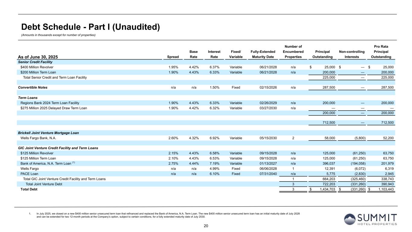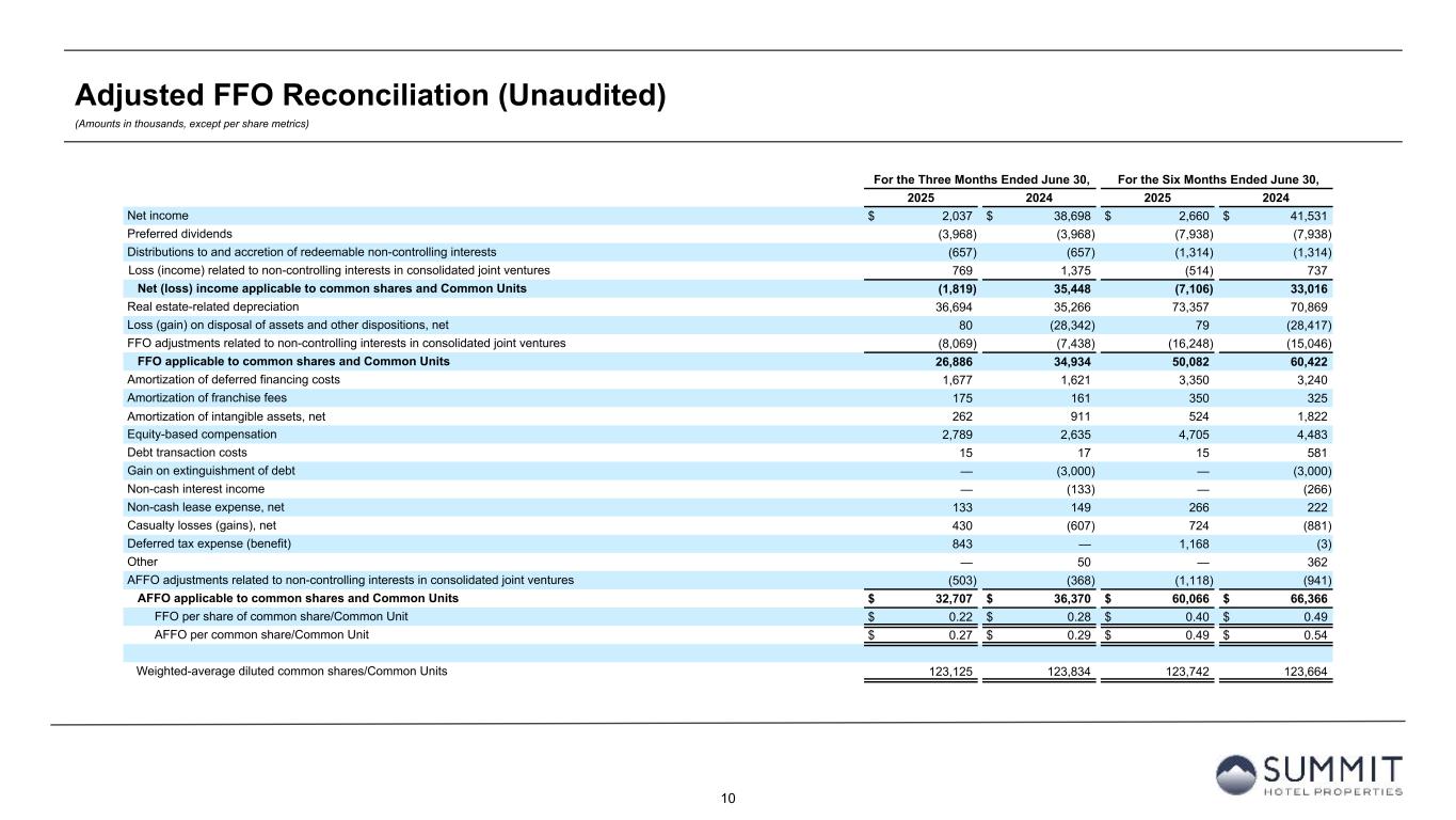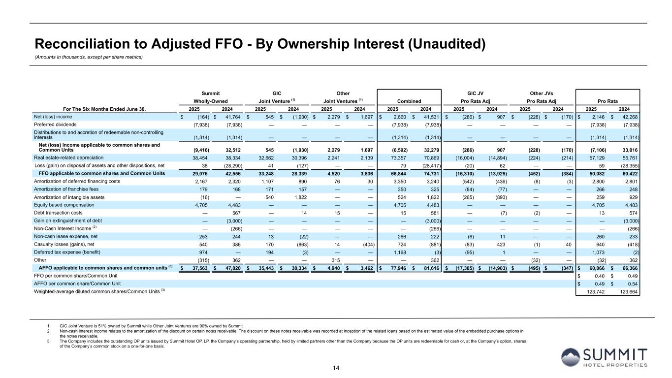 13 Reconciliation to Adjusted FFO - By Ownership Interest (Unaudited) (Amounts in thousands, except per share metrics) 1. GIC Joint Venture is 51% owned by Summit while Other Joint Ventures are 90% owned by Summit. 2. Non-cash interest income relates to the amortization of the discount on certain notes receivable. The discount on these notes receivable was recorded at inception of the related loans based on the estimated value of the embedded purchase options in the notes receivable. 3. The Company includes the outstanding OP units issued by Summit Hotel OP, LP, the Company’s operating partnership, held by limited partners other than the Company because the OP units are redeemable for cash or, at the Company’s option, shares of the Company’s common stock on a one-for-one basis. Summit GIC Other GIC JV Other JVs Wholly-Owned Joint Venture (1) Joint Ventures (1) Combined Pro Rata Adj Pro Rata Adj Pro Rata For The Three Months Ended June 30, 2025 2024 2025 2024 2025 2024 2025 2024 2025 2024 2025 2024 2025 2024 Net income (loss) $ 3,656 $ 41,751 $ (1,656) $ (2,842) $ 37 $ (211) $ 2,037 $ 38,698 $ 773 $ 1,354 $ (4) $ 21 $ 2,806 $ 40,073 Preferred dividends (3,968) (3,968) — — — — (3,968) (3,968) — — — — (3,968) (3,968) Distributions to and accretion of redeemable non-controlling interests (657) (657) — — — — (657) (657) — — — — (657) (657) Net (loss) income applicable to common shares and Common Units (969) 37,126 (1,656) (2,842) 37 (211) (2,588) 34,073 773 1,354 (4) 21 (1,819) 35,448 Real estate-related depreciation 19,316 19,181 16,210 15,011 1,168 1,074 36,694 35,266 (7,943) (7,355) (117) (107) 28,634 27,804 Loss (gain) on disposal of assets and other dispositions, net 61 (28,290) 19 (52) — — 80 (28,342) (9) 24 — — 71 (28,318) FFO applicable to common shares and Common Units 18,408 28,017 14,573 12,117 1,205 863 34,186 40,997 (7,179) (5,977) (121) (86) 26,886 34,934 Amortization of deferred financing costs 1,062 1,161 554 445 61 15 1,677 1,621 (271) (218) (6) (2) 1,400 1,401 Amortization of franchise fees 89 83 86 78 — — 175 161 (42) (38) — — 133 123 Amortization of intangible assets (8) — 270 911 — — 262 911 (132) (446) — — 130 465 Equity based compensation 2,789 2,635 — — — — 2,789 2,635 — — — — 2,789 2,635 Debt transaction costs — 17 — — 15 — 15 17 — — (2) — 13 17 Gain on extinguishment of debt — (3,000) — — — — — (3,000) — — — — — (3,000) Non-cash interest income (2) — (133) — — — — — (133) — — — — — (133) Non-cash lease expense, net 126 141 7 8 — — 133 149 (3) (4) — — 130 145 Casualty losses (gains), net 283 76 141 (700) 6 17 430 (607) (69) 342 (1) (2) 360 (267) Deferred tax expense (benefit) 956 — (113) — — — 843 — 55 — — — 898 — Other (315) 50 — — 315 — — 50 — — (32) — (32) 50 AFFO applicable to common shares and common units (3) $ 23,390 $ 29,047 $ 15,518 $ 12,859 $ 1,602 $ 895 $ 40,510 $ 42,801 $ (7,641) $ (6,341) $ (162) $ (90) $ 32,707 $ 36,370 FFO per common share/Common Unit $ 0.22 $ 0.28 AFFO per common share/Common Unit $ 0.27 $ 0.29 Weighted-average diluted common shares/Common Units (3) 123,125 123,834