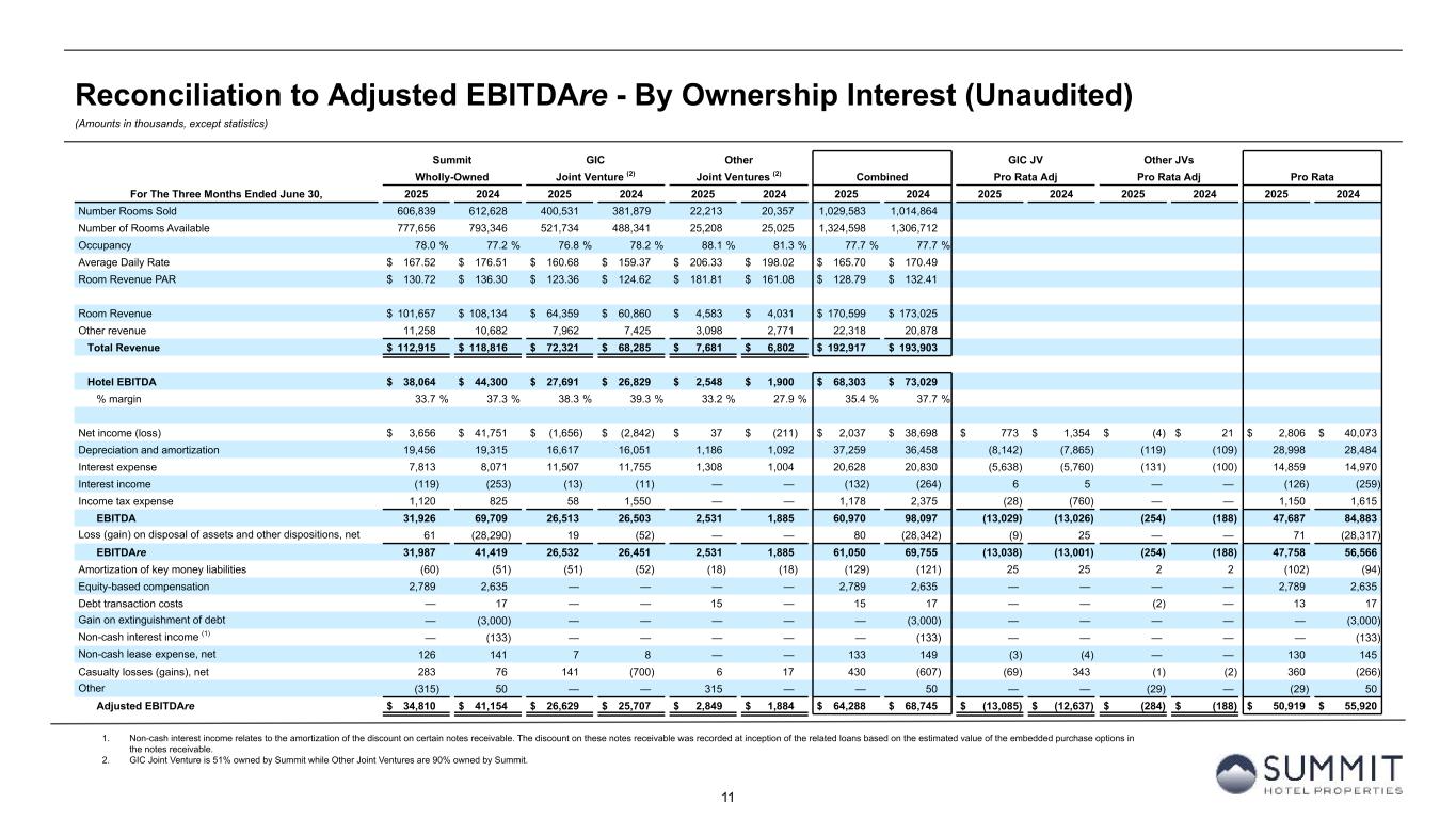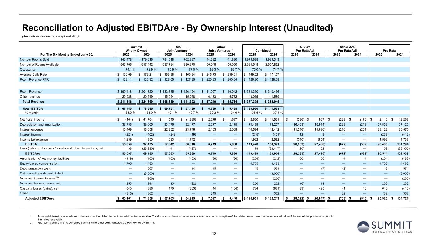 11 Reconciliation to Adjusted EBITDAre - By Ownership Interest (Unaudited) (Amounts in thousands, except statistics) 1. Non-cash interest income relates to the amortization of the discount on certain notes receivable. The discount on these notes receivable was recorded at inception of the related loans based on the estimated value of the embedded purchase options in the notes receivable. 2. GIC Joint Venture is 51% owned by Summit while Other Joint Ventures are 90% owned by Summit. Summit GIC Other GIC JV Other JVs Wholly-Owned Joint Venture (2) Joint Ventures (2) Combined Pro Rata Adj Pro Rata Adj Pro Rata For The Three Months Ended June 30, 2025 2024 2025 2024 2025 2024 2025 2024 2025 2024 2025 2024 2025 2024 Number Rooms Sold 606,839 612,628 400,531 381,879 22,213 20,357 1,029,583 1,014,864 Number of Rooms Available 777,656 793,346 521,734 488,341 25,208 25,025 1,324,598 1,306,712 Occupancy 78.0 % 77.2 % 76.8 % 78.2 % 88.1 % 81.3 % 77.7 % 77.7 % Average Daily Rate $ 167.52 $ 176.51 $ 160.68 $ 159.37 $ 206.33 $ 198.02 $ 165.70 $ 170.49 Room Revenue PAR $ 130.72 $ 136.30 $ 123.36 $ 124.62 $ 181.81 $ 161.08 $ 128.79 $ 132.41 Room Revenue $ 101,657 $ 108,134 $ 64,359 $ 60,860 $ 4,583 $ 4,031 $ 170,599 $ 173,025 Other revenue 11,258 10,682 7,962 7,425 3,098 2,771 22,318 20,878 Total Revenue $ 112,915 $ 118,816 $ 72,321 $ 68,285 $ 7,681 $ 6,802 $ 192,917 $ 193,903 Hotel EBITDA $ 38,064 $ 44,300 $ 27,691 $ 26,829 $ 2,548 $ 1,900 $ 68,303 $ 73,029 % margin 33.7 % 37.3 % 38.3 % 39.3 % 33.2 % 27.9 % 35.4 % 37.7 % Net income (loss) $ 3,656 $ 41,751 $ (1,656) $ (2,842) $ 37 $ (211) $ 2,037 $ 38,698 $ 773 $ 1,354 $ (4) $ 21 $ 2,806 $ 40,073 Depreciation and amortization 19,456 19,315 16,617 16,051 1,186 1,092 37,259 36,458 (8,142) (7,865) (119) (109) 28,998 28,484 Interest expense 7,813 8,071 11,507 11,755 1,308 1,004 20,628 20,830 (5,638) (5,760) (131) (100) 14,859 14,970 Interest income (119) (253) (13) (11) — — (132) (264) 6 5 — — (126) (259) Income tax expense 1,120 825 58 1,550 — — 1,178 2,375 (28) (760) — — 1,150 1,615 EBITDA 31,926 69,709 26,513 26,503 2,531 1,885 60,970 98,097 (13,029) (13,026) (254) (188) 47,687 84,883 Loss (gain) on disposal of assets and other dispositions, net 61 (28,290) 19 (52) — — 80 (28,342) (9) 25 — — 71 (28,317) EBITDAre 31,987 41,419 26,532 26,451 2,531 1,885 61,050 69,755 (13,038) (13,001) (254) (188) 47,758 56,566 Amortization of key money liabilities (60) (51) (51) (52) (18) (18) (129) (121) 25 25 2 2 (102) (94) Equity-based compensation 2,789 2,635 — — — — 2,789 2,635 — — — — 2,789 2,635 Debt transaction costs — 17 — — 15 — 15 17 — — (2) — 13 17 Gain on extinguishment of debt — (3,000) — — — — — (3,000) — — — — — (3,000) Non-cash interest income (1) — (133) — — — — — (133) — — — — — (133) Non-cash lease expense, net 126 141 7 8 — — 133 149 (3) (4) — — 130 145 Casualty losses (gains), net 283 76 141 (700) 6 17 430 (607) (69) 343 (1) (2) 360 (266) Other (315) 50 — — 315 — — 50 — — (29) — (29) 50 Adjusted EBITDAre $ 34,810 $ 41,154 $ 26,629 $ 25,707 $ 2,849 $ 1,884 $ 64,288 $ 68,745 $ (13,085) $ (12,637) $ (284) $ (188) $ 50,919 $ 55,920