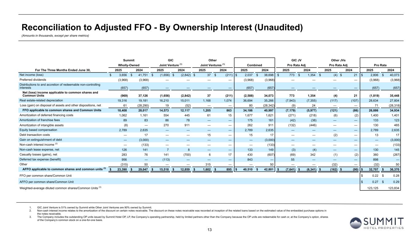 12 Reconciliation to Adjusted EBITDAre - By Ownership Interest (Unaudited) (Amounts in thousands, except statistics) 1. Non-cash interest income relates to the amortization of the discount on certain notes receivable. The discount on these notes receivable was recorded at inception of the related loans based on the estimated value of the embedded purchase options in the notes receivable. 2. GIC Joint Venture is 51% owned by Summit while Other Joint Ventures are 90% owned by Summit. Summit GIC Other GIC JV Other JVs Wholly-Owned Joint Venture (2) Joint Ventures (2) Combined Pro Rata Adj Pro Rata Adj Pro Rata For The Six Months Ended June 30, 2025 2024 2025 2024 2025 2024 2025 2024 2025 2024 2025 2024 2025 2024 Number Rooms Sold 1,146,478 1,179,616 784,518 762,837 44,692 41,890 1,975,688 1,984,343 Number of Rooms Available 1,546,706 1,617,442 1,037,794 990,370 50,048 50,050 2,634,548 2,657,862 Occupancy 74.1 % 72.9 % 75.6 % 77.0 % 89.3 % 83.7 % 75.0 % 74.7 % Average Daily Rate $ 166.09 $ 173.21 $ 169.38 $ 165.34 $ 246.73 $ 239.01 $ 169.22 $ 171.57 Room Revenue PAR $ 123.11 $ 126.32 $ 128.05 $ 127.35 $ 220.33 $ 200.04 $ 126.90 $ 128.09 Room Revenue $ 190,418 $ 204,320 $ 132,885 $ 126,124 $ 11,027 $ 10,012 $ 334,330 $ 340,456 Other revenue 20,928 20,549 15,954 15,268 6,183 5,772 43,065 41,589 Total Revenue $ 211,346 $ 224,869 $ 148,839 $ 141,392 $ 17,210 $ 15,784 $ 377,395 $ 382,045 Hotel EBITDA $ 67,440 $ 78,595 $ 59,751 $ 57,490 $ 6,739 $ 5,468 $ 133,930 $ 141,553 % margin 31.9 % 35.0 % 40.1 % 40.7 % 39.2 % 34.6 % 35.5 % 37.1 % Net (loss) income $ (164) $ 41,764 $ 545 $ (1,930) $ 2,279 $ 1,697 $ 2,660 $ 41,531 $ (286) $ 907 $ (228) $ (170) $ 2,146 $ 42,268 Depreciation and amortization 38,736 38,605 33,476 32,477 2,277 2,175 74,489 73,257 (16,403) (15,914) (228) (218) 57,858 57,125 Interest expense 15,469 16,658 22,952 23,746 2,163 2,008 40,584 42,412 (11,246) (11,636) (216) (201) 29,122 30,575 Interest income (221) (402) (24) (19) — — (245) (421) 12 9 — — (233) (412) Income tax expense 1,239 850 693 1,742 — — 1,932 2,592 (340) (854) — — 1,592 1,738 EBITDA 55,059 97,475 57,642 56,016 6,719 5,880 119,420 159,371 (28,263) (27,488) (672) (589) 90,485 131,294 Loss (gain) on disposal of assets and other dispositions, net 38 (28,290) 41 (127) — — 79 (28,417) (20) 62 — — 59 (28,355) EBITDAre 55,097 69,185 57,683 55,889 6,719 5,880 119,499 130,954 (28,283) (27,426) (672) (589) 90,544 102,939 Amortization of key money liabilities (119) (103) (103) (103) (36) (36) (258) (242) 50 50 4 4 (204) (188) Equity-based compensation 4,705 4,483 — — — — 4,705 4,483 — — — — 4,705 4,483 Debt transaction costs — 567 — 14 15 — 15 581 — (7) (2) — 13 574 Gain on extinguishment of debt — (3,000) — — — — — (3,000) — — — — — (3,000) Non-cash interest income (1) — (266) — — — — — (266) — — — — — (266) Non-cash lease expense, net 253 244 13 (22) — — 266 222 (6) 11 — — 260 233 Casualty losses (gains), net 540 386 170 (863) 14 (404) 724 (881) (83) 425 (1) 40 640 (416) Other (315) 362 — — 315 — — 362 — — (32) — (32) 362 Adjusted EBITDAre $ 60,161 $ 71,858 $ 57,763 $ 54,915 $ 7,027 $ 5,440 $ 124,951 $ 132,213 $ (28,322) $ (26,947) $ (703) $ (545) $ 95,926 $ 104,721