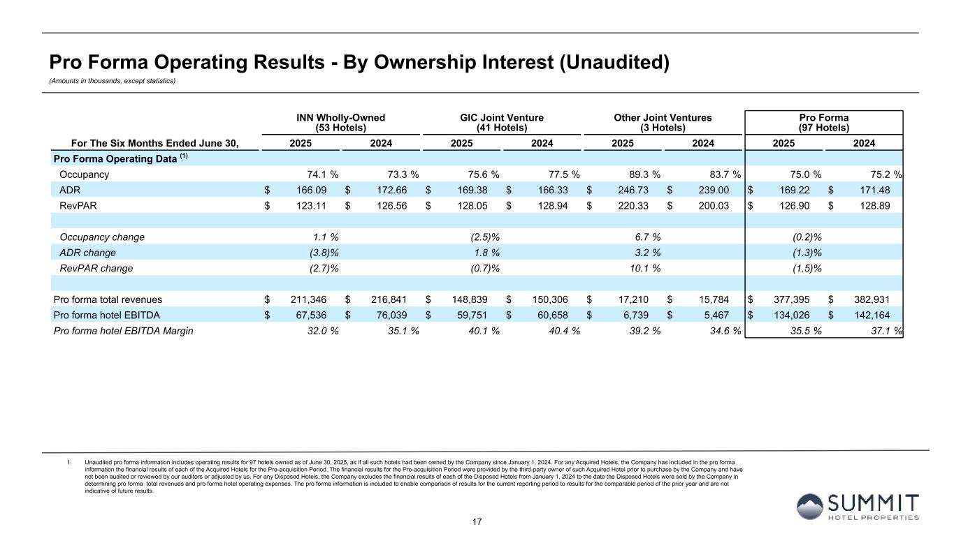 16 Pro Forma Operating Results - By Ownership Interest (Unaudited) (Amounts in thousands, except statistics) 1. Unaudited pro forma information includes operating results for 97 hotels owned as of June 30, 2025, as if all such hotels had been owned by the Company since January 1, 2024. For any hotels acquired by the Company after January 1, 2024 (the “Acquired Hotels”), the Company has included in the pro forma information the financial results of each of the Acquired Hotels for the period from January 1, 2024, to the date the Acquired Hotels were purchased by the Company (the “Pre-acquisition Period”). The financial results for the Pre-acquisition Period were provided by the third-party owner of such Acquired Hotel prior to purchase by the Company and have not been audited or reviewed by our auditors or adjusted by us. For any hotels sold by the Company after January 1, 2024 (the “Disposed Hotels”), the Company excludes the financial results of each of the Disposed Hotels from January 1, 2024 to the date the Disposed Hotels were sold by the Company in determining pro forma total revenues and pro forma hotel operating expenses. The pro forma information is included to enable comparison of results for the current reporting period to results for the comparable period of the prior year and are not indicative of future results. INN Wholly-Owned (53 Hotels) GIC Joint Venture (41 Hotels) Other Joint Ventures (3 Hotels) Pro Forma (97 Hotels) For The Three Months Ended June 30, 2025 2024 2025 2024 2025 2024 2025 2024 Pro Forma Operating Data (1) Occupancy 78.0 % 77.6 % 76.8 % 78.9 % 88.1 % 81.3 % 77.7 % 78.2 % ADR $ 167.52 $ 176.70 $ 160.68 $ 162.18 $ 206.33 $ 198.01 $ 165.70 $ 171.34 RevPAR $ 130.72 $ 137.05 $ 123.36 $ 128.00 $ 181.81 $ 161.08 $ 128.79 $ 133.94 Occupancy change 0.6 % (2.7) % 8.3 % (0.6) % ADR change (5.2) % (0.9) % 4.2 % (3.3) % RevPAR change (4.6) % (3.6) % 12.9 % (3.8) % Pro forma total revenues $ 112,915 $ 117,116 $ 72,321 $ 74,521 $ 7,681 $ 6,802 $ 192,917 $ 198,439 Pro forma hotel EBITDA $ 38,182 $ 44,267 $ 27,691 $ 29,497 $ 2,548 $ 1,900 $ 68,421 $ 75,664 Pro forma hotel EBITDA Margin 33.8 % 37.8 % 38.3 % 39.6 % 33.2 % 27.9 % 35.5 % 38.1 %
