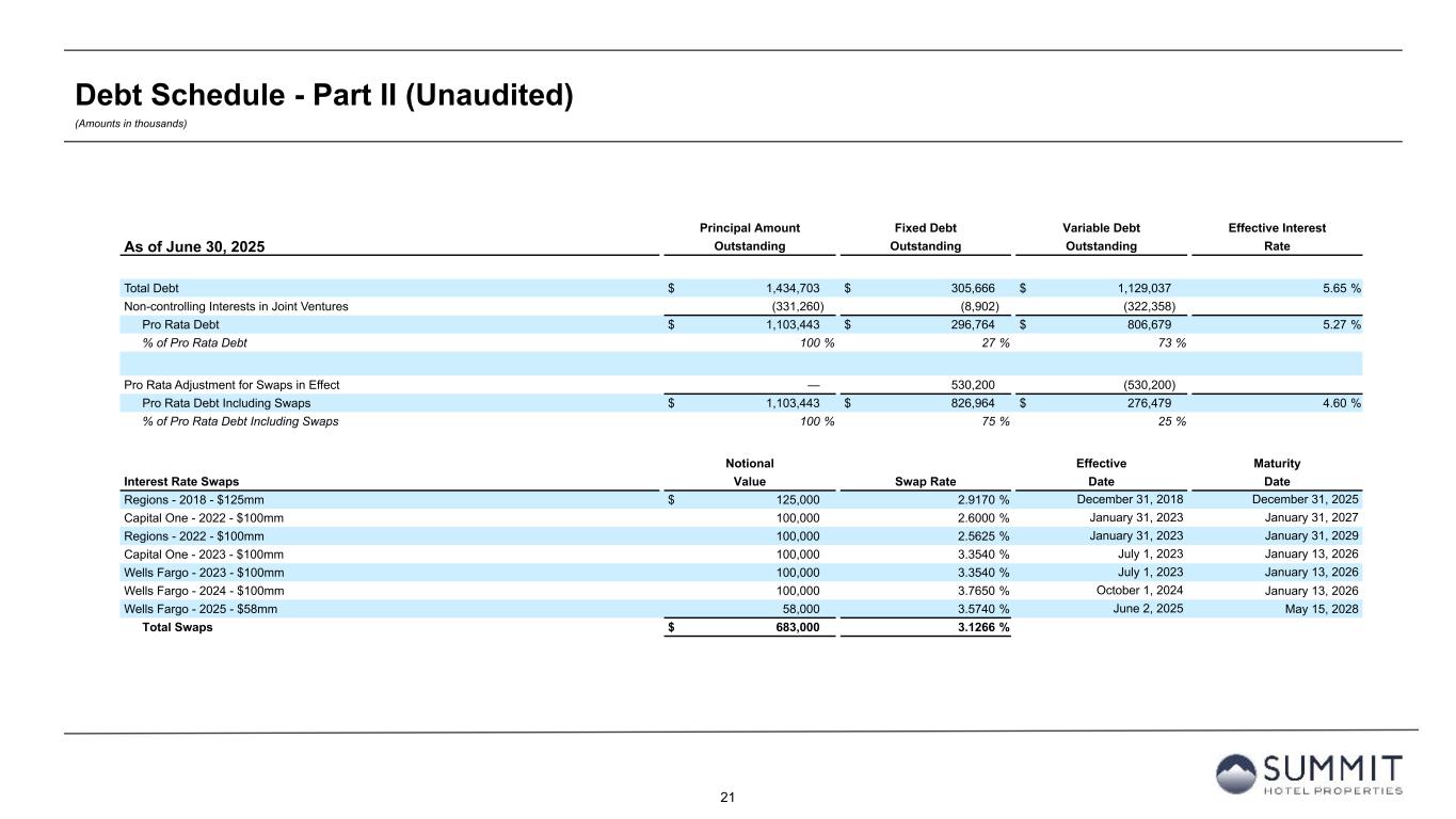 20 Number of Pro Rata Base Interest Fixed/ Fully-Extended Encumbered Principal Non-controlling Principal As of June 30, 2025 Spread Rate Rate Variable Maturity Date Properties Outstanding Interests Outstanding Senior Credit Facility $400 Million Revolver 1.95% 4.42% 6.37% Variable 06/21/2028 n/a $ 25,000 $ — $ 25,000 $200 Million Term Loan 1.90% 4.43% 6.33% Variable 06/21/2028 n/a 200,000 — 200,000 Total Senior Credit and Term Loan Facility 225,000 — 225,000 Convertible Notes n/a n/a 1.50% Fixed 02/15/2026 n/a 287,500 — 287,500 Term Loans Regions Bank 2024 Term Loan Facility 1.90% 4.43% 6.33% Variable 02/26/2029 n/a 200,000 — 200,000 $275 Million 2025 Delayed Draw Term Loan 1.90% 4.42% 6.32% Variable 03/27/2030 n/a — — — 200,000 — 200,000 712,500 — 712,500 Brickell Joint Venture Mortgage Loan Wells Fargo Bank, N.A. 2.60% 4.32% 6.92% Variable 05/15/2030 2 58,000 (5,800) 52,200 GIC Joint Venture Credit Facility and Term Loans $125 Million Revolver 2.15% 4.43% 6.58% Variable 09/15/2028 n/a 125,000 (61,250) 63,750 $125 Million Term Loan 2.10% 4.43% 6.53% Variable 09/15/2028 n/a 125,000 (61,250) 63,750 Bank of America, N.A. Term Loan (1) 2.75% 4.44% 7.19% Variable 01/13/2027 n/a 396,037 (194,058) 201,979 Wells Fargo n/a n/a 4.99% Fixed 06/06/2028 1 12,391 (6,072) 6,319 PACE Loan n/a n/a 6.10% Fixed 07/31/2040 n/a 5,775 (2,830) 2,945 Total GIC Joint Venture Credit Facility and Term Loans 1 664,203 (325,460) 338,743 Total Joint Venture Debt 3 722,203 (331,260) 390,943 Total Debt 3 $ 1,434,703 $ (331,260) $ 1,103,443 Debt Schedule - Part I (Unaudited) (Amounts in thousands except for number of properties) 1. In July 2025, we closed on a new $400 million senior unsecured term loan that refinanced and replaced the Bank of America, N.A. Term Loan. The new $400 million senior unsecured term loan has an initial maturity date of July 2028 and can be extended for two 12-month periods at the Company’s option, subject to certain conditions, for a fully extended maturity date of July 2030.