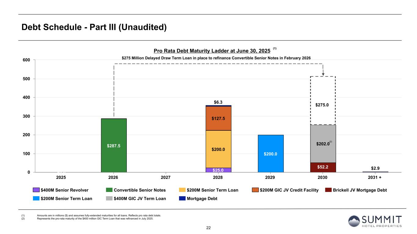21 Debt Schedule - Part II (Unaudited) (Amounts in thousands) Principal Amount Fixed Debt Variable Debt Effective Interest As of June 30, 2025 Outstanding Outstanding Outstanding Rate Total Debt $ 1,434,703 $ 305,666 $ 1,129,037 5.65 % Non-controlling Interests in Joint Ventures (331,260) (8,902) (322,358) Pro Rata Debt $ 1,103,443 $ 296,764 $ 806,679 5.27 % % of Pro Rata Debt 100 % 27 % 73 % Pro Rata Adjustment for Swaps in Effect — 530,200 (530,200) Pro Rata Debt Including Swaps $ 1,103,443 $ 826,964 $ 276,479 4.60 % % of Pro Rata Debt Including Swaps 100 % 75 % 25 % Notional Effective Maturity Interest Rate Swaps Value Swap Rate Date Date Regions - 2018 - $125mm $ 125,000 2.9170 % December 31, 2018 December 31, 2025 Capital One - 2022 - $100mm 100,000 2.6000 % January 31, 2023 January 31, 2027 Regions - 2022 - $100mm 100,000 2.5625 % January 31, 2023 January 31, 2029 Capital One - 2023 - $100mm 100,000 3.3540 % July 1, 2023 January 13, 2026 Wells Fargo - 2023 - $100mm 100,000 3.3540 % July 1, 2023 January 13, 2026 Wells Fargo - 2024 - $100mm 100,000 3.7650 % October 1, 2024 January 13, 2026 Wells Fargo - 2025 - $58mm 58,000 3.5740 % June 2, 2025 May 15, 2028 Total Swaps $ 683,000 3.1266 %