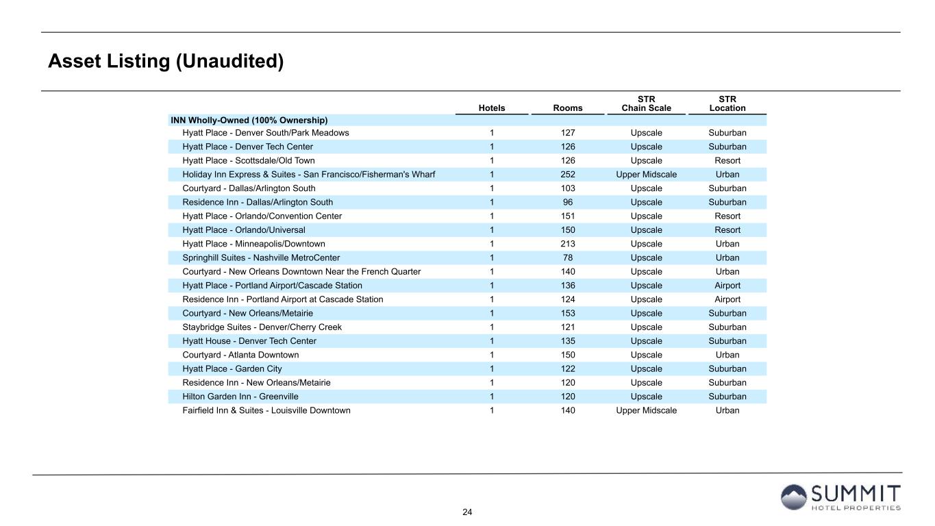 24 Asset Listing (Unaudited) Hotels Rooms STR Chain Scale STR Location INN Wholly-Owned (100% Ownership) Hyatt Place - Denver South/Park Meadows 1 127 Upscale Suburban Hyatt Place - Denver Tech Center 1 126 Upscale Suburban Hyatt Place - Scottsdale/Old Town 1 126 Upscale Resort Holiday Inn Express & Suites - San Francisco/Fisherman's Wharf 1 252 Upper Midscale Urban Courtyard - Dallas/Arlington South 1 103 Upscale Suburban Residence Inn - Dallas/Arlington South 1 96 Upscale Suburban Hyatt Place - Orlando/Convention Center 1 151 Upscale Resort Hyatt Place - Orlando/Universal 1 150 Upscale Resort Hyatt Place - Minneapolis/Downtown 1 213 Upscale Urban Springhill Suites - Nashville MetroCenter 1 78 Upscale Urban Courtyard - New Orleans Downtown Near the French Quarter 1 140 Upscale Urban Hyatt Place - Portland Airport/Cascade Station 1 136 Upscale Airport Residence Inn - Portland Airport at Cascade Station 1 124 Upscale Airport Courtyard - New Orleans/Metairie 1 153 Upscale Suburban Staybridge Suites - Denver/Cherry Creek 1 121 Upscale Suburban Hyatt House - Denver Tech Center 1 135 Upscale Suburban Courtyard - Atlanta Downtown 1 150 Upscale Urban Hyatt Place - Garden City 1 122 Upscale Suburban Residence Inn - New Orleans/Metairie 1 120 Upscale Suburban Hilton Garden Inn - Greenville 1 120 Upscale Suburban Fairfield Inn & Suites - Louisville Downtown 1 140 Upper Midscale Urban