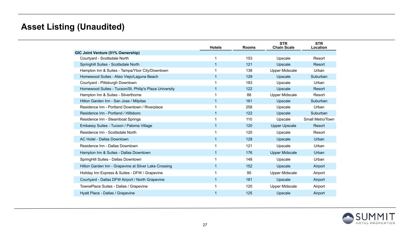 26 Asset Listing (Unaudited) Hotels Rooms STR Chain Scale STR Location INN Wholly-Owned (100% Ownership), (cont.) Courtyard - Charlotte City Center 1 182 Upscale Urban Hampton Inn & Suites - Baltimore Inner Harbor 1 116 Upper Midscale Urban Residence Inn - Baltimore Downtown/Inner Harbor 1 189 Upscale Urban Courtyard - Kansas City Country Club Plaza 1 123 Upscale Urban Courtyard - Fort Worth Downtown/Blackstone 1 203 Upscale Urban AC Hotel - Atlanta Downtown 1 255 Upscale Urban Hilton Garden Inn - Waltham 1 148 Upscale Suburban Residence Inn - Cleveland Downtown 1 175 Upscale Urban Courtyard - New Haven at Yale 1 207 Upscale Urban Residence Inn - Boston/Watertown 1 150 Upscale Suburban INN Wholly-Owned (100% Ownership) 53 8,546