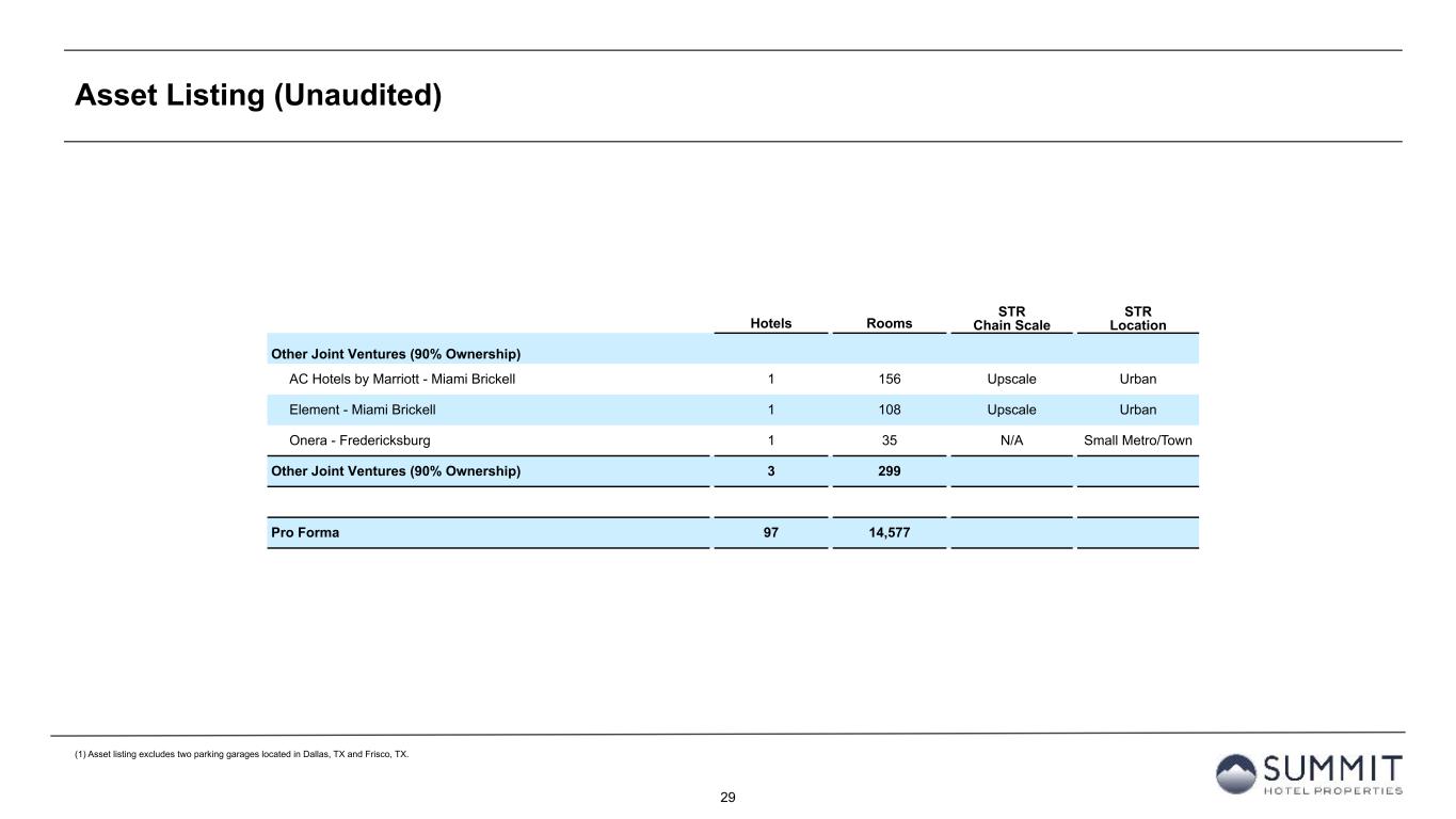 28 Asset Listing (Unaudited) Hotels Rooms STR Chain Scale STR Location GIC Joint Venture (51% Ownership) AC Hotel - Dallas / Frisco 1 150 Upscale Suburban Residence Inn - Dallas / Frisco 1 150 Upscale Suburban Canopy Hotel - Dallas / Frisco Station 1 150 Upper Upscale Suburban Residence Inn - Tyler 1 119 Upscale Small Metro/Town Hilton Garden Inn - Longview 1 122 Upscale Small Metro/Town AC Hotel - Houston Downtown 1 195 Upscale Urban Homewood Suites - Midland 1 118 Upscale Suburban Hyatt Place - Lubbock 1 125 Upscale Urban Courtyard - Amarillo Downtown 1 107 Upscale Urban Embassy Suites - Amarillo Downtown 1 226 Upper Upscale Urban AC Hotel - Oklahoma City / Bricktown 1 142 Upscale Urban Hyatt Place - Oklahoma City / Bricktown 1 134 Upscale Urban Holiday Inn Express & Suites - Oklahoma City Downtown / Bricktown 1 124 Upper Midscale Urban SpringHill Suites - New Orleans Downtown / Canal Street 1 74 Upscale Urban TownePlace Suites - New Orleans Downtown / Canal Street 1 105 Upper Midscale Urban Canopy Hotel - New Orleans Downtown 1 176 Upper Upscale Urban The Nordic Lodge - Steamboat Springs 1 45 Independent Small Metro/Town Hampton Inn Boston-Logan Airport 1 250 Upper Midscale Airport Hilton Garden Inn Tysons Corner 1 149 Upscale Urban GIC Joint Venture (51% Ownership) 41 5,732