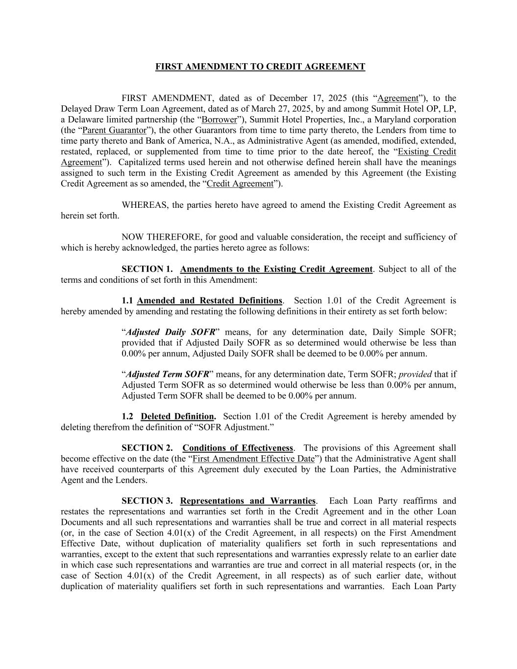 FIRST AMENDMENT TO CREDIT AGREEMENT FIRST AMENDMENT, dated as of December 17, 2025 (this “Agreement”), to the Delayed Draw Term Loan Agreement, dated as of March 27, 2025, by and among Summit Hotel OP, LP, a Delaware limited partnership (the “Borrower”), Summit Hotel Properties, Inc., a Maryland corporation (the “Parent Guarantor”), the other Guarantors from time to time party thereto, the Lenders from time to time party thereto and Bank of America, N.A., as Administrative Agent (as amended, modified, extended, restated, replaced, or supplemented from time to time prior to the date hereof, the “Existing Credit Agreement”). Capitalized terms used herein and not otherwise defined herein shall have the meanings assigned to such term in the Existing Credit Agreement as amended by this Agreement (the Existing Credit Agreement as so amended, the “Credit Agreement”). WHEREAS, the parties hereto have agreed to amend the Existing Credit Agreement as herein set forth. NOW THEREFORE, for good and valuable consideration, the receipt and sufficiency of which is hereby acknowledged, the parties hereto agree as follows: SECTION 1. Amendments to the Existing Credit Agreement. Subject to all of the terms and conditions of set forth in this Amendment: 1.1 Amended and Restated Definitions. Section 1.01 of the Credit Agreement is hereby amended by amending and restating the following definitions in their entirety as set forth below: “Adjusted Daily SOFR” means, for any determination date, Daily Simple SOFR; provided that if Adjusted Daily SOFR as so determined would otherwise be less than 0.00% per annum, Adjusted Daily SOFR shall be deemed to be 0.00% per annum. “Adjusted Term SOFR” means, for any determination date, Term SOFR; provided that if Adjusted Term SOFR as so determined would otherwise be less than 0.00% per annum, Adjusted Term SOFR shall be deemed to be 0.00% per annum. 1.2 Deleted Definition. Section 1.01 of the Credit Agreement is hereby amended by deleting therefrom the definition of “SOFR Adjustment.” SECTION 2. Conditions of Effectiveness. The provisions of this Agreement shall become effective on the date (the “First Amendment Effective Date”) that the Administrative Agent shall have received counterparts of this Agreement duly executed by the Loan Parties, the Administrative Agent and the Lenders. SECTION 3. Representations and Warranties. Each Loan Party reaffirms and restates the representations and warranties set forth in the Credit Agreement and in the other Loan Documents and all such representations and warranties shall be true and correct in all material respects (or, in the case of Section 4.01(x) of the Credit Agreement, in all respects) on the First Amendment Effective Date, without duplication of materiality qualifiers set forth in such representations and warranties, except to the extent that such representations and warranties expressly relate to an earlier date in which case such representations and warranties are true and correct in all material respects (or, in the case of Section 4.01(x) of the Credit Agreement, in all respects) as of such earlier date, without duplication of materiality qualifiers set forth in such representations and warranties. Each Loan Party